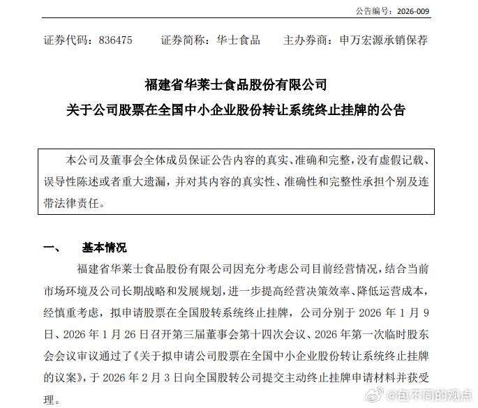 2026年2月11日,福建省华莱士食品股份有限公司(简称“华士食品”)发布《关于公司股票在全国中小企业股份转让系统终止挂牌的公告》,宣告公司正式完成新三板摘牌,股票自2026年2月12日起终止在全国中小企业股份转让系统挂牌,结束其近十年的上市历程。华莱士退市华莱士