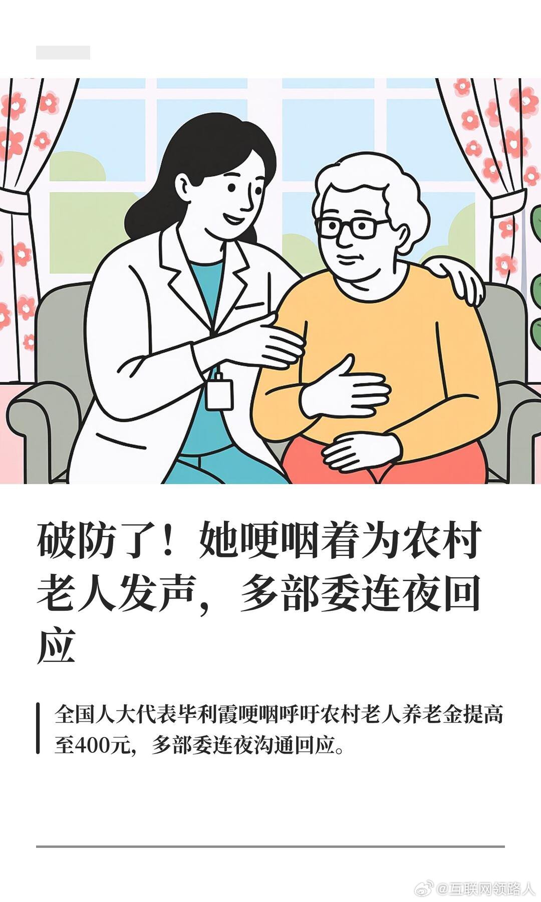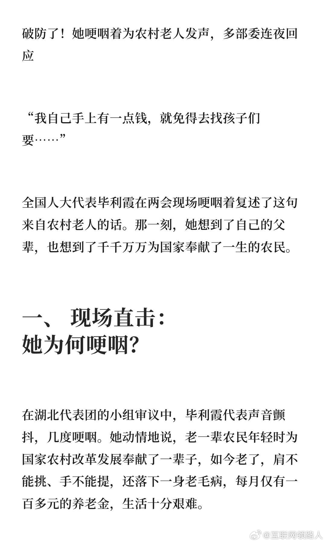 为农民哽咽发声代表接到多部委电话毕代表真的说到心坎里了!农村老人一辈子奉献,老了就靠一百多块养老金太难了。建议提到400块太实在,还被部委重视沟通,太暖心。这才是接地气的好代表,真心为老人发声!