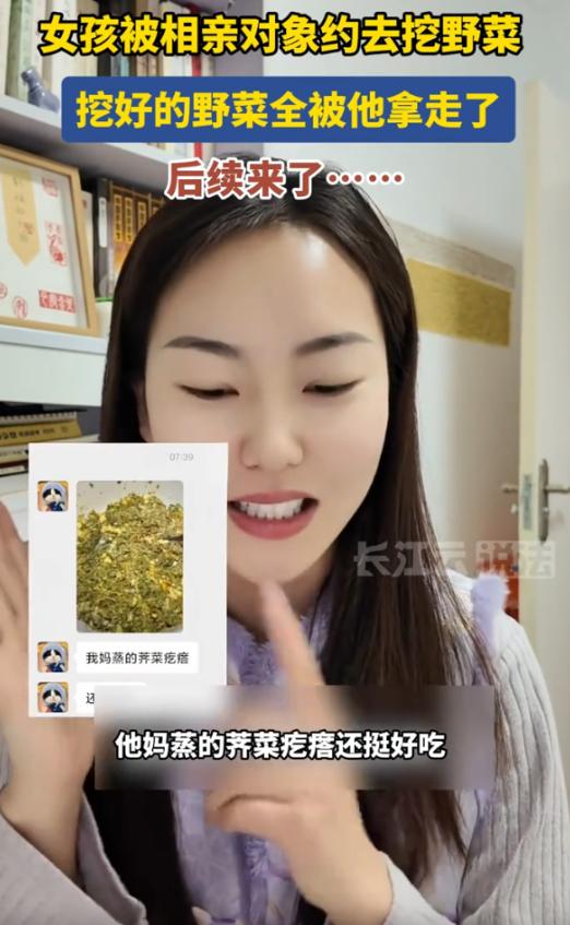这情商堪忧!陕西咸阳,一女孩和男生相亲,出门时打扮的美美的,结果却被对方拉去挖野菜,关键是对方还把挖好的野菜全部带走,做好后还跟她炫耀了一番,网友:这能找到对象都怪了。 事情是这样的,女孩通过别人介绍,和男生在线上先聊了一段时间,男生平时说话总是一副崇尚简朴、偏爱自然的样子,还经常说自己喜欢踏实过日子,不追求虚头巴脑的东西,女孩听着觉得很靠谱,以为自己遇到了知音,心里也生出了几分期待,盼着见面能好好聊聊,说不定就能找到合适的婚姻良配。 为了这场初次见面,女孩可是花了不少心思,算是下了不少沉没成本。她特意挑选了合适的衣服,化了淡淡的妆容,把自己打扮得美美的,既体面又大方,她从来没奢求过什么浪漫的约会场景,只想着两人能坐下来,安安静静地聊聊天,互相了解一下,毕竟是奔着找对象去的,谁也不想太潦草、太随意。 可谁能想到见面之后的走向,完全超出了女孩的预料,甚至可以说是荒唐。本来两人约好了见面的地方,结果男生却单方面改了主意,没带她去任何体面的场所,反而从车上拿出了塑料袋和小铲子,拉着她往远郊的田垄走去,还美其名曰“天气好,挖点野菜回家,既健康又省钱”。 女孩当场就愣住了,她身上的打扮根本不适合蹲在田埂上挖野菜,脚下的鞋子很快就沾满了泥土,弄得脏兮兮的,可毕竟是初次见面,碍于情面她也不好直接拒绝,只能硬着头皮陪在男生身边,看着他忙活,自己却手足无措,连插手的机会都没有。 整个过程中男生完全沉浸在自己的世界里,全程专注于挖野菜,熟门熟路地分辨着哪些野菜能吃,蹲在地上埋头忙活,一刻也不停歇,偶尔抬头也只是兴奋地展示自己挖到的野菜,满脸都是成就感,完全没有留意到女孩的局促和不适,也没有和女孩说几句话,原本该有的相亲交流,硬生生变成了一场无声的田间劳作。 女孩站在一旁,手里攥着空塑料袋,看着男生熟练的动作,心里满是无奈和尴尬,她就像一个被遗忘的工具人,只能沉默地站在原地,看着男生独自“收获”,那种近距离相处却无比疏远的感觉,让她心里很不是滋味,也慢慢看清了男生的自私。 挖完野菜之后,男生把满满一袋野菜全部自己收了起来,连一根都没提过分给女孩,仿佛女孩只是来陪他干活的,根本没有资格分享他的“劳动成果”,女孩心里虽然有很大的落差,觉得自己受到了忽视,但出于成年人的体面,她还是忍住了没有发火,甚至还试着安慰自己,觉得男生可能只是太实在、不懂人情世故。 可让她万万没想到的是,相亲结束后没多久,她就收到了男生发来的消息,还附带了一张照片,一碗做好的野菜,男生还特意告诉她,这是他妈妈做的味道特别好,全程没有一句客气话,没有邀请她一起品尝,满满的都是炫耀,仿佛这场相亲的意义,就是找个人陪他挖野菜,再向她展示自己的收获。 那一刻女孩满心的期待,彻底变成了无语和失望,这场相亲她收获的只有一身泥土、满心尴尬,还有被忽视的委屈,而男生却得意于自己挖到的野菜和家里的美味,完全没有意识到自己的做法有多么不妥,情商低得让人无奈。 后来女孩把这件事分享到了网上,很快就引来了很多网友的围观和吐槽,网友们纷纷调侃,这哪里是找对象,分明是找免费帮工,连最基本的尊重都没有,还有网友直言:“这情商,能找到对象才怪了!” 其实大家并不是仇视接地气,挖野菜本身也不是什么坏事,真正让人反感的,是男生的态度。他忽略女孩的感受,独占两人一起付出时间换来的成果,还毫无察觉地炫耀,细节里全是自私和低情商。 相亲的核心从来不是形式,而是彼此的体谅和尊重,哪怕约在田间地头,只要心里装着对方,也能让人感受到诚意,而这位男生却用一场荒唐的约会,浇灭了所有可能,也难怪网友会吐槽他找不到对象。