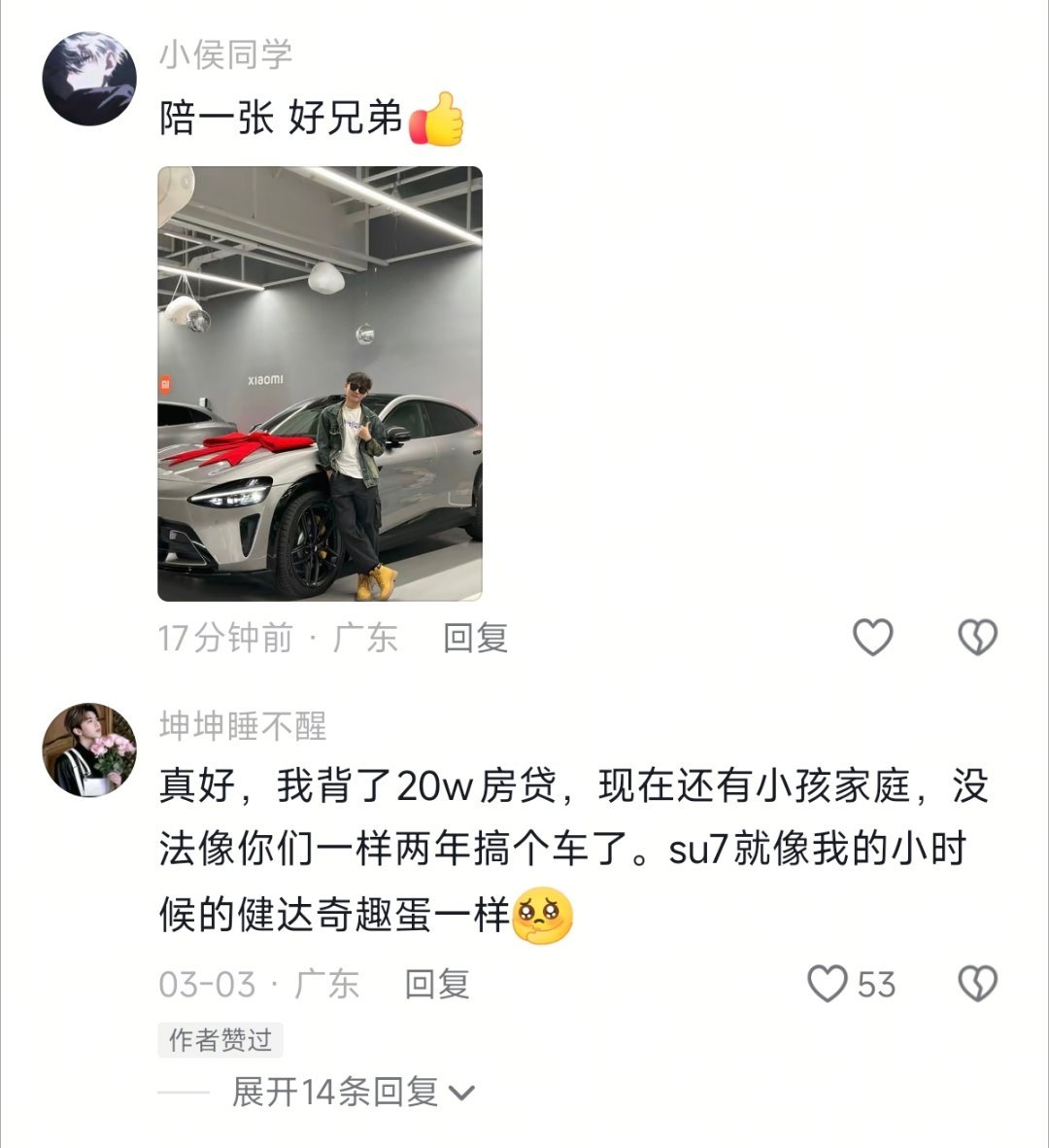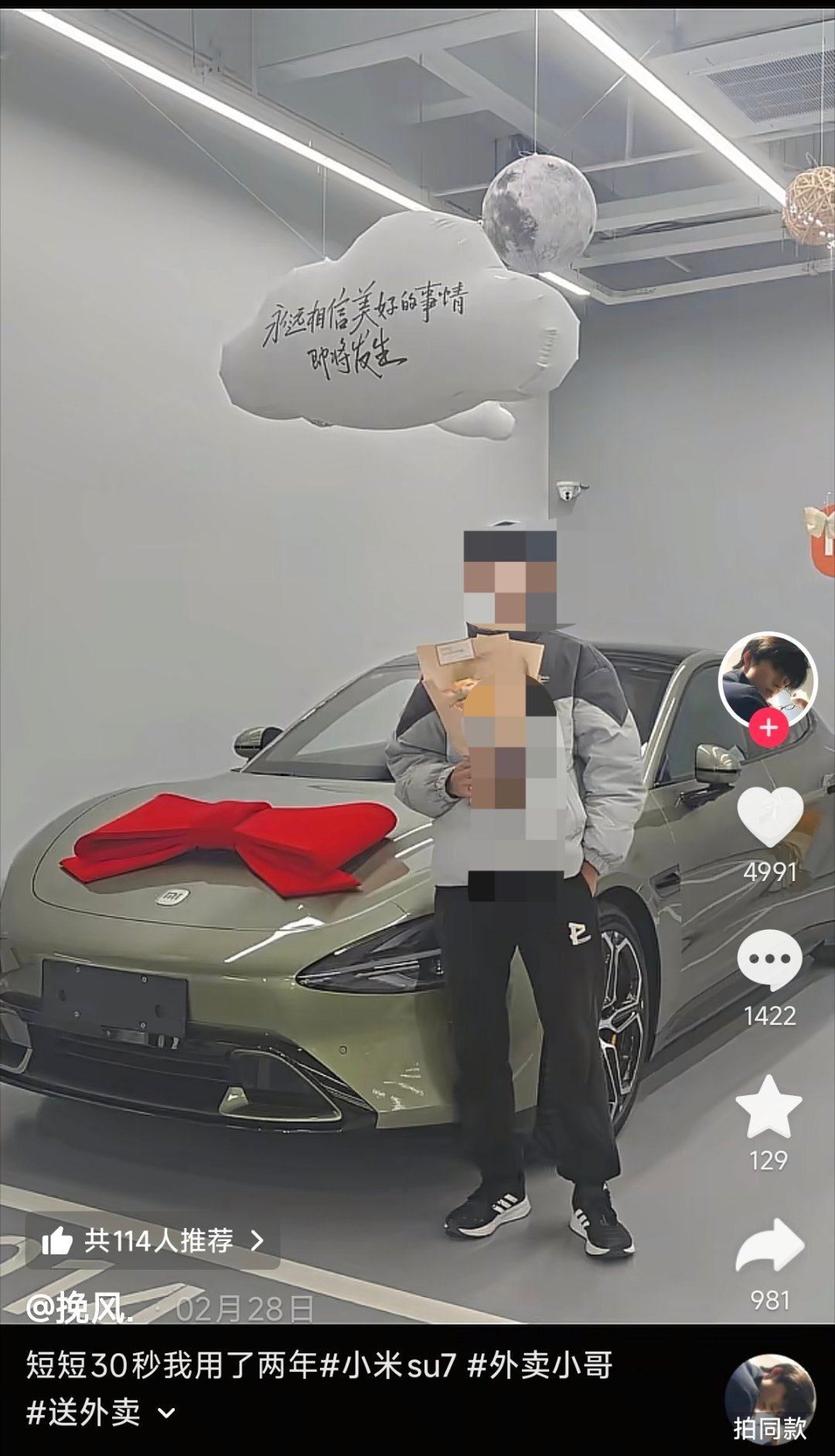 评论区网友送上祝福,车主陪一张,甚至还有位车主也是通过送外卖提了一辆SU7,