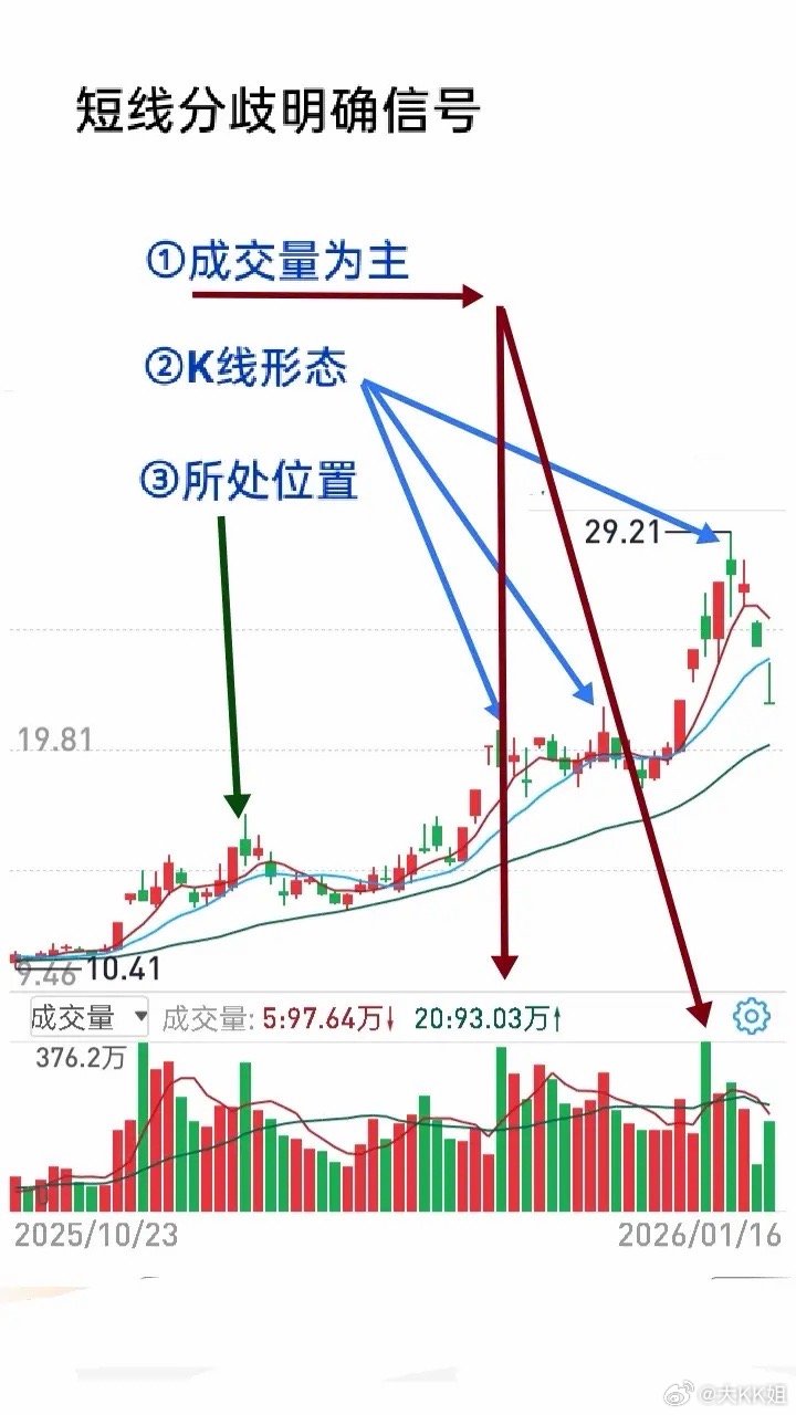 做短线判断顶部,不用太纠结射击之星、乌云盖顶这些K线形态,关键只看两个:成交量 + 股价。