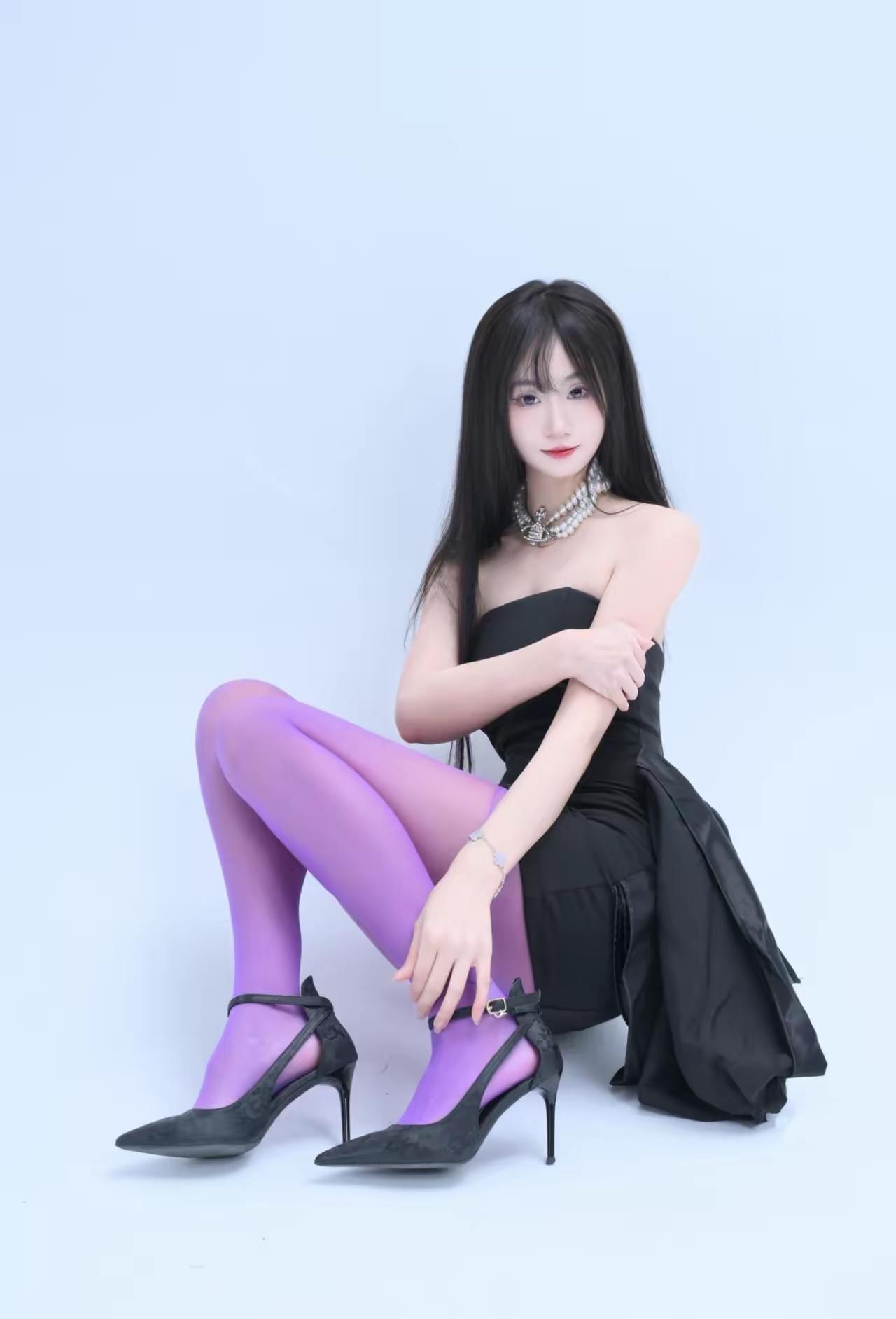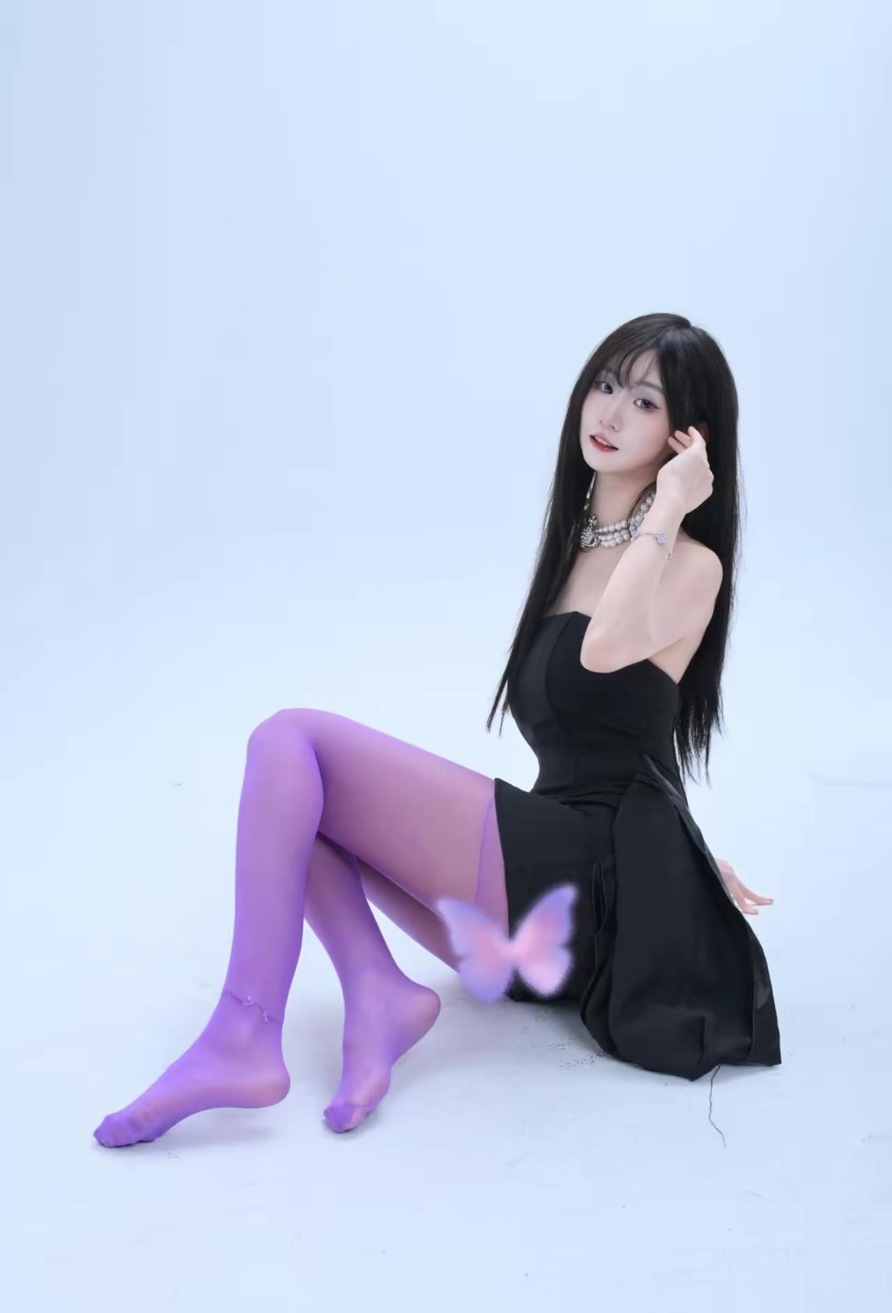 甜美少女风,紫色丝袜搭配黑色礼服,梦幻蝴蝶飞舞,优雅动人。