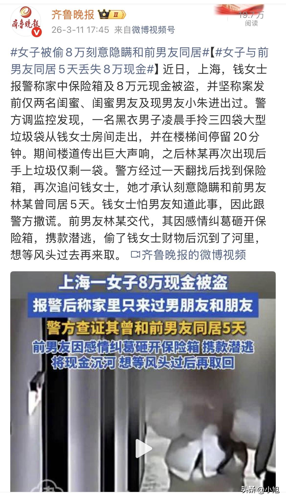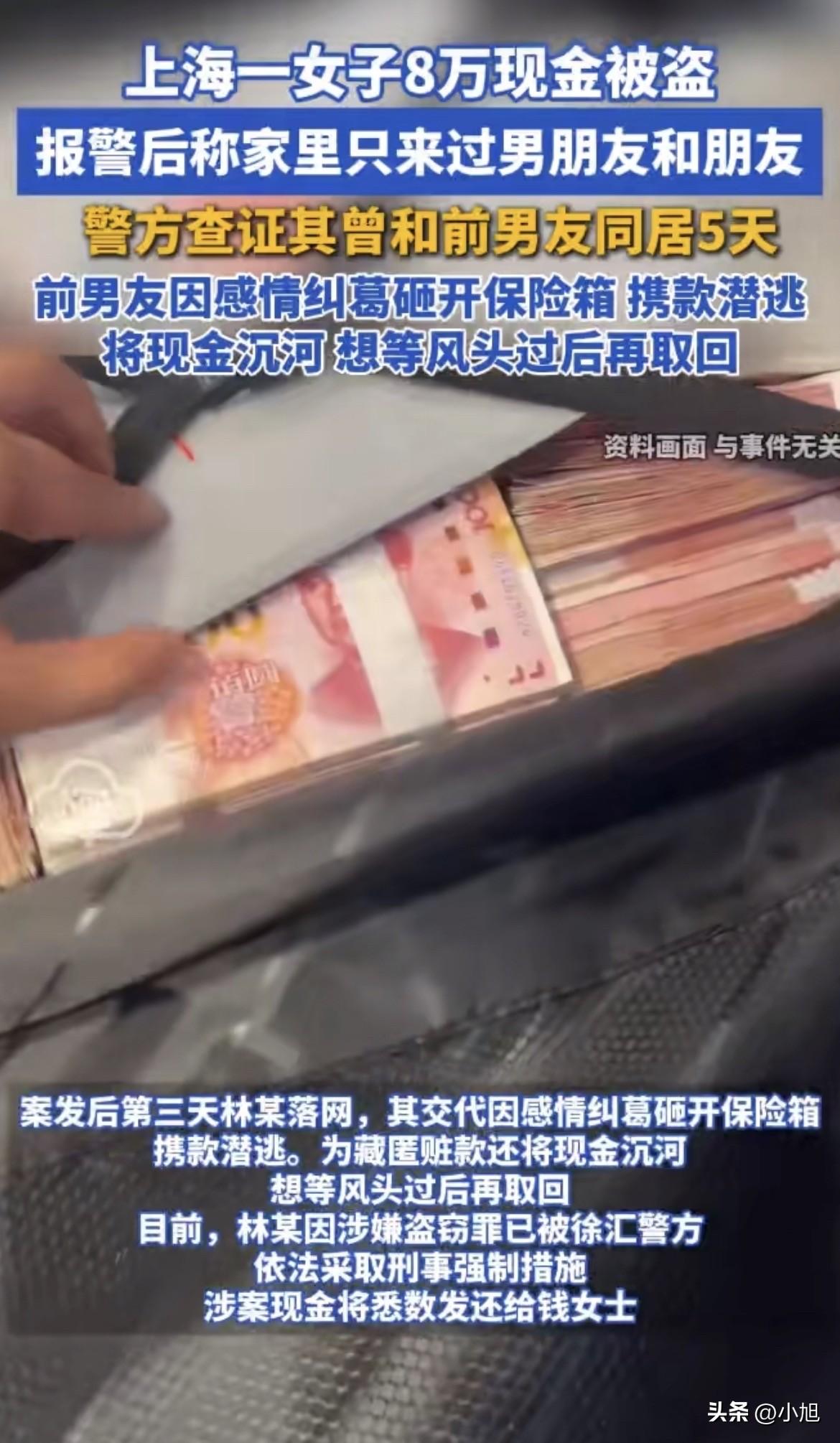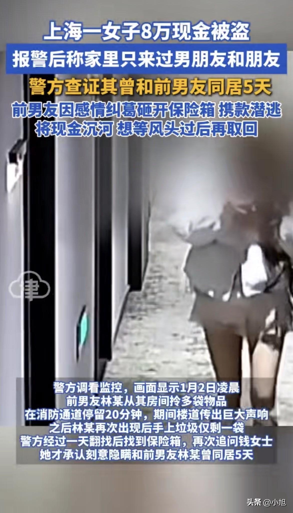 上海一姑娘半夜哭着报警,说自己藏在衣柜深处的保险箱被人连锅端了,里面八万三千多块现金全没了。 姑娘跟警察哭得稀里哗啦,说这钱是父母给的生活费,自己攒了好久。她还掏出手机给警察看了一张照片,是2025年12月31号凌晨拍的,把钱放进保险箱之前留了个证据。照片里那一沓现金堆得老高,其中有一张破了的残币特别显眼,谁能想到这张破钱后来成了破案的关键。 警察到现场一看,门锁好好的,窗户也没被撬过的痕迹,外墙也爬不进去,这明显是熟人干的啊。就问姑娘,最近都有谁来过她房间。 姑娘拍着胸脯保证,就五个人:两个闺蜜,闺蜜的男朋友,还有自己的现男友小朱。她斩钉截铁地说,绝对没别人了,这几个人走的时候两手空空,啥也没拿。监控也看了,确实没毛病。 可这贼能把保险箱抱走,还对屋里情况这么熟,不可能是一般的小偷。民警心里犯嘀咕,这姑娘是不是瞒着啥没说?又问了一遍,姑娘还是那话:真没别人了。 警察不放心,把从12月31号到1月2号案发时的监控全调了出来,一帧一帧地看。这一看,看出问题了——除了那五个人,还真有第六个人进去过! 画面里,1月2号凌晨1点01分,一个穿黑衣服的年轻男的从姑娘房间出来,手里拎着三四袋大垃圾袋。他没直接下楼,而是跑到7楼到6楼的消防通道里,待了整整20分钟不走。 监控听不见声,但那会儿楼道里传出过特别大的动静。过了20分钟,这男的再出现的时候,手里就剩一袋子了,把那一袋扔进6楼垃圾桶就走了。 警察一看这不对劲,立马去公寓的垃圾回收站翻。翻了一整天,1月3号下午,还真在垃圾堆里把那保险箱给刨出来了。 保险箱都找到了,姑娘这才瞒不住了。她支支吾吾地说,那男的是她前男友林某,其实从2025年12月28号开始,俩人在一块同居了五天。这段时间,现男友和闺蜜们来的时候,前男友就躲在屋里没出来。她怕现男友知道了误会,就一直瞒着,连警察都没敢说。 可光知道是谁没用,得证明钱是他拿的呀。这时候姑娘之前拍的那张照片派上用场了。警察一查,林某案发当晚就打车逃回太仓老家了,凌晨到了以后还去网吧上网。 结账的时候,他掏出来的钱里有一张是用透明胶带粘起来的破币。网吧收的钱,跟姑娘照片里那张残币一比对,一模一样!这就是被盗的那张! 案发后第三天,1月5号上午,林某在太仓老家被抓了。他倒是全交代了,说俩人分手后他心里一直不痛快,借宿那几天越想越气,趁姑娘睡着了,把保险箱砸开抱着钱就跑。 这钱他不敢花,又想了个自认为挺聪明的招,用黑塑料袋包好,拴上绳子,拿石头压沉到村子边上的小河里了,想着等风头过了再捞出来。警察按他指的地方,大冷天下河打捞,还真把钱全捞上来了。 姑娘之前丢过六千多,就是因为不放心才买的保险箱,结果还是没防住。现在钱追回来了,前男友也被抓了,可这事怎么看怎么别扭。明明她是受害者,就因为跟前男友还有这么一出不敢跟现任说,差点把警察查案都给带沟里去。她为了瞒着现任男朋友,连破案线索都敢瞒。 最讽刺的是什么?她最怕现任知道的那件事,最后全国人民都知道了。 这事你怎么看?