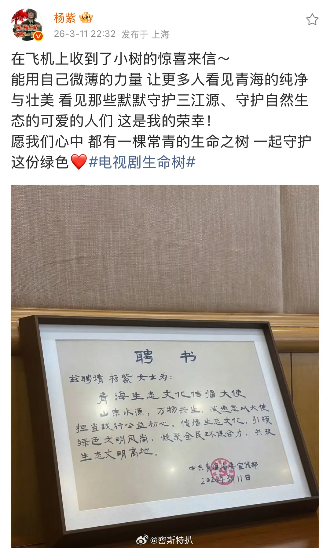 恭喜杨紫被青海聘请为生态文化传播大使优秀的演员和高质量的好作品带来的社会影响力,这就是杨紫的口碑和业内认可度!🎉🎉🎉