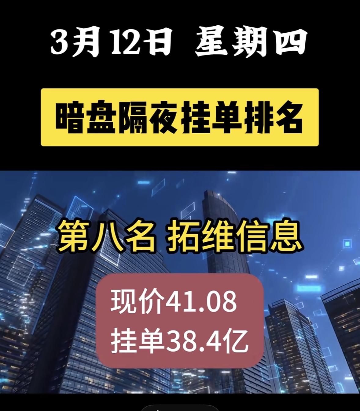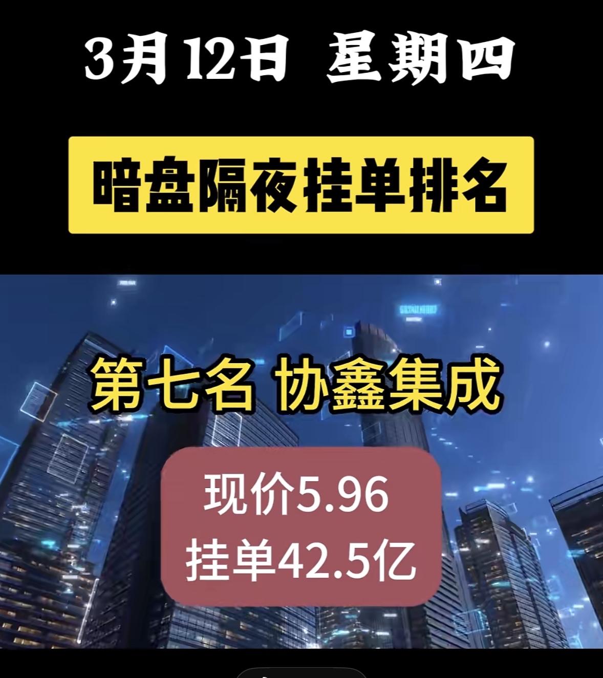 3月12日暗盘隔夜挂单排名揭晓。 协鑫集成现价5.96,挂单42.5亿。回顾之前,3月11日它现价6.07元,挂单48.87亿,涉及光伏等新能源领域,当时新能源板块热度回升,资金布局合理。再往前,3月10日协鑫集成现价5.78,买单79.76亿,卖单34.35亿。从这几天数据看,挂单金额有变化,价格也有波动。光伏板块受行业政策、原材料价格等影响大,协鑫集成后续走势还得持续关注,它在资金暗盘关注方向里的表现值得琢磨。