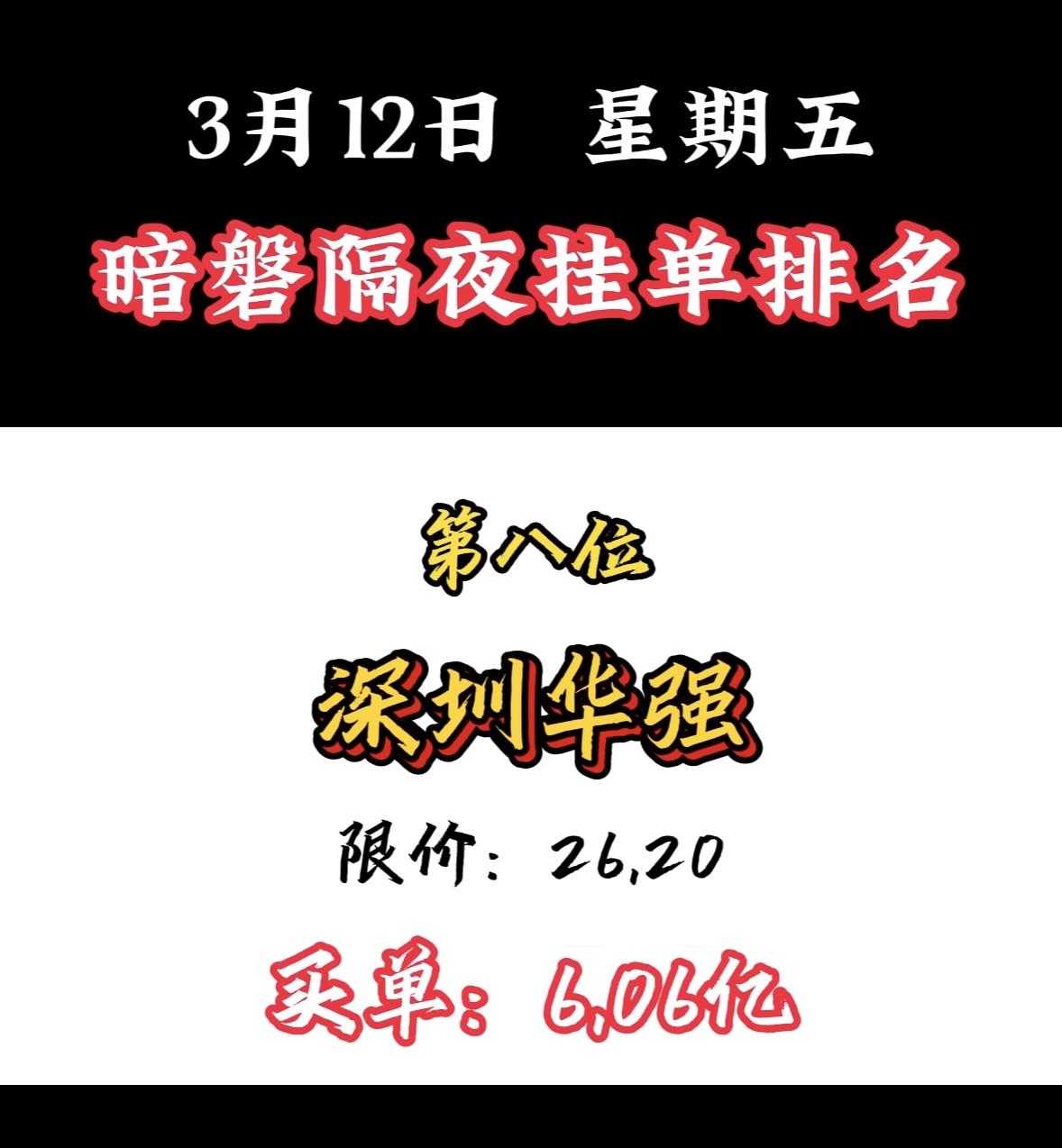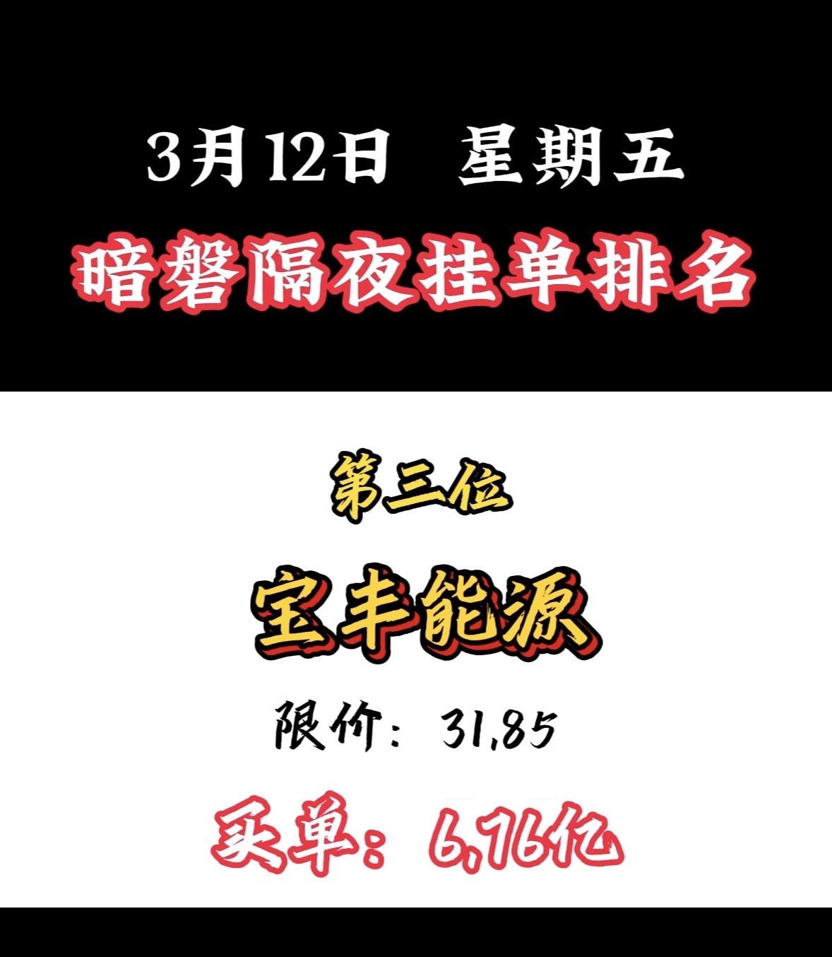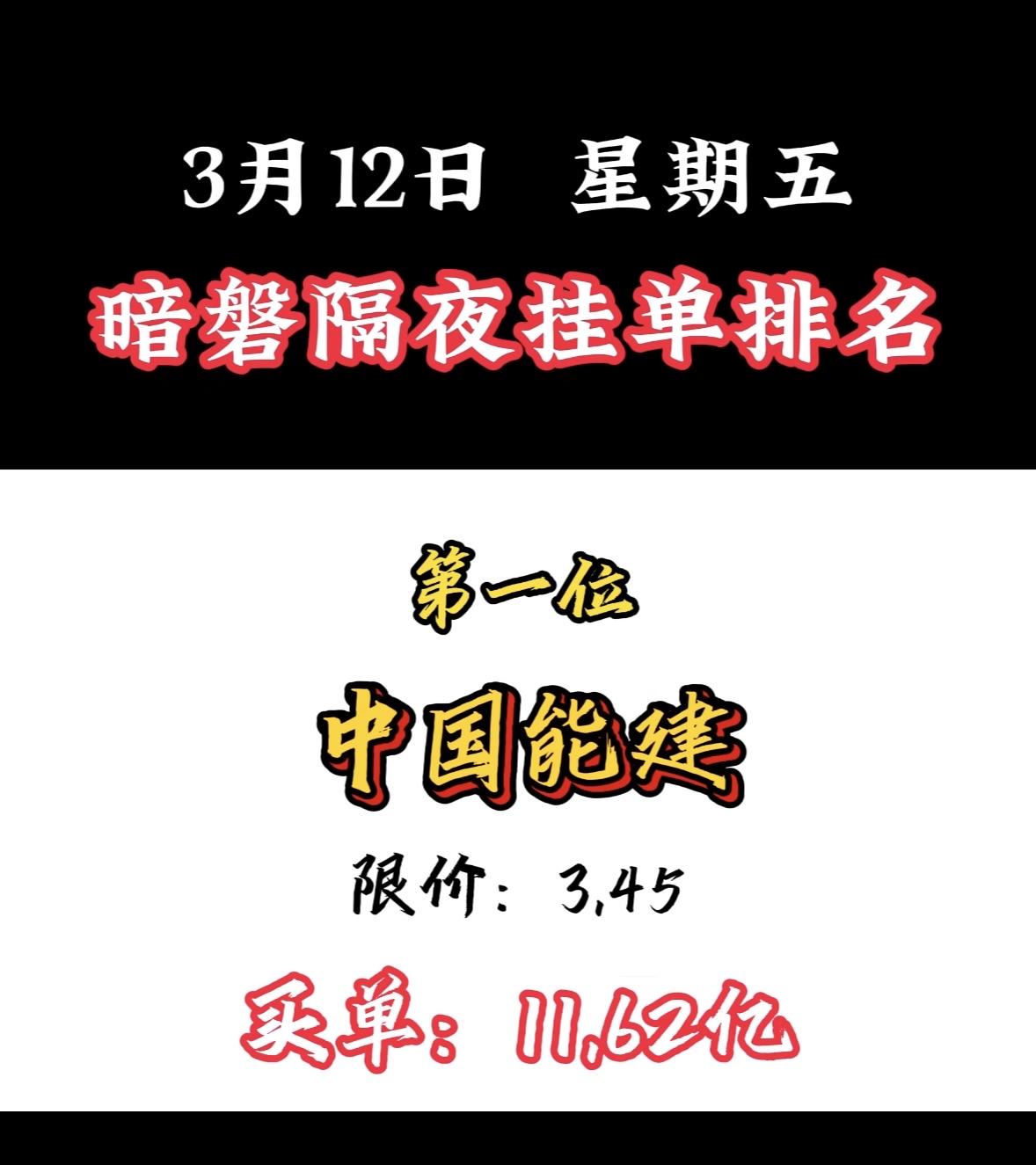 3月12日暗盘隔夜挂单个股揭晓 3月12日,中国能建以11.62亿订单夺冠,太牛了!最近A股走弱,热点轮动快,而中国能建逆势走强。3月9日成交额达98.12亿,换手率超10%;3月10日早盘发力,半日成交超80亿,主力资金净流入超6亿。 它可是能源基建国家队,实控人是国务院国资委,控股股东持股45.21%。在特高压勘察设计市场份额超90%,水电、火电、核电建设市占率也居前列。能源强国战略下,行业景气度高,中国能建未来可期!