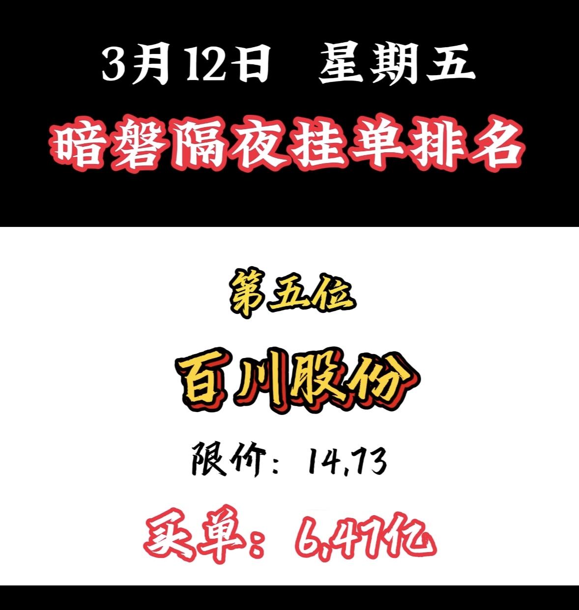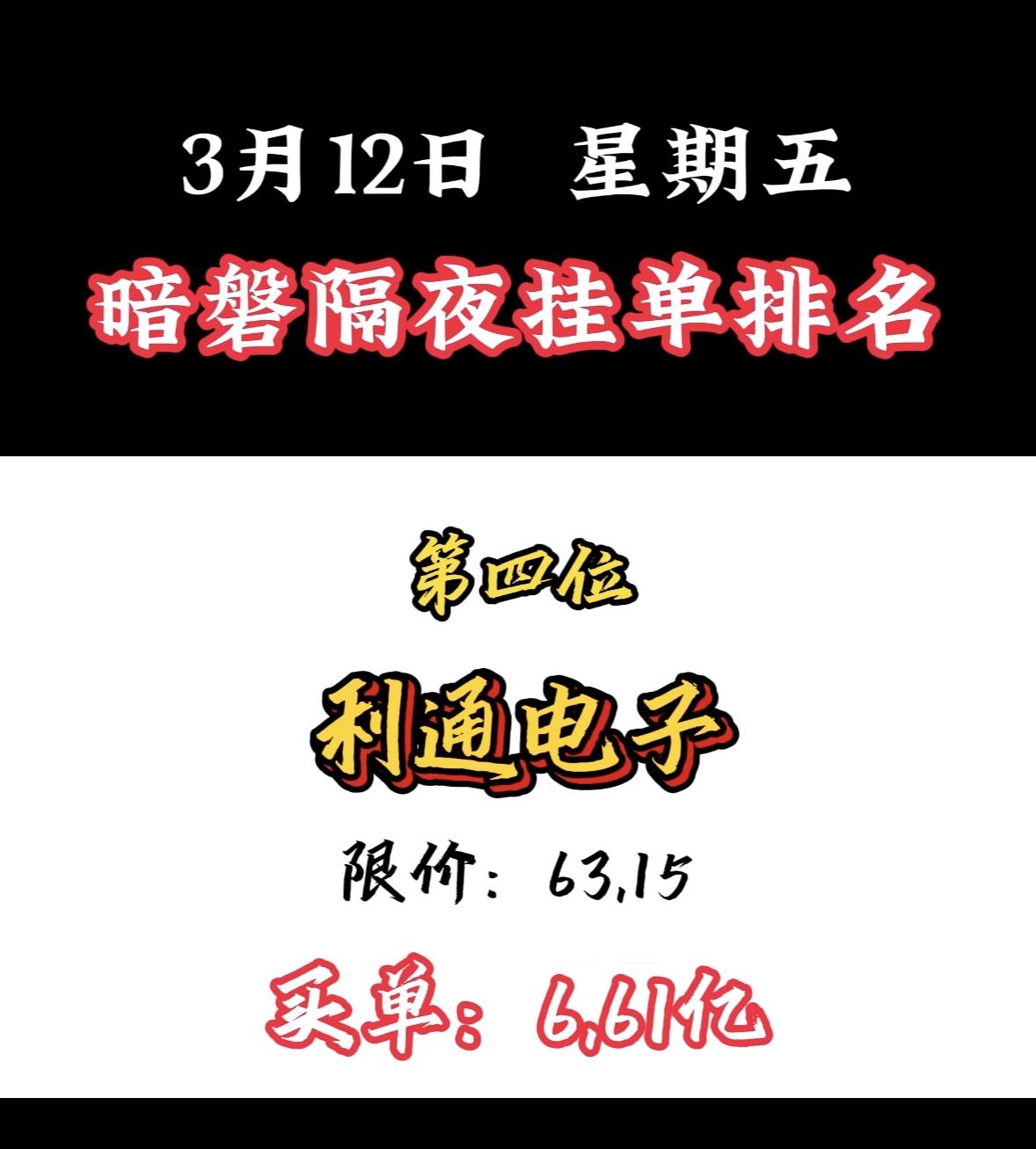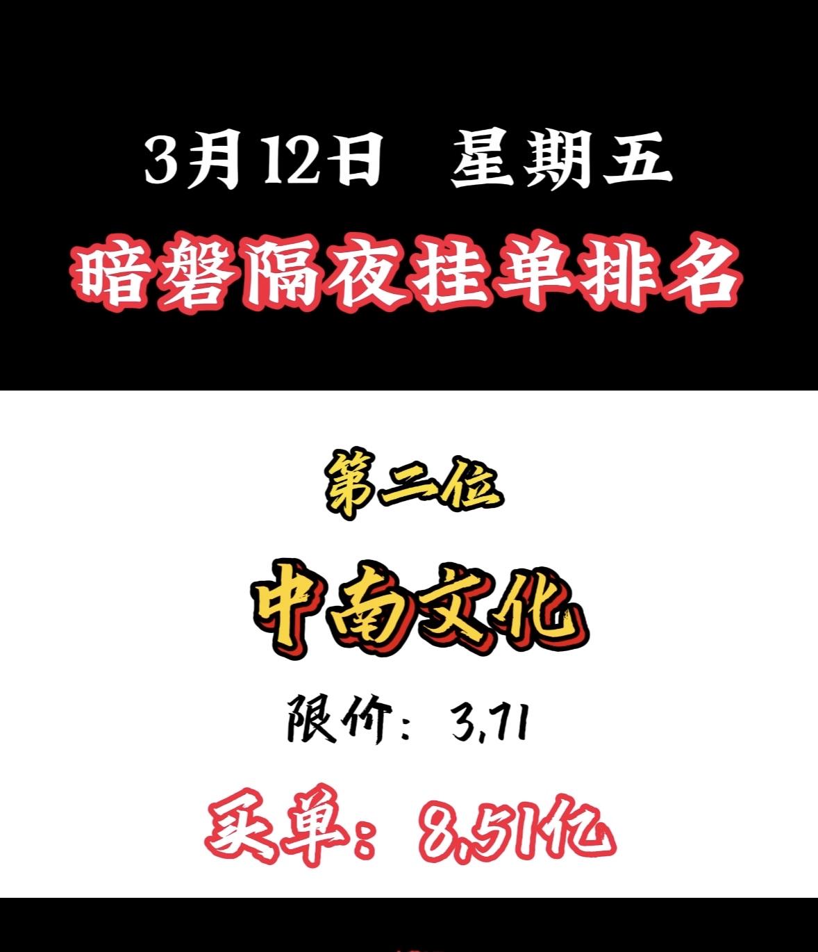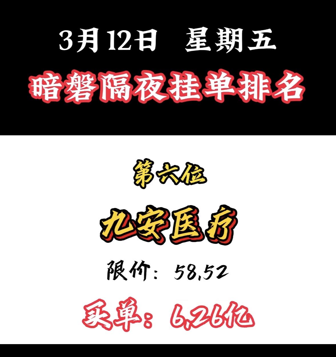 3月12日暗盘隔夜挂单个股揭晓 3月12日,中国能建以11.62亿订单夺冠,太牛了!最近A股走弱,热点轮动快,而中国能建逆势走强。3月9日成交额达98.12亿,换手率超10%;3月10日早盘发力,半日成交超80亿,主力资金净流入超6亿。 它可是能源基建国家队,实控人是国务院国资委,控股股东持股45.21%。在特高压勘察设计市场份额超90%,水电、火电、核电建设市占率也居前列。能源强国战略下,行业景气度高,中国能建未来可期!