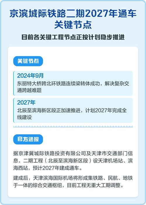 天津人等了8年的高铁,真的要“鸽”了吗? 近期,天津高铁建设进展引发广泛关注。根据京津冀城际铁路投资有限公司天津工程指挥部高级工程师王金胜在2024年11月的表态,“京滨城际全线将于2027年底开通”,北方网等权威媒体亦多次引用这一时间节点。然而,天津市交通委在2026年3月的最新回应中,仅明确“津潍高铁2027年通车”,对京滨城际二期的表述转为“加速推进”,未再提及具体时间。这一变化让公众对京滨城际能否如期通车产生疑问。 京滨城际铁路是京津冀交通一体化的核心工程,全线169公里,分三段建设:北段(北京副中心至宝坻站)和中段(宝坻至北辰站)已分别于2022年12月通车;南段(北辰至滨海西站)为当前建设重点,设天津机场站、滨海西站两座车站,总投资约238.1亿元。截至2026年3月,天津机场1号隧道、滨海特大桥等关键工程已贯通或合龙,但天津机场2号隧道预计2025年8月贯通,整体施工仍需攻克技术难题。 从区域发展看,京滨城际全线贯通后,北京副中心至天津滨海新区的通行时间将缩短至约1小时,天津机场站更将成为全国首个空铁无缝衔接的高铁枢纽。然而,若南段工程因技术或资金问题延迟,不仅影响京津冀“一小时通勤圈”构建,还可能削弱天津滨海新区作为区域枢纽的竞争力。 目前,天津市交通委未调整京滨城际的通车目标,但“加速推进”的表述留出弹性空间。公众需持续关注官方动态,理性看待工程复杂性——高铁建设涉及技术、安全、协调等多重挑战,时间调整在大型基建项目中并不罕见。