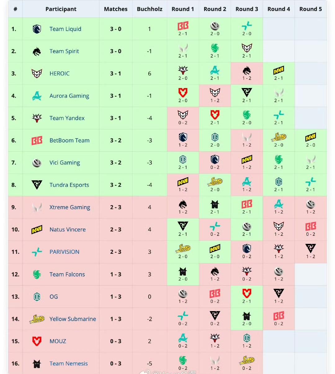 PGL瑞士轮第五天赛果 VG 2:1 XG,劣势打不过,优势被翻盘,好好总结,休息一下,打太久了,打好下一个比赛吧,XG。 目前XG排名第九,赢的队伍都被淘汰,输的队伍都晋级八强。 同样BB比较轻松战胜NV,石头人险胜PARI。 今天淘汰赛VG将对阵雪碧,如果输了败者组将对阵BB和Heroic的败者,感觉进入六强还是比较有机会的。