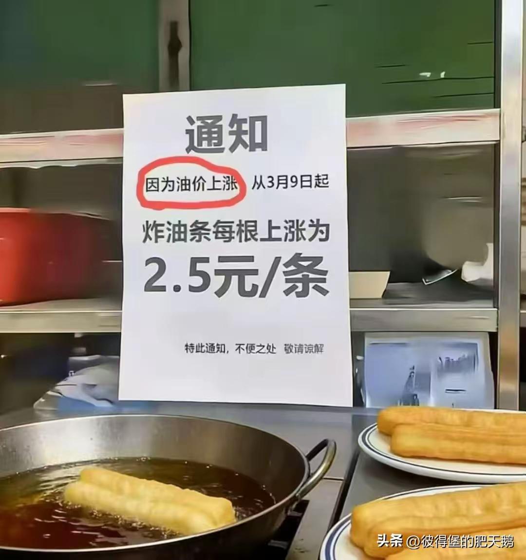 第一眼看到这个卖油条的早点店铺贴出的通知,我也没想明白。 油价上涨跟你有啥关系,油条也跟着涨价?你早点摊炸油条,用的是食用油,又不是石油,起什么哄呢? 后来想了想,我终于明白了这位早点店铺老板油条涨价的底层逻辑。 近日,美以和伊朗交火,一气之下伊朗封锁了霍尔木兹海峡,这还了得,麻烦紧接着就来了。 霍尔木兹海峡是能源海运的咽喉要道,年经过该海峡运送的油品数量日均约2000万桶,约占全球日消费的20%。 受其影响,国际油价已经开始上涨,比如从3月10日起,国内92号汽油,每升上涨五毛多,封锁霍尔木兹海峡的效果立竿见影。 由于油价上涨,运输成本会涨,食用油的价格涨,油条生产制作的成本上涨,所以油条价格也得上涨。 看样子,这位早点店铺卖油条的老板是个聪明人,道理想的明明白白,算盘打得啪啪响。