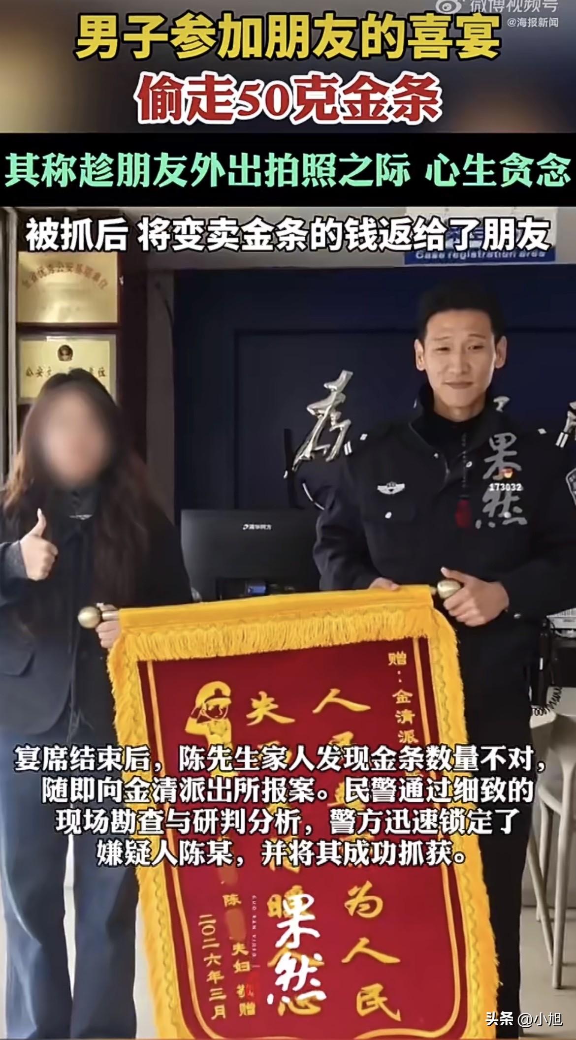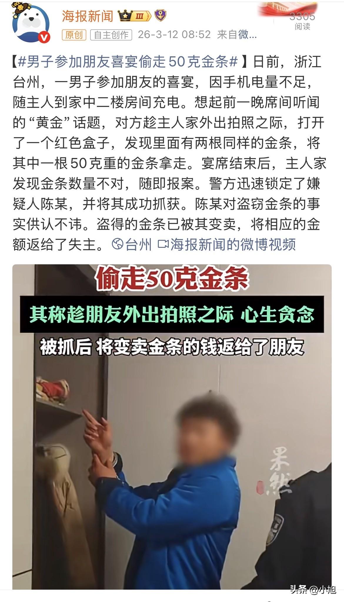 浙江台州路桥。陈先生家里办喜宴,热热闹闹的,朋友来了一屋子。有个朋友陈某,吃着饭说手机没电了,陈先生压根没多想,直接领着他上二楼自己房间充电。多正常一事儿,朋友嘛。 可据金清派出所民警管秦宇后来办案时了解,陈某这心里头,早就不太正常。他想起前一晚酒桌上,有人闲聊天说过一嘴,陈先生家最近得了金条。这话当时可能就是随口那么一说,大家听过就算。但在陈某这儿,算是扎了根了。 陈先生安顿好他,转身就下楼接着招呼客人去了。屋里就剩陈某一个人,对着插座充电。他眼睛在屋里扫了一圈,很快盯上那个显眼的红色盒子。打开一看,里头躺着两根金条,一模一样的,50克一根。 这时候,他干了件让所有人都琢磨不透的事儿——他没把两根都拿走,就抽了一根,然后把盒子盖好,原样放回去。 楼下推杯换盏,欢声笑语。他把那根金条往兜里一揣,没事人一样下楼接着吃喝。谁也没看出来。 宴席散了,主人家收拾东西。陈先生家人打开那个红盒子,愣在那儿了——明明记得是两根,怎么就剩一根了? 家里没进过外人,这贼肯定在今天的客人里。马上报警。 民警来得快,现场一看就明白了,门窗好好的,没撬过的痕迹,这是熟人作案。再一问,谁单独上过楼?就陈某一个。 找到陈某的时候,他脸色当场就变了。没扛多久,全交代了。金条早让他卖了换钱。 最讽刺的一幕发生在派出所。在民警调解下,陈某把卖金条的钱,一分不少退给了陈先生。钱回来了,损失挽回了。陈先生两口子给派出所送了锦旗。 这事好像就这么结了。 但真能结得了吗? 那个只偷一根的细节,越想越让人后背发凉。他要是贪心,两根全拿走,主人家开门一看盒子空了,当场就得炸锅,马上报警。他只拿一根,是想赌一把——少一根,主人家万一是记错了呢?万一以为放别处了呢? 这种"克制",比贪心更可怕。贪心很多时候是冲动,是脑子一热,是鬼迷心窍。但他这种"留一手",是清醒地在算计,是在衡量风险和收益之后,做出的"最优选择"。他在那一瞬间,脑子里把各种可能性都过了一遍,最后选了自认为最聪明的那条路。 他什么都想到了,就是没想到,现在的金条都有票据,谁家丢了东西第一反应都是报警。警察来了挨个查谁单独离开过,太简单了。 一个聪明人,算计了半天,把自己算进了派出所。 再说那个充电。手机没电,也许是真没电,也许只是个借口。但借着充电的机会上楼,确实给了他最正当的理由和最充足的时间。这个借口,他可能前一天晚上听到"黄金"两个字的时候,就已经想好了。 据钱江晚报和路桥公安发布的消息,目前案件正在进一步办理中。但这事在当地朋友圈里,估计早就传遍了。 以后逢年过节,亲戚朋友凑一块儿,说起这茬,陈家人心里什么滋味?陈某那个圈子里的朋友,以后谁还敢让他上家里坐坐? 钱是退了,案子结了,可朋友这两个字,在这根金条面前,算是彻底碎了。 他偷走的不是50克黄金,按现在的金价,两万多块吧。但他搭进去的,是自己在这个圈子里几十年的脸面和人缘。 这笔账,不知道他算清楚没有。 如果是你,遇到这种事,这朋友还能处吗?