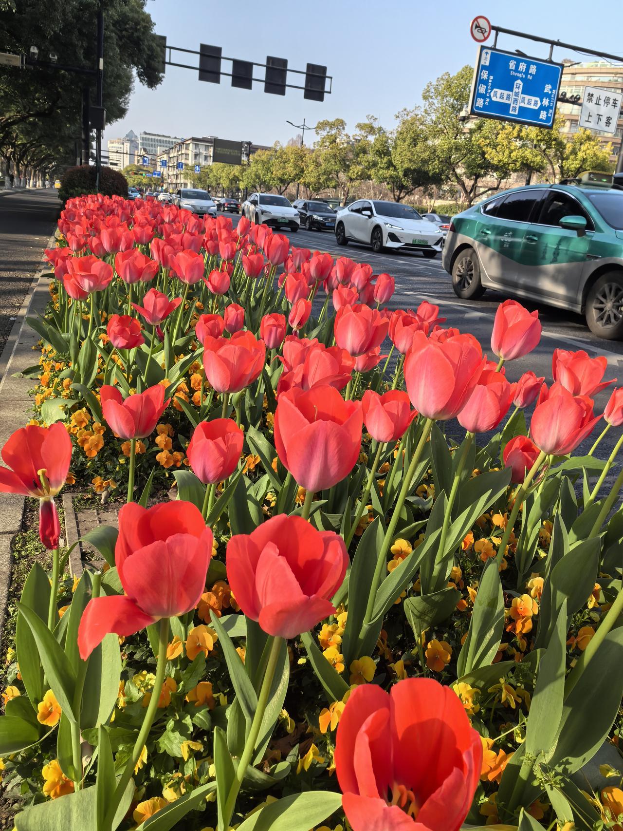 看到了“美到可以让你原地结婚”的绿化带,你知道这个梗吗? 来到杭州,专门去看了被网友和人民日报带火的杭州绿化带的美丽花海,郁金香,紫罗兰,角堇时令花卉竞相怒放,点燃了杭城春日靓丽的色彩。 面对这美艳得不可方物的鲜花,市民和网友感叹“美到可以原地结婚”,这哪里是绿化带,分明是把婚礼现场直接搬到了路边。 于是这个梗火遍了全国,现在我就蹲在路边不停的拍着这些美丽的鲜花,好好感受一下这浪漫的春日。