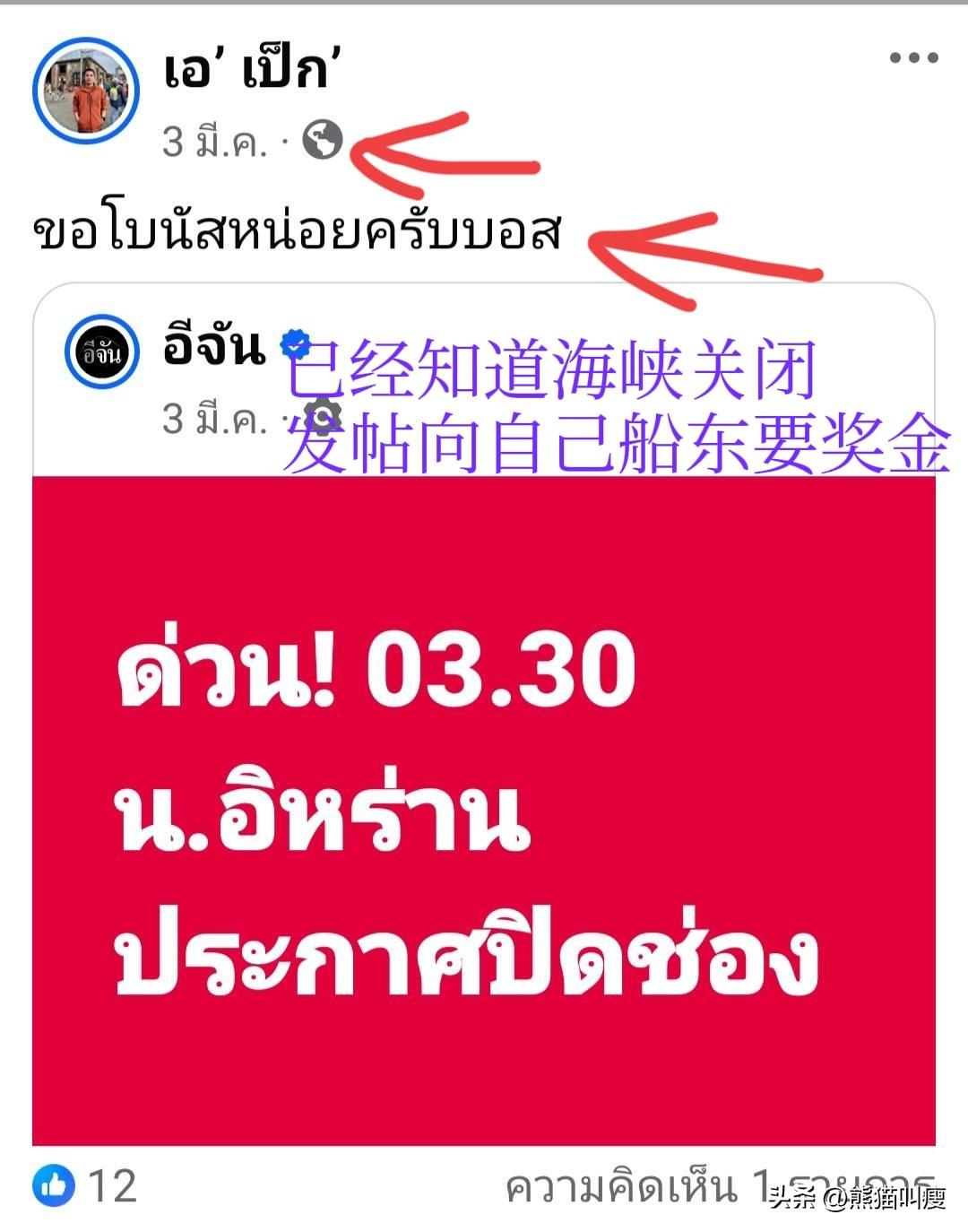 为了保险铤而走险?泰国船长三月三日就发贴表明知晓伊朗已经关闭霍尔木兹海峡。那时他还在阿联酋的卡利法港。 是什么让他甘愿铤而走险,有勇气强闯海峡? 在自己船被砸穿大洞,人和自己船员被送上岸后,他发图文一股无辜味道:“再见了对不起我不能带你回家。他们不是说的不会攻击泰国舰船吗?”——伊朗可没说过这种话,能通过海峡的,目前只有唯二的两位。 伊朗官方表示击沉这泰国商船是因为他们多次警告还在硬闯,完全是咎由自取。