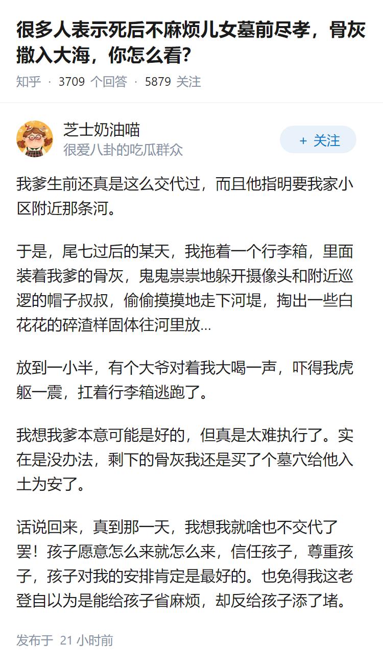 很多人表示死后不麻烦儿女墓前尽孝,骨灰撒入大海,你怎么看?