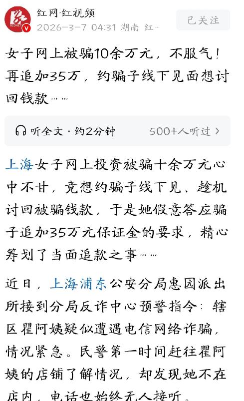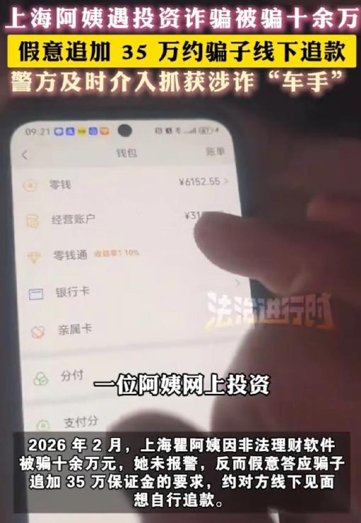 电视都不敢这么演!上海,大妈在网上投资了十几万,本想着大赚一笔,谁知却被骗了个精光。她不甘心,竟然想着约骗子线下见面,想办法把被骗的钱追回来。所以,她将计就计,假装答应骗子,说想要追加35万保证金,并和对方约好了见面地点。万万没想到,见面后的情况,跟她想象中完全不一样。 大妈还比较谨慎,只是试探着问了问客服,客服说得天花乱坠,说这个平台是正规的,有国家资质,还拉她进了一个投资交流群。群里每天都有人晒收益截图,说自己投了几万,没几天就赚了几千,还有“老师”每天直播讲课,指导大家怎么投资,一步步打消了大妈的顾虑。 大妈心动了,想着自己退休工资不多,要是能通过投资赚一笔,以后养老也能更宽裕些。她先是投了1万块钱,没想到才过了3天,就收到了1000块钱的收益,这一下,大妈彻底放下了戒心,觉得自己找到了一条“致富路”。 接下来的几天,大妈越投越多,先后投了十几万,都是自己攒了一辈子的养老钱,还有一部分是向亲戚借的。刚开始,她还能收到少量收益,可没过多久,她就发现不对劲——平台上的收益没法提现了,客服也开始敷衍她,说系统维护、资金冻结,让她再等等。 大妈心里发慌,赶紧联系那个指导她投资的“老师”,可对方要么不回消息,要么就找各种借口推脱,到最后,干脆把她拉黑了。这时候,大妈才恍然大悟,自己被骗了,十几万的钱,一分都要不回来了。 看着手机里空荡荡的账户,大妈急得整夜睡不着觉,越想越不甘心。她不想就这么白白损失十几万,思来想去,竟然生出了一个大胆的想法——约骗子线下见面,想办法把钱追回来。 她试着用另一个手机号添加骗子的微信,假装自己还不知道被骗,语气热情地说,自己觉得这个投资很靠谱,想再追加35万保证金,希望能和对方见一面,详细聊聊投资细节。 让大妈没想到的是,骗子竟然真的答应了。大概是觉得大妈还没醒悟,还想再多骗一笔,骗子很快就和她约好了见面地点,选在一个偏僻的小区门口,还特意叮嘱她,只能一个人来,不能告诉别人,否则就取消见面,她之前投的钱也别想再要回来。 大妈表面上一口答应,心里却早有打算,她想着,只要能见到骗子,就趁机记住对方的长相,再想办法周旋,实在不行就报警。为了保险起见,她出门前,悄悄把见面地点、骗子的微信头像和聊天记录都发给了自己的儿子,还跟儿子约定,要是一个小时内没给她发消息,就赶紧报警。 到了见面地点,大妈远远就看到两个陌生男子站在路边,看着鬼鬼祟祟的。她深吸一口气,走了过去,刚开口问对方是不是“投资老师”,其中一个男子就上前一步,语气凶狠地问她:“钱带来了吗?35万,一分都不能少。” 大妈这才意识到,自己想错了,骗子根本不是一个人,而且态度极其恶劣,根本没有跟她周旋的意思。她强装镇定,说自己没带现金,想先确认一下平台的安全性,再把钱转过来。可这话刚说完,另一个男子就不耐烦了,伸手就要拉她,还威胁她说,要是敢耍花样,就让她吃不了兜着走。 大妈吓得浑身发抖,赶紧往后退,这时候,她突然想起自己跟儿子的约定,趁两个男子不注意,悄悄按下了手机里的报警快捷键。大概过了十几分钟,民警就赶到了现场,两个骗子看到民警,当场就慌了,转身就想跑,可没跑几步,就被民警当场抓获。 到了派出所,两个骗子很快就交代了自己的犯罪事实。他们根本不是什么投资平台的工作人员,就是专门靠虚假投资诈骗的骗子。 那个所谓的投资平台、交流群、收益截图,全都是他们伪造的,目的就是骗取老年人的钱财。他们没想到,大妈竟然会主动约他们见面,还以为能再骗一笔,没想到最终栽在了大妈手里。 经过几个月的调查和追缴,大妈被骗的十几万,大部分被追了回来,剩下的部分,民警也在继续追缴中。大妈拿到追回的钱,又激动又后怕,她万万没想到,自己一时贪念,不仅被骗了钱,还差点陷入更大的危险,要是没有及时报警,后果不堪设想。 这件事其实给很多老年人提了个醒,现在网上的虚假投资诈骗越来越多,骗子们抓住老年人渴望赚钱、防范意识薄弱的特点,编造各种虚假宣传,设下陷阱,让很多老年人血本无归。 很多老年人退休后,手里有一些积蓄,想通过投资增加收入,可往往因为缺乏防骗知识,轻易相信骗子的花言巧语,最终被骗。 对比那些被骗后,只能自认倒霉、默默承受损失的老年人,这位大妈还算勇敢,不甘心被骗,敢于主动想办法,虽然过程很惊险,但最终成功协助民警抓获了骗子,追回了大部分损失。 可现实中,很多老年人被骗后,因为害怕被家人指责,或者觉得钱追不回来,就选择不报警,这反而让骗子更加肆无忌惮,继续欺骗更多的人。 我觉得,老年人想要通过投资增加收入,无可厚非,但一定要保持清醒的头脑,牢记“天上不会掉馅饼”,任何低投入、高回报、保本保息的投资,都是骗局。 子女也应该多关心家里的老年人,平时多给他们普及防骗知识,提醒他们警惕虚假投资、电信诈骗等骗局,定期和他们沟通,了解他们的资金流向。