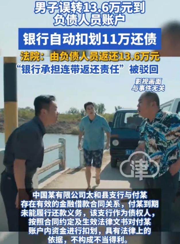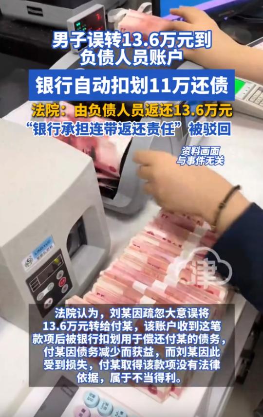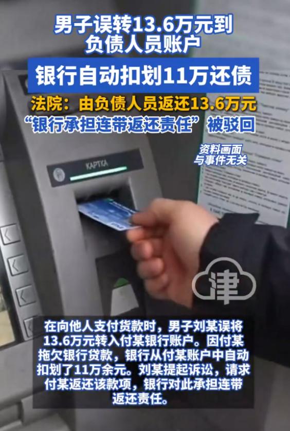 担心的事情还是发生了!安徽阜阳,男子在支付货款时,不小心转错了人,谁知对方欠银行的钱,钱刚到账就被银行给划走了,男子将对方起诉,还要求银行承担连带责任,结果直接被法院驳回了。   安徽阜阳一名做小生意的男子,近期遭遇了一件让人欲哭无泪的事,一笔13.6万的货款转错账户,刚到账就被银行划走抵债。   于是他把收款人跟银行一起告上法庭,满心以为能追回损失,没想到两级法院都驳回了他对银行的诉求,只判收款人还钱,可收款人本身就是欠银行钱的主,这笔钱能不能追回来,至今还是个未知数。   这名男子姓刘,做的是需要经常周转资金的生意,去年7月30号那天,他要给合作多年的供货商转一笔13.6万的货款。   供货商姓付,手机银行里他刚好存了两个姓付的人的账户,一个是正主,一个是之前有过短暂合作、早就没往来的付某。   那天生意太忙,他随手点开联系人,没仔细核对账号和姓名,手指一点,13.6万就转了出去。   转账成功的提示弹出来时,刘某才猛然发现不对劲,收款人根本不是自己要找的供货商,他心里一沉,赶紧联系那个付某,可电话打过去要么没人接,要么接通了就说没钱。   更让他崩溃的是,等他联系银行想冻结这笔钱时,银行工作人员告诉他,这笔钱刚到付某账户,就被系统自动扣划了11万多,用来偿还付某拖欠的贷款。   刘某一下子就懵了,自己的血汗钱,没经过自己同意,怎么就替别人还了债。   他反复找银行沟通,说这笔钱是自己误转的,不是付某的钱,银行不该扣,可银行只说,他们和付某有合法的贷款合同,付某到期没还钱,银行有权自动扣划他账户里的资金,这是合同约定好的,没有任何问题。   眼看着找银行没用,找付某又要不回钱,刘某只能走法律途径,他把付某和涉事银行一起告上了法庭,要求付某全额返还13.6万货款,银行承担连带责任。   他心里的想法很实在,付某本身就欠着银行的钱,明显没能力还钱,要是银行不担责,自己这13.6万大概率就打了水漂,这对自己太不公平。   一审法院审理后,给出了判决,认定付某收到这笔钱没有任何法律依据,属于不当得利,判决他全额返还刘某13.6万,但驳回了刘某要求银行承担连带责任的诉求,理由是银行扣划资金是履行合同约定,有合法依据,没有过错。   刘某不服这个判决,又提起了上诉,希望二审能改判。 今年3月初,阜阳中院作出了二审判决,还是驳回了刘某的上诉,维持原判,法院解释说,钱一旦进入付某的账户,在法律上就推定是付某的资金,银行扣划自己债务人的钱,是行使合法债权,不需要承担连带责任。   至于刘某的损失,只能找付某追偿,毕竟转错账的疏忽,根源还是在他自己身上。   这件事传开后,很多人都替刘某觉得冤,觉得银行太不近人情,但法律的判决有它的道理,毕竟银行没有义务去核实每一笔进账的来源,要是随便干预,反而会打乱正常的金融秩序。   说到底,还是给所有经常转账的人提了个醒,不管多忙,转账前一定要仔细核对收款人信息,多花三秒钟,可能就能避免一场无法挽回的损失。