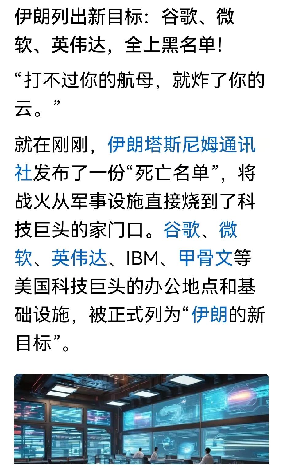 伊朗身后必有高人哇,如果真使出这一招,特朗普估计会寝食难安。 这一招太狠了,直接从打击美国军事基地,转移到打击美国科技巨头,把战场从物理疆域,拉进了数字命脉。 不再硬碰硬炸军营、打雷达,而是精准点名谷歌、微软、亚马逊、英伟达——这些为美军提供AI算力、情报分析、无人机指挥、战场通信的科技巨头,一夜之间从“幕后服务商”变成“前线靶心”。 伊朗公开宣布:凡为美军提供技术支撑的科技设施,不分军民,一律视为军事目标。 这一步,直接戳中美国最痛的软肋。 只能说,伊朗背后有高人,这一招太绝太高明了。美国要打伊朗 伊朗饱和打击 美国入侵伊朗 伊朗命中目标 美军合围伊朗 伊朗上空封锁 伊朗情报人员