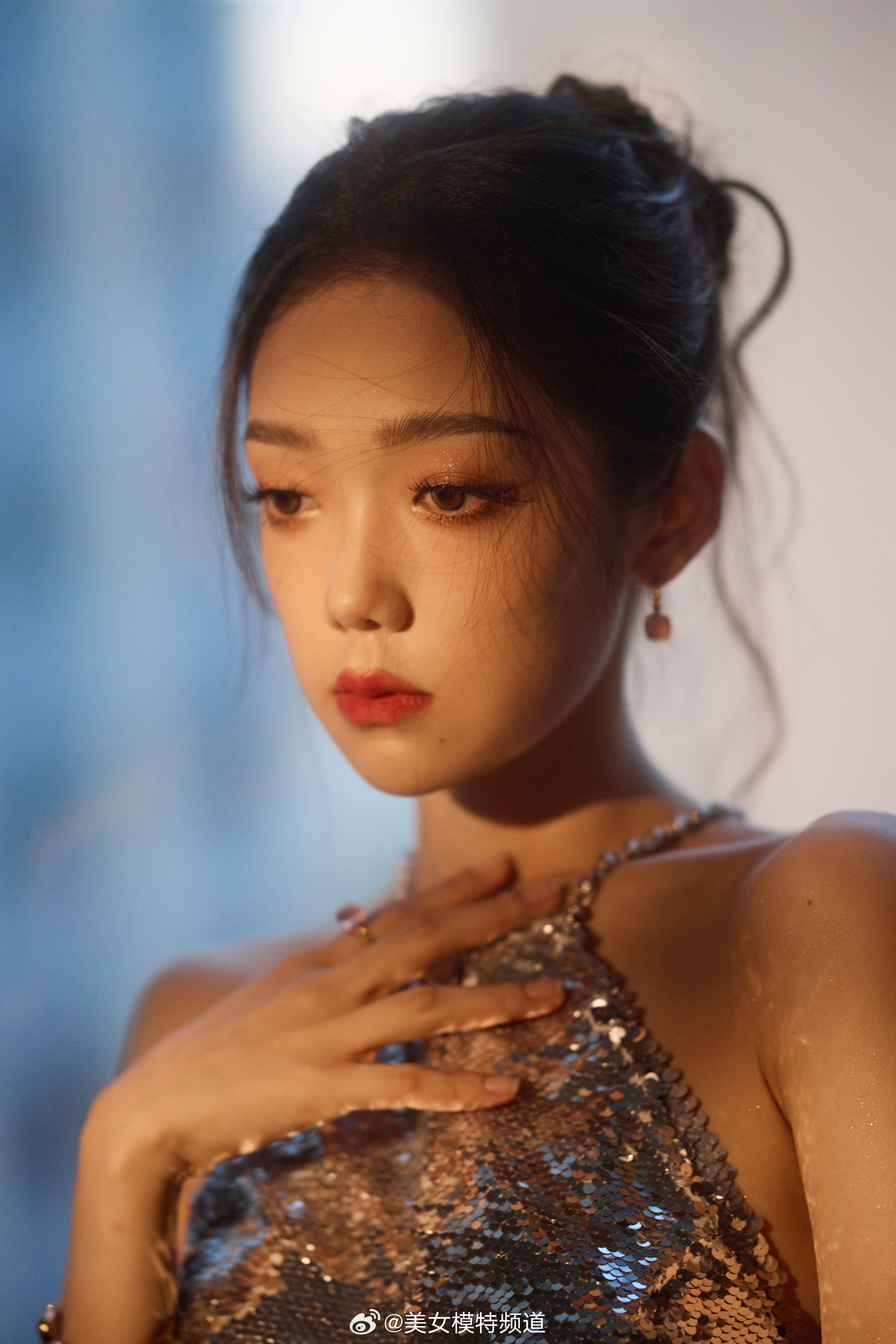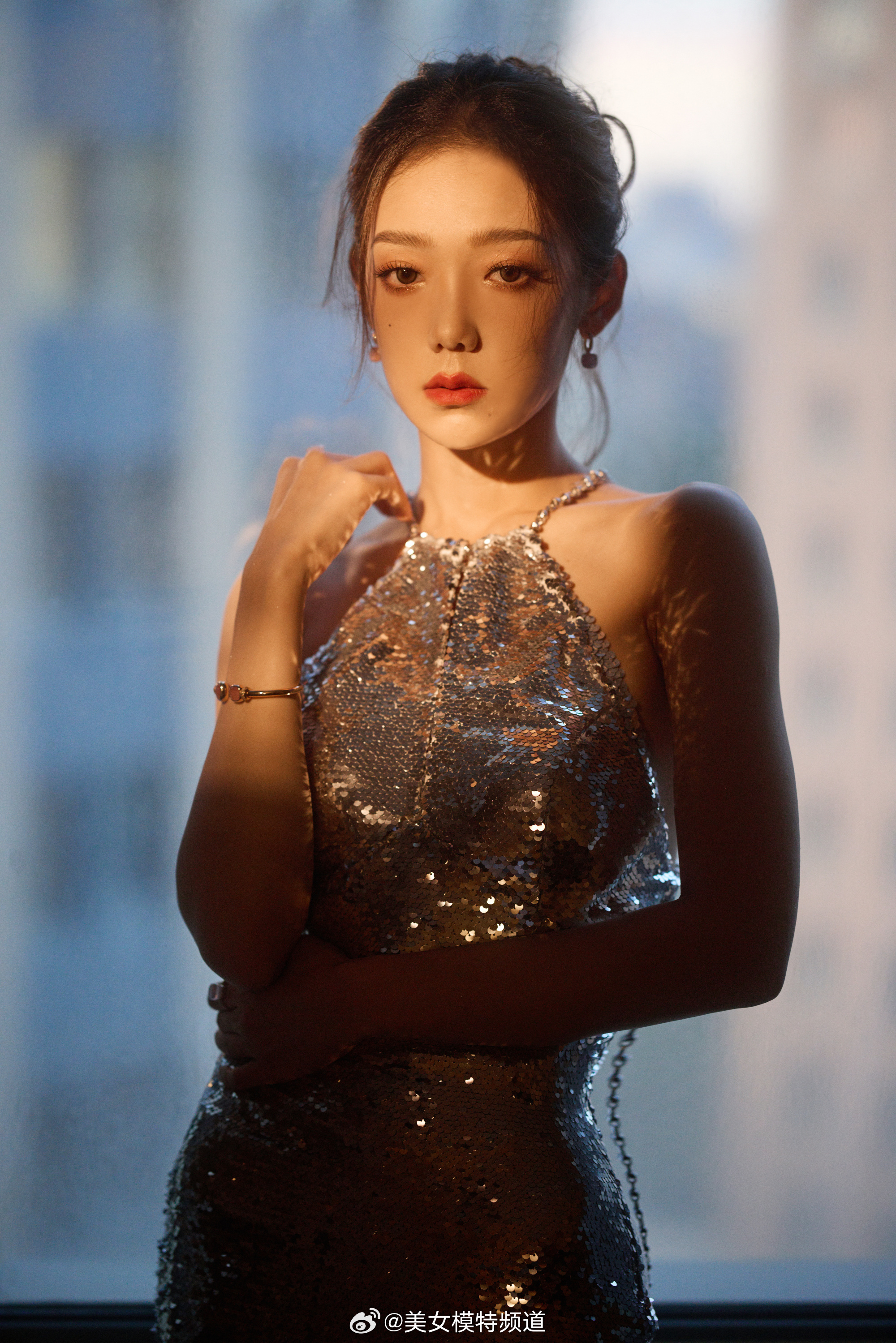 希林娜依高银色挂脖长裙大片