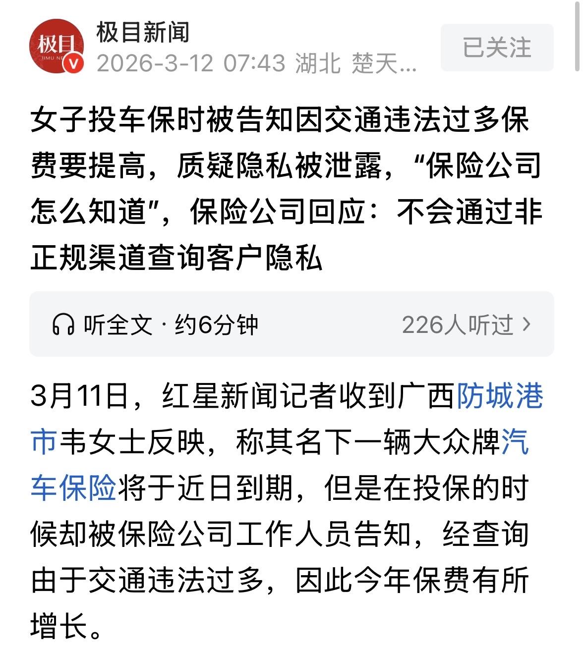 广西防城港,女子车险快到期了,谁料她投保时,工作人员突然说她交通违法太多,今年保费有所增长,这句话让女子细思极恐,保险公司是怎么知道她车辆违法信息的?女子怀疑个人隐私被泄露了,直接投诉,工作人员见状摊牌了,说出的理由让女子意想不到。 韦女士看着手机屏幕上的拒保通知,一脸的不可思议。 她那辆大众车的保险眼看就要到期,本想着去年安安全全跑了一年,连个小剐蹭都没找保险公司赔钱,今年续保怎么也得打个折吧? 结果等来的不是优惠,而是保险公司的一句:您的车交通违法超过10次,系统风控过不了,保费得涨,甚至可能拒保。 这事儿搁谁身上都得懵,韦女士也是越想越觉得不对劲。 她倒不是心疼那多出来的保费钱,毕竟违章多了风险大,这道理她懂,也认罚。 让她心里发毛的是另一件事,这保险公司是怎么知道她违章的? 她自己都没细数过违章,他们怎么比她本人还清楚? 在她看来,车辆的违章记录那是妥妥的个人隐私,除了交警队,外人凭啥能随意调取?难道是自己的信息被卖了? 带着一肚子问号和被窥探的愤怒,韦女士直接把电话打给了保险业务员。 对方的解释让她更迷糊了。业务员说:姐,这是行业平台给的数据,我们也是按规矩办事。 什么平台?它凭什么把我的隐私给你们?韦女士不吃这一套,当场就在电话里质问。 业务员支支吾吾解释不清,只说是“官方渠道”。 这通电话没能解开韦女士的心结,反而让她觉得这里面水很深。 挂了电话,她二话不说,直接拨打了投诉电话。她觉得这事儿必须得掰扯清楚,不能稀里糊涂就被监控了。 投诉之后,保险公司的负责人很快回了电。 这回的态度诚恳了不少,对方先是共情,说韦女士,我特别理解您的担心,换我是客户,我也得问这信息哪来的,安不安全。 负责人接着揭开了谜底,但这谜底听着有点高科技。 原来,保险公司根本没权限去查韦女士的具体违章细节,也没那个闲工夫去盯着她。 真正的幕后黑手是一套自动匹配系统。只要韦女士的车牌号和车架号往系统里一输,这边电脑就自动跟交管部门的官方数据库“对暗号”。 就像两台机器在握手。负责人打了个比方,交警那边只回传一个结果:这车违章超10次,风险高。 至于您是闯红灯了、压线了还是超速了,具体在哪违章的,我们这边屏幕上根本不显示,也看不着。 听到这,韦女士心里的石头落了一半,但还有一半悬着:那这信息安全吗?万一泄露了呢? 负责人赶紧解释,这是银保监会统一规定的“车险信息平台”,数据传输都是加密的,保险公司只能看到一个风险等级。 也就是说,韦女士在保险公司眼里,不是一个具体的违章大户,只是一个代表高风险的信号。 虽然心里还是有点别扭,觉得像是被大数据“扒光”了一样,但韦女士也明白,这回确实是自己理亏。 谁让自己那是马路杀手潜质呢,一年违章十几次,也就是运气好没出大事。 不过这以后开车可得悠着点了,这违章记录不光扣分罚款,还直接跟钱包挂钩呀! 那从法律角度,怎么看这件事? 《个人信息保护法》第13条:符合下列情形之一的,个人信息处理者方可处理个人信息:为履行法定职责或者法定义务所必需;依照本法其他有关规定,处理个人信息应当取得个人同意,但是有前款第二项至第七项规定情形的,不需取得个人同意。 保险公司通过行业平台与交管数据库对接获取韦女士的违章次数,属于“为履行法定义务所必需”。 根据银保监会规定,保险公司需评估车辆风险,且系统仅反馈风险等级而非具体隐私细节,符合“最小必要原则”。 因此,在法定监管框架下的信息自动匹配,不需个人单独授权,不构成对隐私权的非法侵犯,而是合规的风险管控手段。 对此,你怎么看? 关注@运良说法 学法律知识不迷路