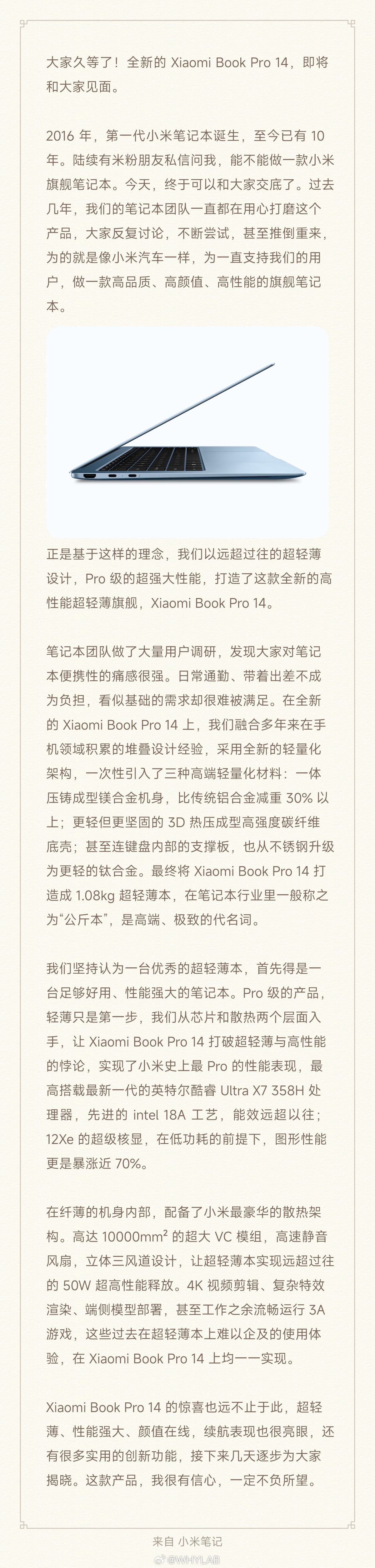 一体压铸镁合金机身、高强度碳纤维底壳、钛合金键盘支撑板,整机只有 1.08kg,厚度 14.95mm,轻薄度很顶。最高配酷睿 Ultra X7 358H,10000mm² VC 散热,50W 性能释放,属于高性能超轻薄本。