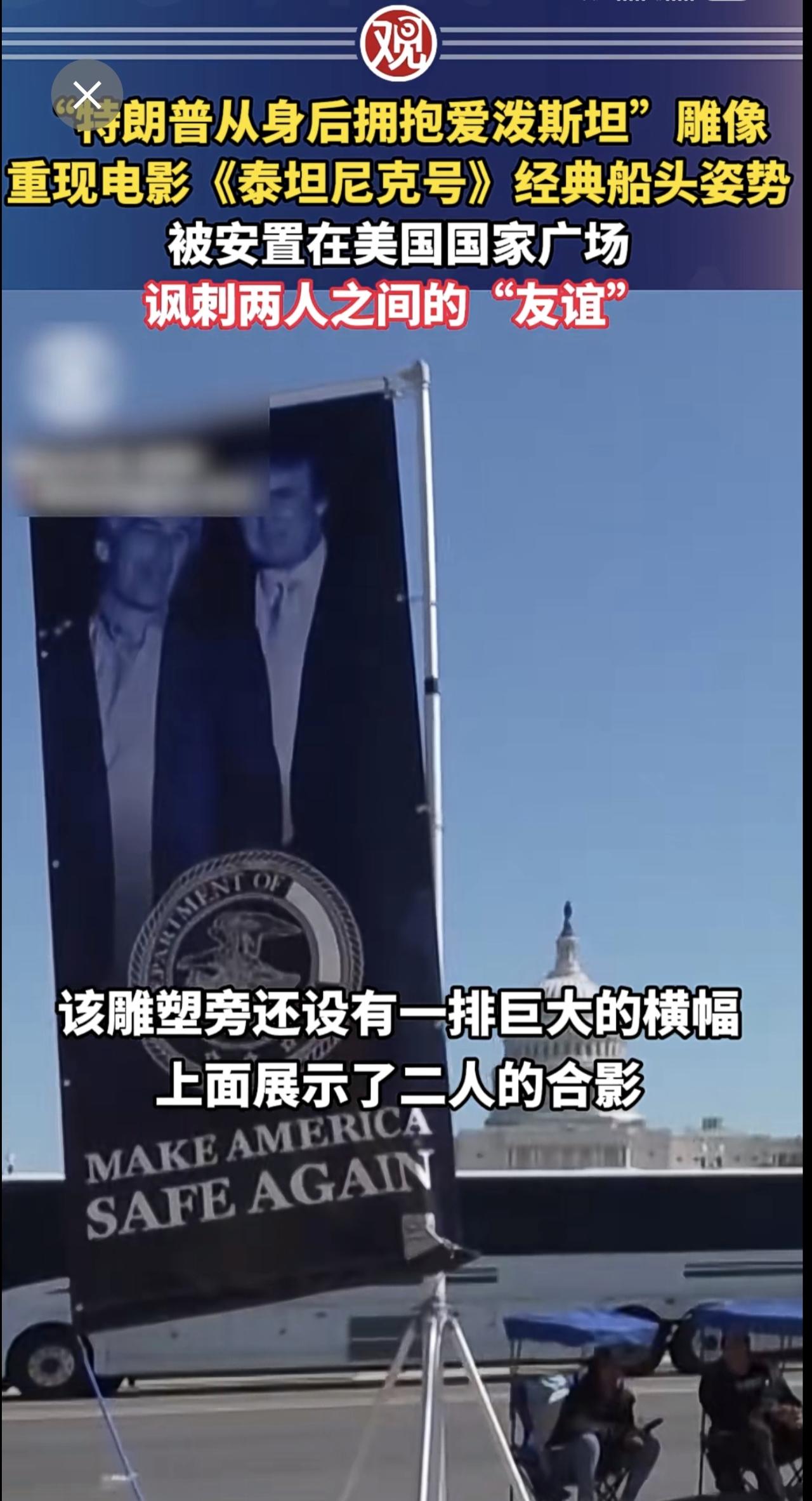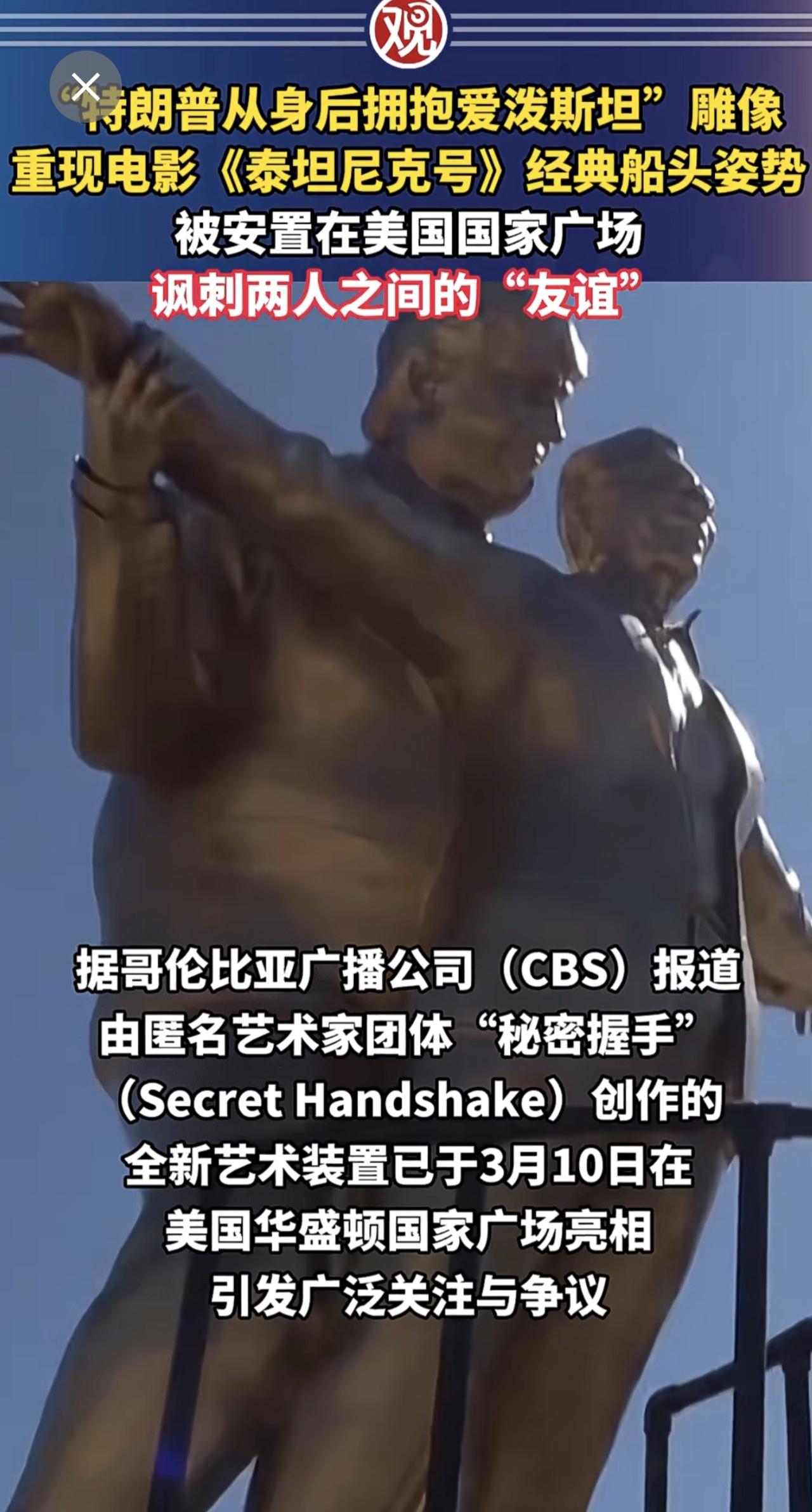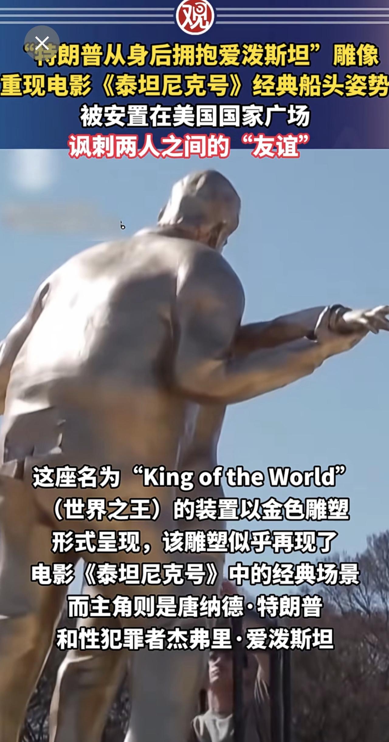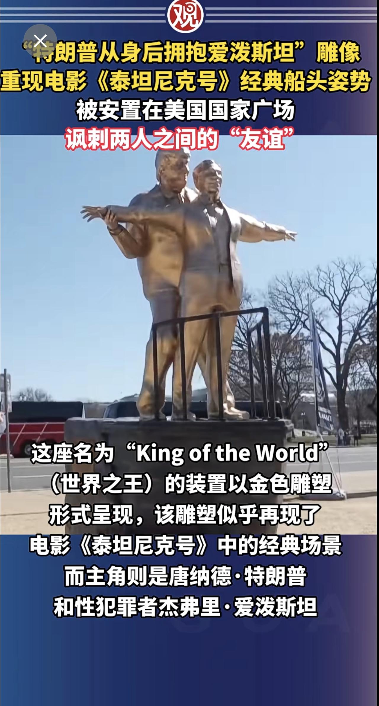“特朗普从身后拥抱爱泼斯坦”雕像重现电影《泰坦尼克号》经典船头姿势,被安置在美国国家广场,讽刺两人之间的“友谊”