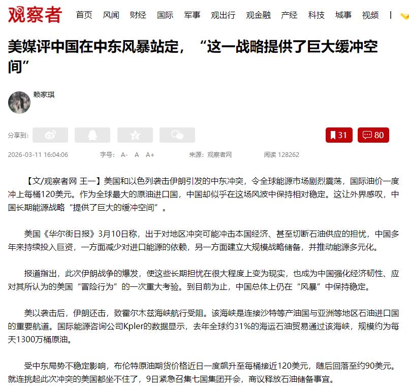 美媒直言:中东乱成一团,中国却一直稳如泰山,只因为做了这三件事! 美国《华尔街日报》3月10日专门发了篇报道,说中国在这场中东的“风暴”里一直很稳,还夸中国这几年的战略布局,给自己留足了缓冲空间。 很多人可能想不通,中东离我们这么远,那边打仗跟我们有啥关系?其实关系特别大。中东是全球主要的石油产地,我们国家每年要从那边进口不少石油。 大家平时开车、工厂开工、冬天取暖,都离不开石油和天然气,要是中东的石油供应被切断,油价肯定会猛涨,不仅影响我们日常生活,还会拖慢国家经济的发展。 《华尔街日报》的报道里也提到,中国早就想到了这个风险,这些年一直花大价钱做准备,不是临时抱佛脚,而是长期布局,主要就做了三件实在的事。 第一件事就是尽量少依赖进口能源,多靠自己。我们国家的石油确实有一部分需要进口,但这些年国家一直在加大国内石油和其他能源的开采力度。 2025年的数据显示,我们的能源自给率已经到了84.4%,八成以上的能源自己能供应。 去年国内原油产量也创了历史新高,达到2.16亿吨,能满足近三成的石油需求,比以前的依赖度降了不少。 除了石油,我们还大力发展风电、光伏,还有煤炭发电,这些都能替代一部分石油。 街上越来越多的新能源车,也是这个道理,不用烧油,既环保又能减少对石油的依赖,这些都是国家早就安排好的。 第二件事是建了大规模的战略石油储备,说白了就是提前存油。就像咱们家里会存米面粮油一样,万一外面的石油进不来,有储备在就不会慌。 截至2025年底,我们的战略石油储备总量能支撑110到130天的净进口需求,远超国际上90天的安全线。 这些储备分国家管控的和企业持有的,极端情况比如关键通道被封,用国家储备;日常油价波动,用企业储备来平抑,双管齐下保证供应稳定。 第三件事是让能源进口渠道更多样,不把所有希望都放在一个地方。很多人以为我们的石油全靠从中东进口,其实不是。 2025年的数据显示,我们从中东进口的石油占比才42.3%,其中伊朗的占比还不到5%,就算中东石油受影响,也不会直接断供。 现在俄罗斯已经成了我们第一大石油供应国,2024年进口占比到了19.6%,这些石油靠中俄管道运输,跟中东局势没关系。 我们还从非洲、美洲等地方进口石油,来源多了,一个地方出问题,其他地方能补上,风险就小多了。 这次伊朗战争爆发,正好让中国之前的担忧变成了现实,也成了对中国经济韧性的一次考验。 霍尔木兹海峡是全球石油运输的关键,每5桶海运原油就有1桶从这过,战争爆发后这里的通行风险大增,欧洲一些国家的天然气价格几天内涨了70%,老百姓的能源账单涨得厉害。 但中国不一样,到现在经济一直稳,油价就算有波动也没暴涨,老百姓的生活没受太大影响。这不是运气好,是国家早做准备的结果。 《华尔街日报》也说,中国的这些布局,给自身留足了缓冲空间,才能在中东的风暴里站稳脚跟。 有人问国家花这么多钱做这些准备值不值?当然值。能源安全是国家发展的根本,只有能源供应稳,工厂才能正常开工,老百姓日子才能安稳,国家经济才能好好发展。 以前我们在能源方面短板多,容易受国际局势影响,这些年通过少依赖进口、建储备、进口多元化,慢慢把短板补上了,也掌握了主动权。 美媒的这个评价,其实是客观说了中国这几年的发展。我们不是要掺和中东的冲突,而是先把自己的事做好,守住发展的底线。 这次中东的风波也让我们看明白,国家提前谋划有多重要,只有未雨绸缪,遇到风险才能稳得住。 对咱们普通人来说,不用太担心中东局势会影响生活。国家已经做好了充分准备,会保证能源供应稳定、控制油价波动。咱们只要相信国家,安心过好自己的日子,这就是国家强大给的最实在的安全感。