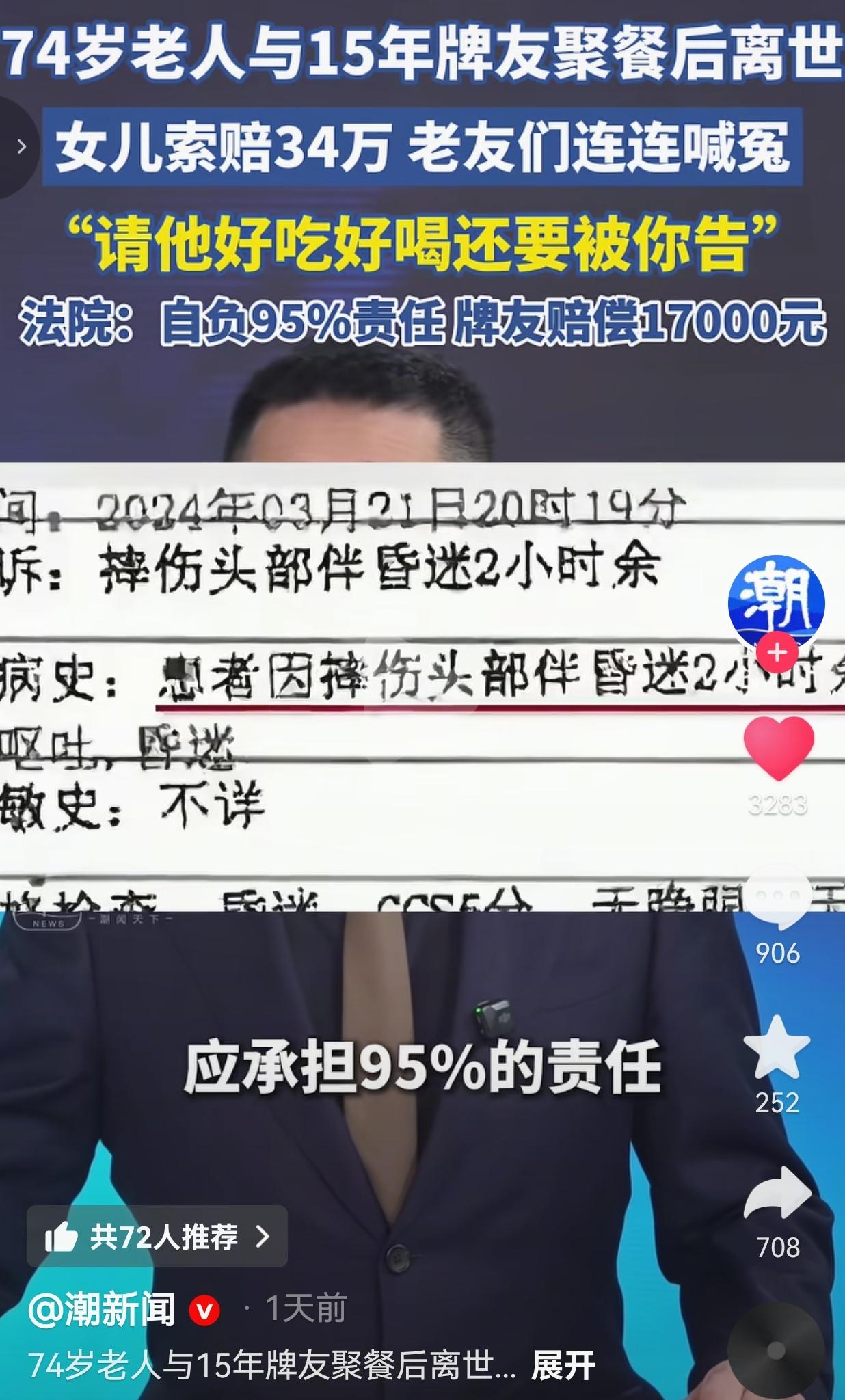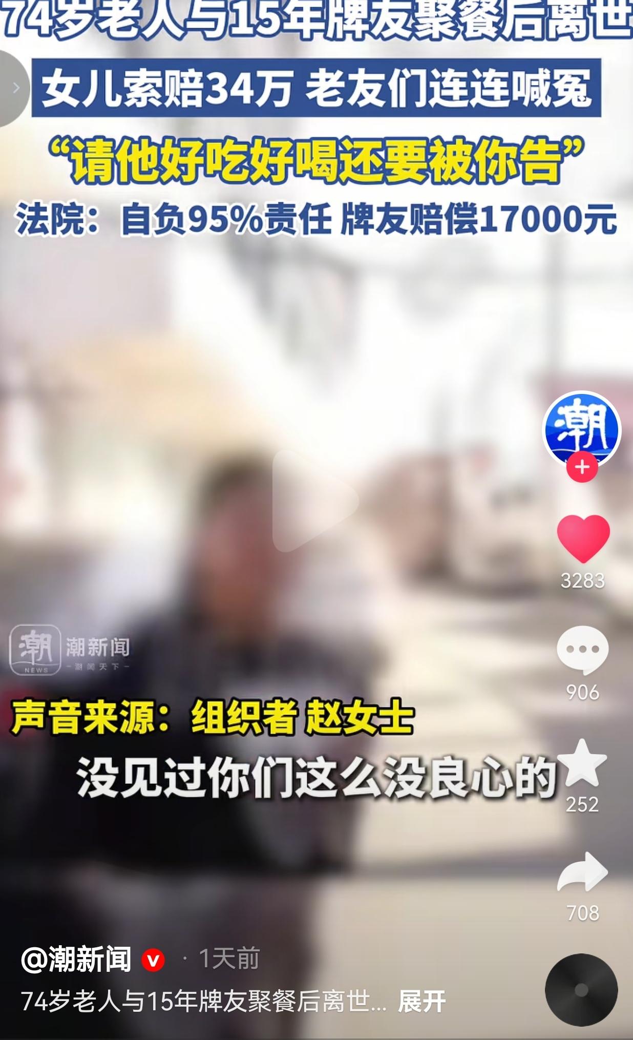 74岁的老张,跟一群牌友处了15年,跟家人似的。那天他特意从静安跑到奉贤,去探望老朋友们,大家在组织者赵女士家吃了顿饭,热热闹闹的,谁也没料到这会是最后一面。 饭桌上大家还多次劝老张少喝点酒,可老张自己执意要去棋牌室。聚餐结束后,他在棋牌室门口不小心摔倒,再也没醒过来。 摔倒后,老伙计们也立刻拨打了120,把他送到了医院,可最终还是没能留住他。 悲痛欲绝的女儿把几位牌友告上了法庭,开口就要34万块钱的赔偿,她哭着说:“他要是不到你家来吃饭,现在还活得好好的!” 还指责牌友们在医院里骗她,说已经把父亲安全送到家了。 可另一边,赵女士和老伙计们气得直掉眼泪:“我好心好意请他吃请他喝,每次来都到我家吃饭,吃完还要被你告!没见过你们这么没良心的!” 他们觉得自己冤得慌——都是多年老友,谁也没劝酒,谁也没推搡,老人是自己不小心摔的,摔倒后也第一时间打了120,凭啥要他们背锅? 最后法院判了:老张作为完全民事行为能力人,应自负95%的责任,组织者赵女士和两名陪同者需赔偿17000元。 说实话,我特别能理解女儿的心情。好好的父亲出去聚个餐就没了,这事搁在谁的身上,都接受不了,总想找个“责任人”,好像这样就能减轻一点失去亲人的痛。 可是,站在老伙计们的角度,15年的交情,请客吃饭反倒吃出了官司,换谁不心寒? 有网友看到后评论说:“丧亲之痛可以理解,但不能把悲伤变成撒向朋友的刀。” 也有的网友说:“74岁的人了,自己走路摔跤,总不能怪朋友留你吃饭吧?以后谁还敢跟老人来往?” 这事儿真的给所有人提了个醒: 朋友聚餐不是“免责协议”,但也不是“背锅合同”:成年人要为自己的行为负责,尤其是老人,身体状况自己最清楚,朋友尽到提醒和照顾的义务,就不该被无限追责。 别让“人情”变成“算计”:15年的牌友,不是亲人胜似亲人,最后闹到法庭,寒的是一群老人的心,以后谁还敢轻易约老友吃饭? 法理之外还有人情:法院判的17000元,更多是“补偿”而非“赔偿”,既照顾了女儿的情绪,也守住了公平,没让好人寒心。 这件事最讽刺的是,老张要是泉下有知,肯定不愿意看到自己的女儿把相处15年的老伙计告上法庭,更不愿意看到这群老朋友因为自己的意外,再也不敢聚在一起吃饭聊天。 对此,你有什么看法呢?