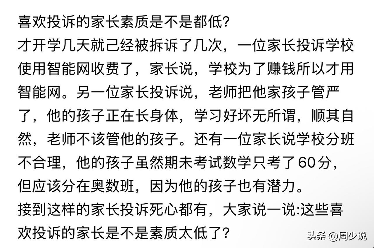 “素质确实低!”一位网友吐槽,开学才没多久,就接到了好几起家长投诉。有家长质疑学校用智能网收费,一口咬定学校是为了捞钱;还有家长觉得老师对孩子管得太严,称孩子正长身体,学习不用上心,顺其自然就好,老师没必要多管;更离谱的是,有孩子期末数学只考了60分,家长却硬要孩子进奥数班。面对这些莫名其妙的投诉,网友满心无奈,甚至直言“心都凉透了”。 此事在网上曝光后,瞬间引发热议。有网友说:“有些家长总把责任推给学校,自己却不管孩子,还对学校百般挑剔,真的挺让人无奈。” 也有网友表示:“不是不能投诉,可这些理由太牵强,分明是不讲理。” 周少想说家长对学校、老师有意见,正常沟通反馈本无可厚非,可不分青红皂白乱投诉,显然不是明智之举。 这些看似无理的投诉背后,藏着不少家长对教育的认知偏差,他们要么忽视学校管理的合理性,要么对孩子的成长没有清晰定位,一味苛责外界,却忽略了自身的教育责任。 实际上,教育从来不是学校单方面的事,家校之间本该多些理解和包容。家长若是总带着偏见随意投诉,不仅会消耗老师的教育热情,也不利于孩子树立正确的是非观。 真正的家校共育,从来不是一方指责另一方,而是彼此换位思考,理性沟通。毕竟,只有家校同心,才能真正帮孩子走好成长的每一步,别让无理投诉,成了孩子成长路上的绊脚石。#寻美三湘# #周少说教育# #寻美湖南#