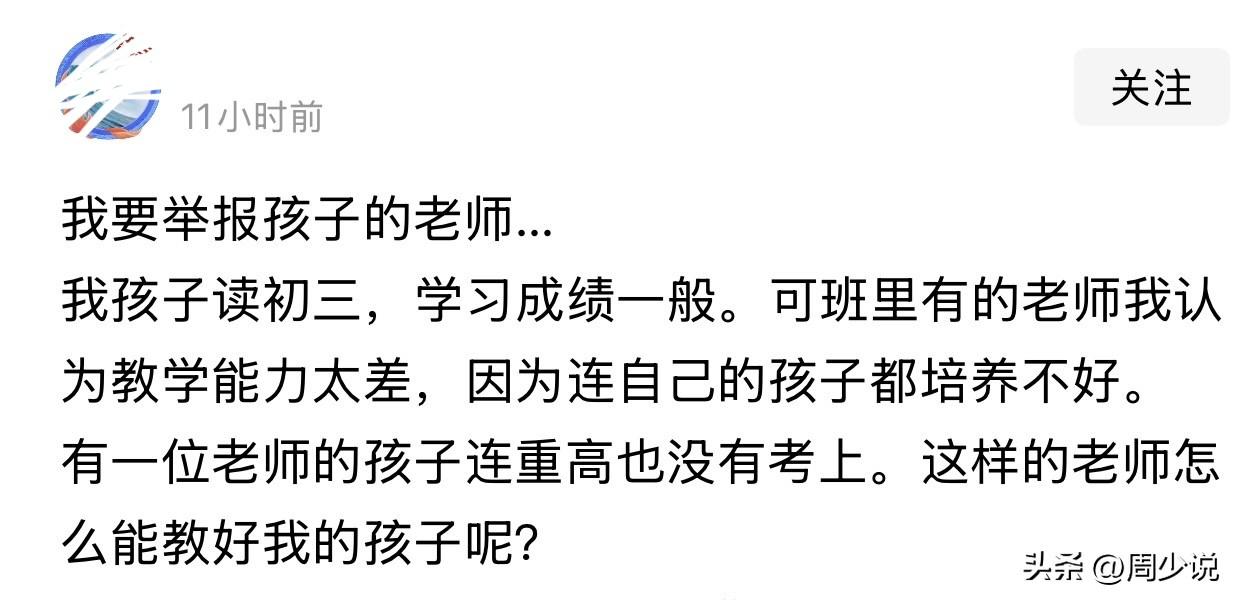“这家长真是无理取闹啊!”近日,一位家长的吐槽,引发热议。这位家长说,自家孩子正读初三,学习成绩一般。可看着班里有的老师,他心里实在窝火,甚至觉得老师教学能力不过关。其中一位老师的自家孩子,没能考上重点高中。在他看来,连自己的孩子都教不好,这样的老师,又怎么能教好别人家的孩子? 这番话一出,网友们的看法直接分成了两派。有网友附和:“确实,老师教不好自己孩子,难免让人怀疑教学水平,换我我也心里打鼓。” 也有网友直言反驳:“这逻辑太片面了吧,老师的教学能力和教好自家孩子根本不能划等号,班里那么多学生,老师能兼顾过来就很不容易了。” 在周少看来,这位家长的心情不难理解,初三是孩子升学的关键期,家长盼着孩子成绩提升,对老师要求高些,本是人之常情。 但这位家长也要搞清楚,老师的本职工作,是面对班级里几十名学生,要兼顾不同孩子的学习节奏、性格特点,制定教学计划、批改作业、辅导功课,本就耗费了大量精力。 而教育自己的孩子,和教学生完全是两码事,亲子间的相处模式、教育心态,和师生关系有着天壤之别,不少老师能把学生教得很出色,却未必能拿捏好自家孩子的教育分寸,这其实是很常见的情况。 所以,单凭老师自家孩子没考上重高,就否定其教学能力,实在太过武断,太过偏激,太过无理取闹了,更别动不动就投诉老师。 教育从来都不是单方面的事,孩子的成绩好坏,离不开学校教育、家庭教育的共同作用,与其纠结老师的私事,不如多和老师沟通配合,找准孩子学习的问题,帮孩子找到适合的学习方法,这才是更靠谱的做法。#寻美三湘# #周少说教育# #寻美湖南#