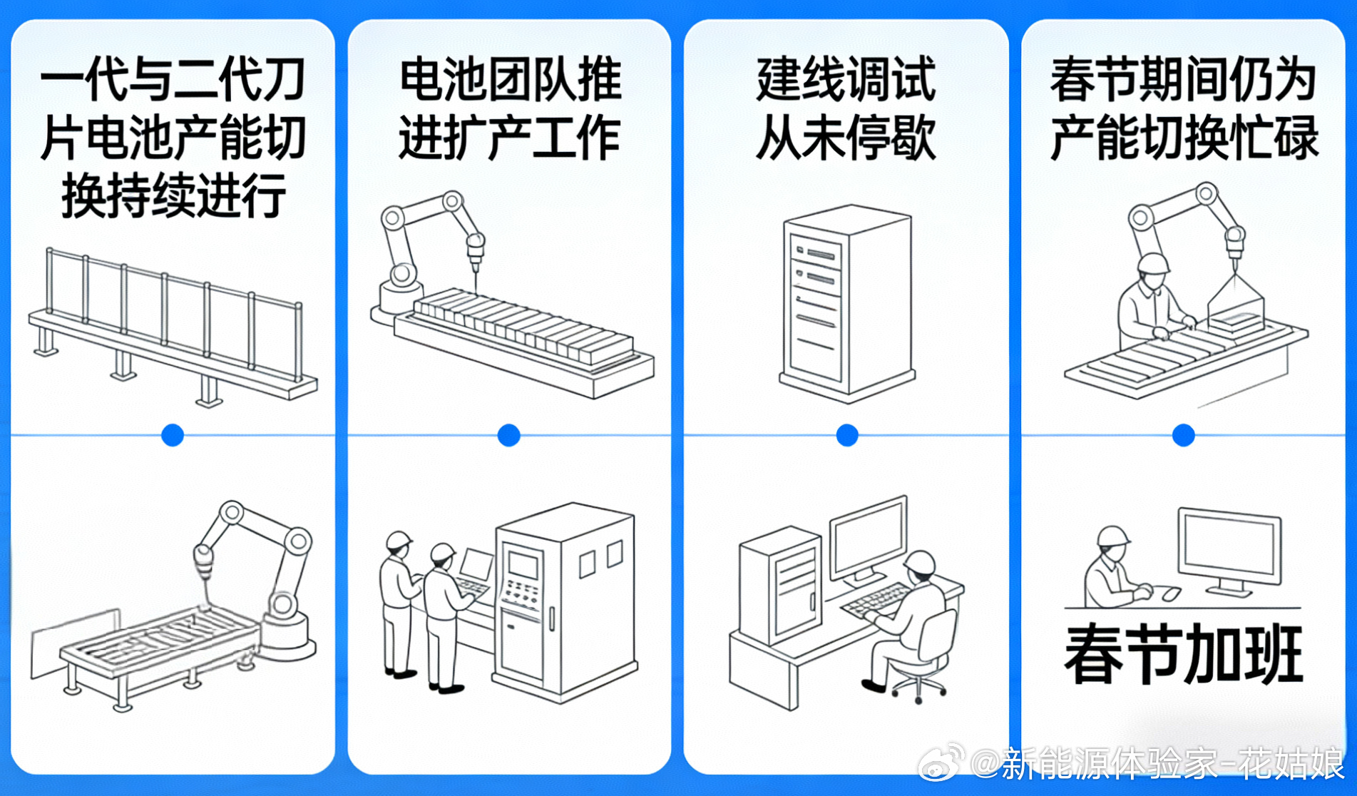 比亚迪一代和二代刀片电池的产能切换目前仍在进行中。自第一代刀片电池发布后,电池团队便持续推进扩产工作,建线、调试从未停歇,工作量极大,就连春节期间也在为产能切换忙碌。2020年初代刀片电池横空出世后订单有多猛,现在产能切换就有多拼!爷青回!比亚迪大v聊车新能源大牛说