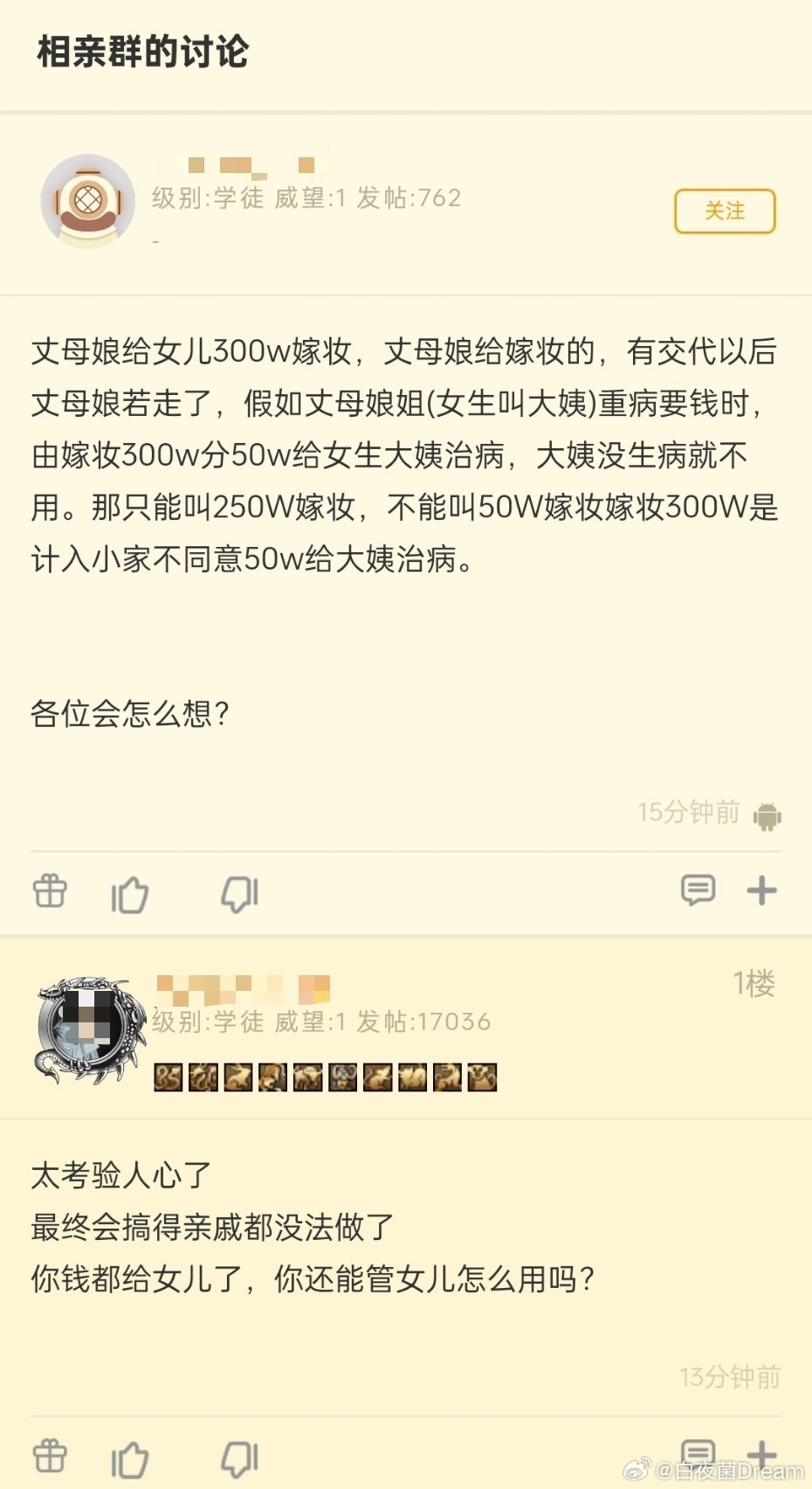 相亲群的讨论,丈母娘给女儿300w嫁妆