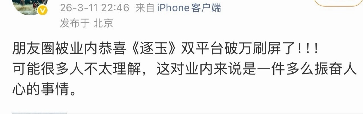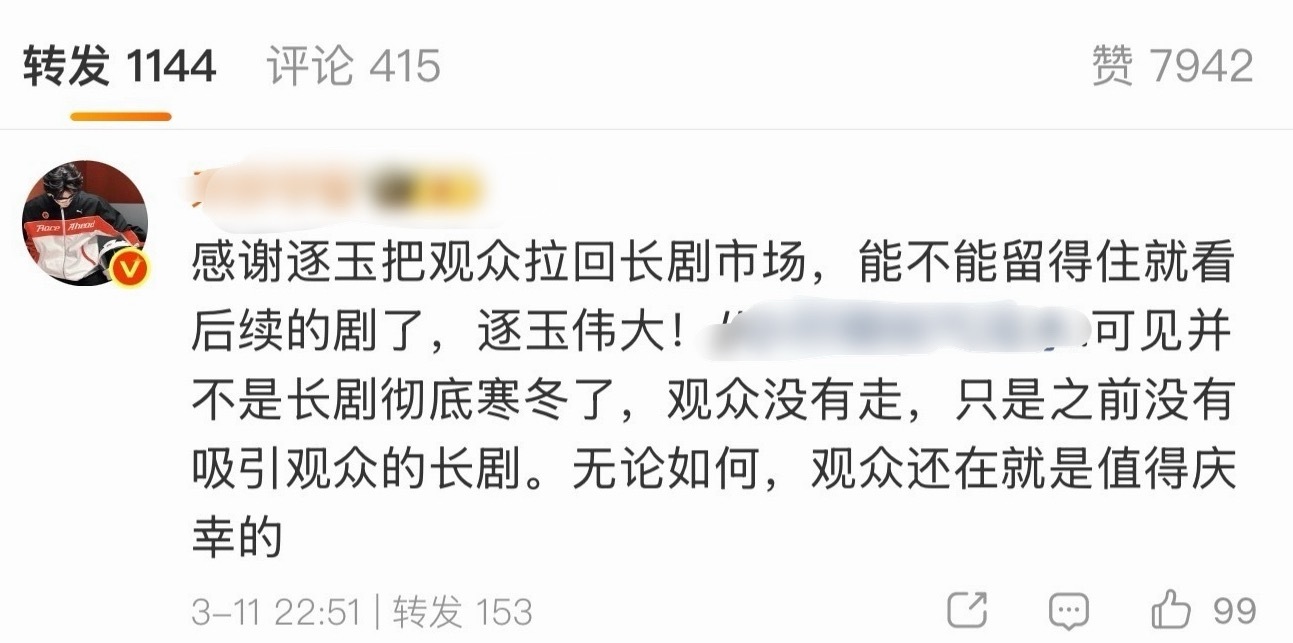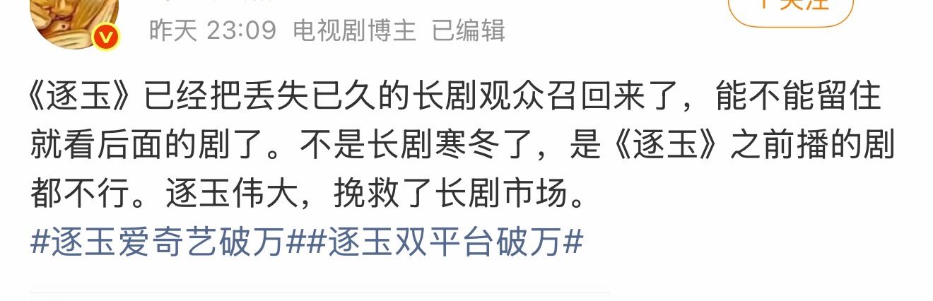 ?逐玉挽救了长剧市场,已经把丢失已久的长剧观众召回来了…逐玉伟大,挽救了长剧市场。不过我还挺好奇,下一部剧上的时候,鹅会区别对待吗