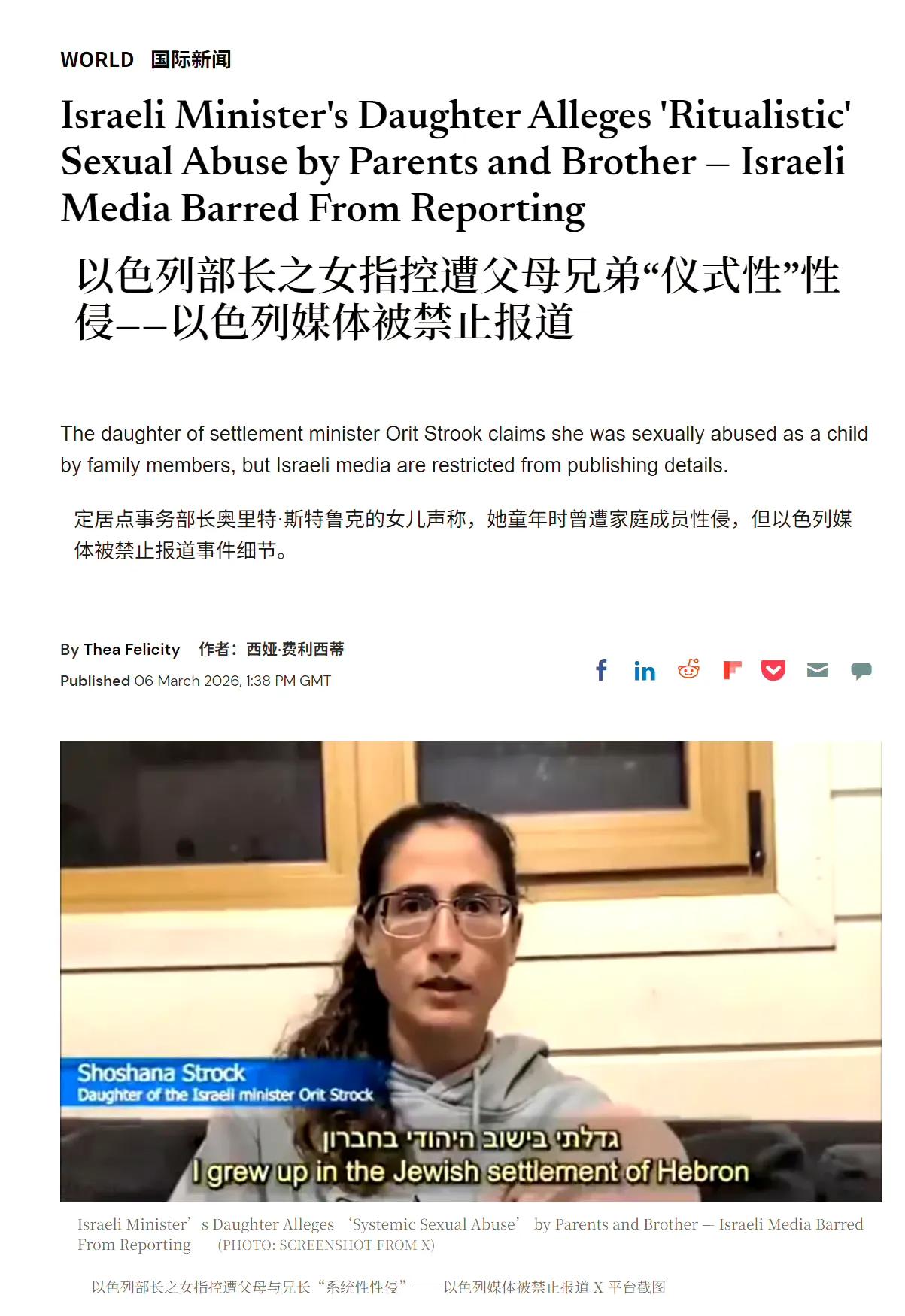 以色列多家媒体报道了以色列定居点事务部长奥里特·斯特罗克之女舒莎娜·斯特罗克在意大利公开指控她的父母、一名兄弟和父母的朋友从她大约两岁半时起就不断对她进行性侵。 这件事在以色列国内引发轩然大波,毕竟被指控的是一名现任政府高官,还是亲生父母对亲生女儿下手,性质太过恶劣。 舒莎娜没有选择沉默,她在意大利通过视频公开了自己的遭遇,每一句话都带着沉重的分量。这不是她第一次发声,早在2025年,她就曾在社交媒体上提及被家庭虐待的经历,只是这一次,她曝光了更多令人发指的细节。 她明确表示,这种侵害不是偶尔发生,而是持续了数十年,从她牙牙学语的幼儿时期一直延续到成年。 更让人揪心的是,她提到父母不仅对她下手,还对三个弟弟实施过身体伤害,长期的殴打和精神控制,让整个家庭都笼罩在阴影之下,成了囚禁孩子的牢笼。 舒莎娜还透露,童年时期的侵害过程被家人录制下来,这些视频不仅是威胁她的筹码,还疑似被用于儿童色情目的。 她甚至控诉,13岁那年,父亲开始强迫她卖淫,把她当成敛财工具,这种有组织的剥削和持续威胁,让她长期处于精神崩溃的边缘。 为了躲避家人的持续伤害和死亡威胁,舒莎娜并非多年前就旅居意大利,而是2026年初才被迫逃亡到那里,如今终于鼓起勇气公开求助。 其实早在2025年,她就曾在以色列报案,却被警方以“证据不足”为由搁置,后来案件才被移交至反贪及重大犯罪调查部门“Lahav 433”负责审查,这是以色列处理严重犯罪案件的专门机构。 事件曝光后,以色列法院下达了罕见的报道禁令,限制媒体对案件细节的报道,甚至禁止国内媒体提及指控与奥里特·斯特罗克有关。 支持者认为这是为了保护调查过程和受害者隐私,批评者则指出,这实际上是阻止公众了解针对一名现任政府高官的严重指控,让有权势的人得以在沉默中免受舆论监督。 以色列本就面临着巴以前线的紧张局势,国内舆论大多聚焦于外部冲突。舒莎娜的指控打破了这种表面平静,让内部的权力与正义之争浮出水面。 人们开始反思,权贵阶层是否真的能凌驾于法律之上,是否能凭借身份逃避应有的惩罚。值得关注的是,舒莎娜的兄长兹维基。 曾在2007年绑架并残酷殴打一名15岁巴勒斯坦少年,还踢死了一只新生山羊,2011年被定罪后,本应服刑更长时间,最终却提前获释。 更令人质疑的是,当年这起案件调查期间,同样被禁止报道,这一细节进一步凸显了以色列社会中存在的特权与傲慢,也让公众对司法公正产生深深的怀疑。 舒莎娜的遭遇不是个例,2025年6月就有多名幸存者站出来,指控以色列部分议员及高官参与类似的虐童恶行。 以色列社会中家庭内部的暴力和性侵问题一直存在,未成年人保护、家庭内部犯罪侦查等议题再次引发广泛讨论,人们呼吁完善相关法律,加强对受害者的保护,确保每一起案件都能得到公正处理。 截至目前,奥里特·斯特罗克本人尚未对女儿的指控作出任何公开回应,案件仍在调查中,最终结果尚未出炉。由此可见,爱泼斯坦的“萝莉岛”并非偶然事件。 但舒莎娜的勇敢发声已经引发了连锁反应,越来越多的人开始关注这一事件,要求彻查真相,给受害者一个交代,也给公众一个满意的答案。 这件事也提醒我们,无论身份地位如何,任何人都不能凌驾于法律之上。家庭本应是温暖的港湾,却成了某些人的噩梦,这种悲剧不该重演。 期待以色列司法机构能秉持公正,依法处理案件,维护受害者的合法权益,也维护社会的公平正义。