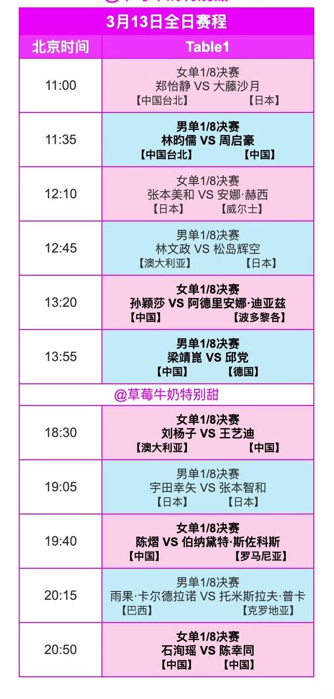 明日(3月13日,周五)赛程抢先看! 2026WTT冠军赛重庆站3月13日全日赛程如下图。 莎莎第二轮的比赛终于来到了前面,明天中午一点多孙颖莎🇨🇳要和好朋友迪亚兹🇵🇷对阵。 有小道消息说迪亚兹和小勒布伦在谈恋爱,倒是真有可能[捂脸]。 中午还有周启豪和大胖的两场硬仗,加油! 晚上大迪、陈熠应该都会比较顺利,另外晚上还有一场女单内战:石洵瑶🇨🇳VS陈幸同🇨🇳! (感谢草莓老师的图片)