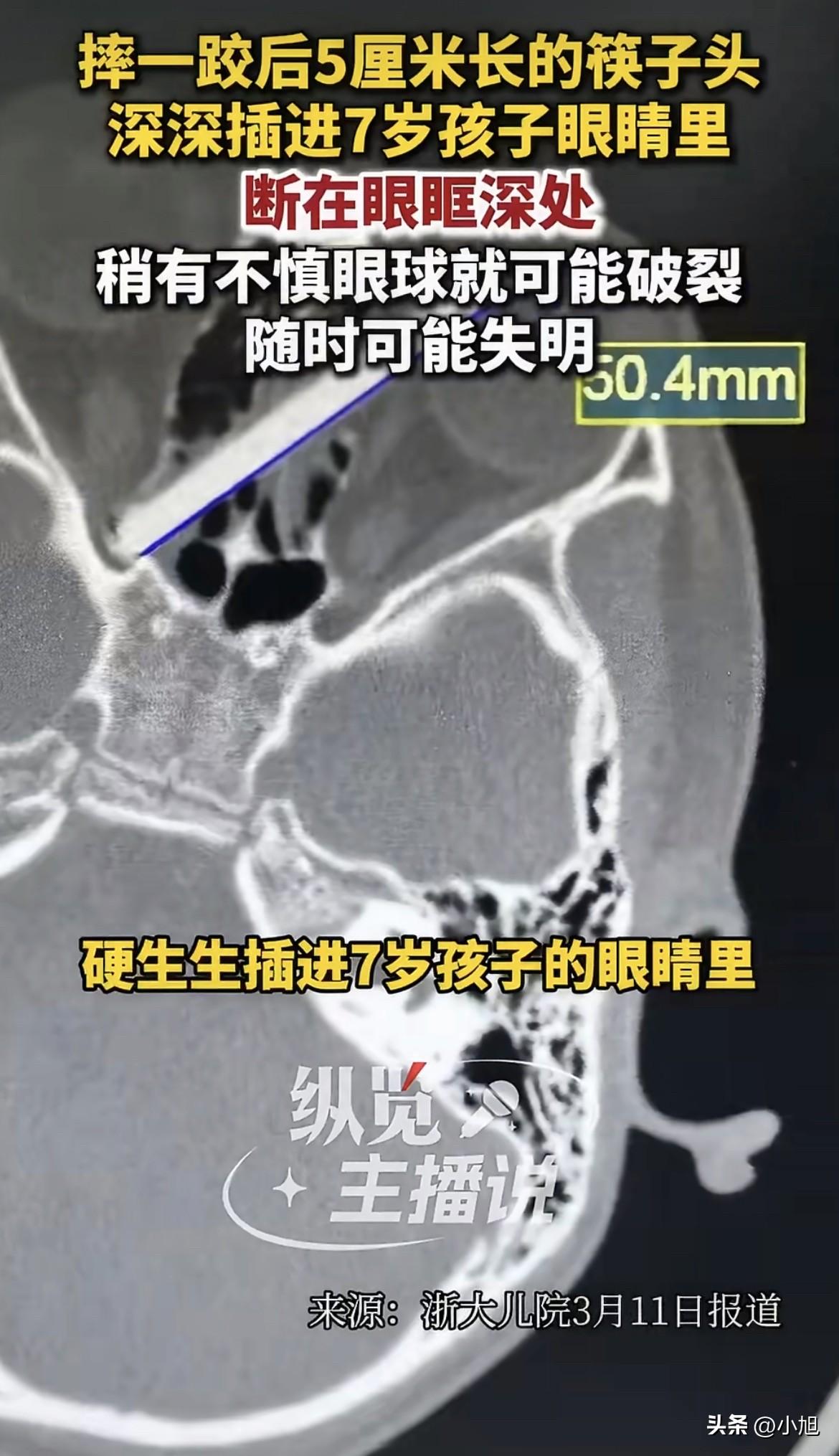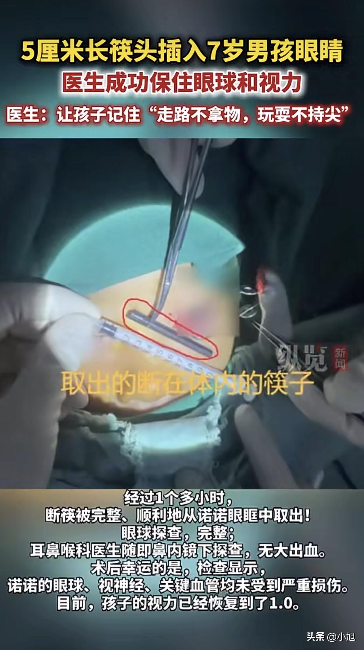 太可怕了!浙江一个7岁男孩诺诺,吃饭前摔了一跤。手里那根筷子,摔没了半截。 爸妈在地上找了一圈,什么也没找到。孩子捂着左眼一直哭,说疼,说看不清。妈妈当时脑子里"嗡"的一声——那截筷子该不会是插进去了吧? 送到浙大儿院,急诊医生扒开孩子眼睛看了半天,愣住了。 眼皮上只有一个不起眼的小黑点,像颗痣,像平时磕到碰到留下的小印子。没有露在外面的筷子头,没有流血,肉眼根本看不出里面有东西。 可CT结果出来那一刻,整个诊室安静了。 那截5厘米长的断筷,从左眼白上那个小黑点钻进去,一路斜着穿过去,横跨了整个鼻梁后面,筷子头死死顶在右眼的视神经管上。 医生后来解释,这根筷子的走向太刁钻了。左边贴着左眼球壁,稍微动一下左眼球就可能碎。右边抵着视神经,一旦伤到,右眼当场失明。筷子穿过的眼眶和鼻窦全是密密麻麻的血管,旁边就是大脑。不及时取出来,随时可能大出血或者颅内感染。 手术排在凌晨。 据浙大儿院后来透露,那天晚上多科室医生全到了。眼科、神经外科、耳鼻喉科的人站在手术室里,谁都没说话。 最难的是,筷子整个埋在里面,没有外露的部分可以拽。医生只能沿着筷子原来的通道,一点一点往里探,慢慢松解被压住的组织。这个过程最怕两件事:一是碰到视神经,孩子当场失明。二是筷子拔断了,剩下的残端更不好取,取不出来就麻烦了。 一个多小时后,筷子完整拿出来了。 眼科医生检查眼球,没破。耳鼻喉科医生伸鼻内镜进去看,没出血。 术后几天,诺诺的视力慢慢恢复。前几天复查,两只眼睛视力都到了1.0。 出院那天,爸爸抱着孩子往外走,妈妈跟在后面。三个人谁都没说话。据说孩子到现在还不太敢拿筷子。 这事看得人心里发堵。 其实诺诺不是个例。据媒体报道,就在3月初,济宁一个3岁男孩小佑佑也被筷子戳进眼睛,紧急转院到济南,交警开道"狂飙"12分钟送到医院。他爸爸后来打电话说,筷子取出来了,眼球没受伤,现在就怕颅内感染。隔着电话线都能听出那种后怕,孩子爸爸拿病历的手止不住地抖。 一个是7岁,一个是3岁。都是吃饭前,都是摔一跤,都是筷子。 为什么这种事一而再再而三地发生? 仔细想想,筷子和别的东西不一样。剪刀、刀具这些东西,家长潜意识里觉得危险,会收起来。筷子天天用,顿顿用,孩子从小看到大,家长也看习惯了,觉得没什么。可筷子细长、尖利,孩子拿着跑的时候,高度刚好和眼睛齐平。摔下去那一刻,根本来不及反应。 还有个细节很多人没注意。诺诺左眼上那个小黑点,像颗痣。孩子眼睛被戳了,爸妈第一反应是看有没有流血、有没有东西露在外面。这两样都没有,很多人就觉得没事。可筷子恰恰是整根埋进去了。医生说得直白,很多眼部外伤外表看着没事,里面已经伤得一塌糊涂[citation:用户提供的信息]。 诺诺能保住视力,真是命大。就差那么一点点,这孩子的一生就改写了。 可是下一个摔跤的孩子呢? 你们家孩子吃饭时有没有拿着筷子跑过?