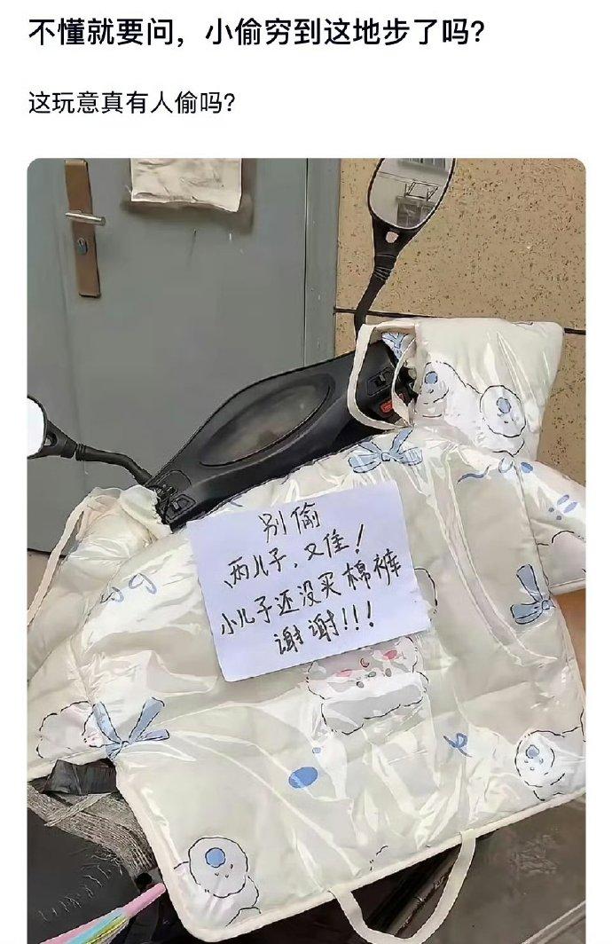 不懂就问,小偷都穷到这种地步了吗?这玩意真有人偷? 电动车挡风被上贴了张纸条,写着:“别偷,两儿子,又穷!小儿子还没买棉裤,谢谢!!!” 看完直接笑喷,这是把“卖惨”刻进了防盗里, 连几十块的挡风被都要靠卖惨求放过,这得是被偷怕了吧! 也不知道小偷看到这纸条,会不会心软放过, 毕竟谁能拒绝一个连小儿子棉裤都买不起的穷车主呢😂 你们见过最离谱的防盗操作是什么?评论区聊聊! 生活搞笑 电动车防盗 离谱操作 民生趣事