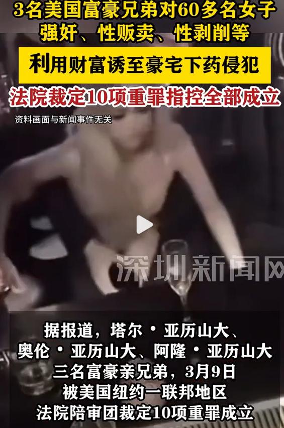 3名美国富豪强奸性侵60名女性,根据美国媒体的报道,这三名富豪是亲兄弟,年龄在38到39岁,他们被纽约当地的法院裁定10项重罪指控全部成立。   这三名以色列裔富豪分别是塔尔·亚历山大(39岁)、奥伦·亚历山大(38岁)和阿隆·亚历山大(38岁),他们不仅是手握巨额财富的房地产行业精英,更是长期盘踞在纽约奢华圈层的特权阶层。   当地时间3月9日,纽约曼哈顿联邦法院的陪审团经过五周庭审,连续念出19声“有罪”,将这三兄弟的10项重罪指控一一钉死,罪名涵盖强奸、性贩卖、对未成年人的性剥削等,每一项都足以让他们在铁窗内度过余生。   庭审过程中,这三兄弟的傲慢与嚣张令人发指,他们始终拒不认罪,甚至在庭上公然威胁出庭作证的受害者,全然不顾自己手上沾满的鲜血与泪水。   据超过60名女性的指控,这三兄弟多年来利用财富与人脉设下陷阱,以奢华生活、工作机会为诱饵,引诱女性前往其豪宅与私人场所,随后下药实施性侵,还暗中用影像记录罪行,手段卑劣到令人发指。   但就是这样一桩罪行累累的案件,放在美国富豪阶层的丑闻谱系里,却显得“不算什么”。很多人会下意识地拿它和爱泼斯坦案对比,一比之下,这三兄弟的恶行立刻就成了“小巫见大巫”。   爱泼斯坦案牵扯出的,是真正站在权力与财富金字塔顶端的顶级富豪,其丑陋面之深、影响之广,足以颠覆人们对美式精英阶层的认知。   2026年1月,美国司法部公开了爱泼斯坦案剩余的300多万页核心文件,这批档案犹如照妖镜,照出了一长串令人咋舌的名流名单。   美国前总统克林顿至少27次搭乘爱泼斯坦的私人飞机“洛丽塔快线”,英国国王查尔斯三世的弟弟安德鲁王子深陷其中,最终被迫剥夺尊号、搬离王室住所。   除此之外,美国商务部长霍华德·卢特尼克、前财政部长劳伦斯·萨默斯、内衣巨头“维多利亚的秘密”前老板莱斯利·韦克斯纳、科技大佬比尔·盖茨,甚至前白宫首席战略师班农,都在这份名单之列。   这些人不是普通的富豪,而是掌控着国家经济命脉、影响着全球政治走向的顶层精英,他们与爱泼斯坦的关联,早已超越了简单的“认识”,涉及私人岛屿的私密派对、政商勾结的利益输送,甚至是更不堪入目的性交易网络。   更让人震惊的是,爱泼斯坦案的罪恶持续了数十年,期间多次有受害者举报,却因背后的权力与金钱保护伞,始终被压了下去,直到海量文件解密,才让部分真相浮出水面。   反观这三名亚历山大三兄弟,他们的恶行固然不可饶恕,但从层级和影响力来看,确实远不及爱泼斯坦案中的顶级富豪。   他们的罪行更多是依托房地产行业的资源,局限在特定圈层,而爱泼斯坦案则是一张横跨政商、王室、科技界的巨大黑网,牵扯的都是能左右舆论、操控规则的大人物。   这也恰恰从侧面印证了一个令人心寒的事实:在美国富豪阶层,尤其是顶层精英群体中,道德沦丧早已不是个例,而是一种令人咋舌的普遍现象。   当财富积累到一定程度,当权力成为保护伞,一些人便会彻底抛弃法律与道德的约束,将他人的尊严与生命视为草芥,把罪恶包装在奢华的外衣之下。   爱泼斯坦案的丑闻,撕开了美式精英阶层虚伪的面具,让世人看到了美国顶级富豪背后鲜为人知的黑暗;而亚历山大三兄弟的定罪,不过是这黑暗面中又一个被曝光的角落。