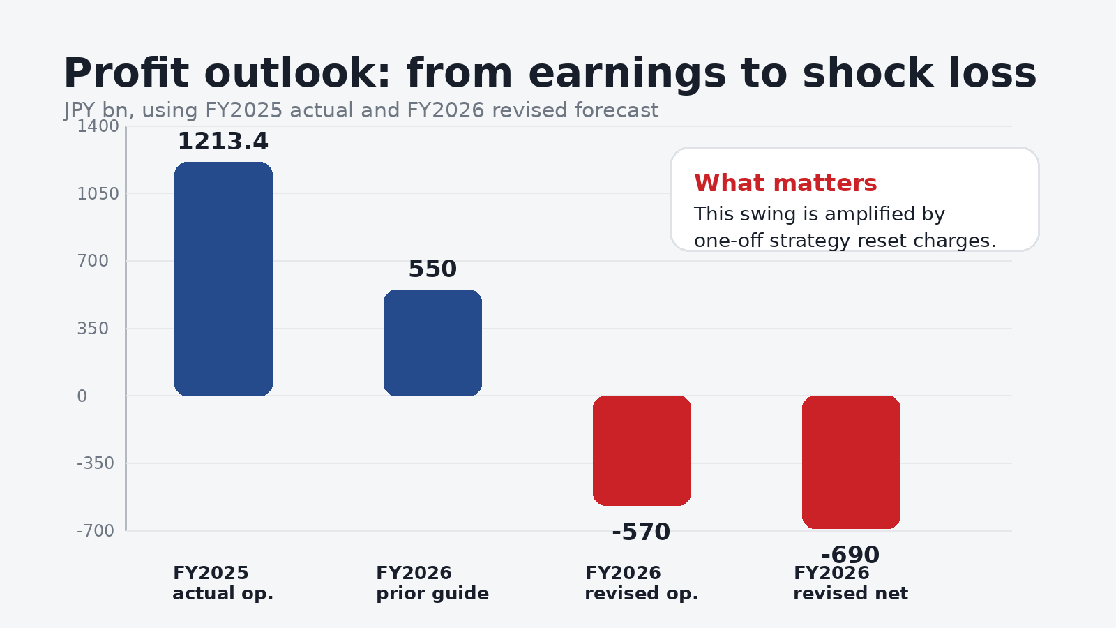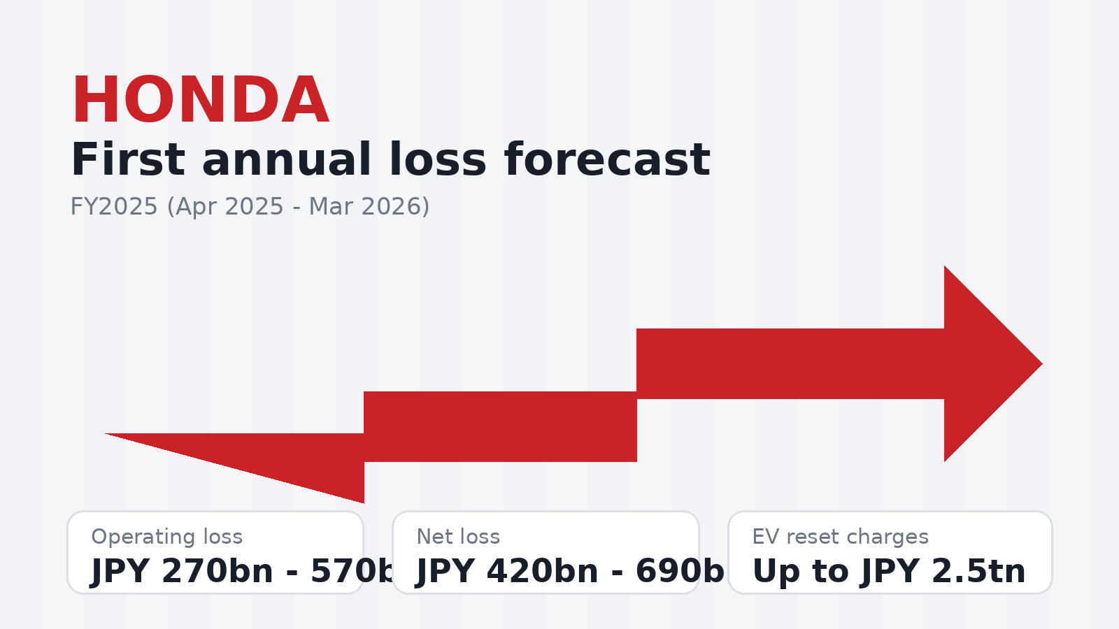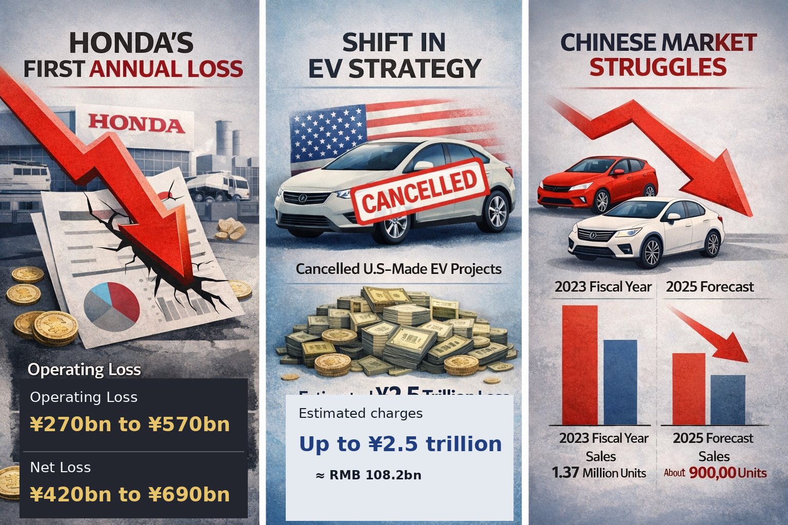 3月12日本田把截至2026年3月的财年预期,从原先的经营利润5500亿日元、净利润3000亿日元,直接修正为经营亏损2700亿至5700亿日元、净亏损4200亿至6900亿日元;同时披露,电动化战略调整相关的费用和损失,未来几个财年合计最高可到2.5万亿日元。这也被多家媒体解读为本田上市以来首次年度净亏损。 往历史里看,这个转折才更有冲击力。就在上一财年,也就是截至2025年3月的年度,本田还实现了21.69万亿日元营收、1.213万亿日元经营利润、8358亿日元净利润。换句话说,本田不是从一个持续亏损、现金干涸的状态掉下来的,而是从一家仍然有体量、有盈利基础的全球车企,突然切换到“主动止损”的模式。