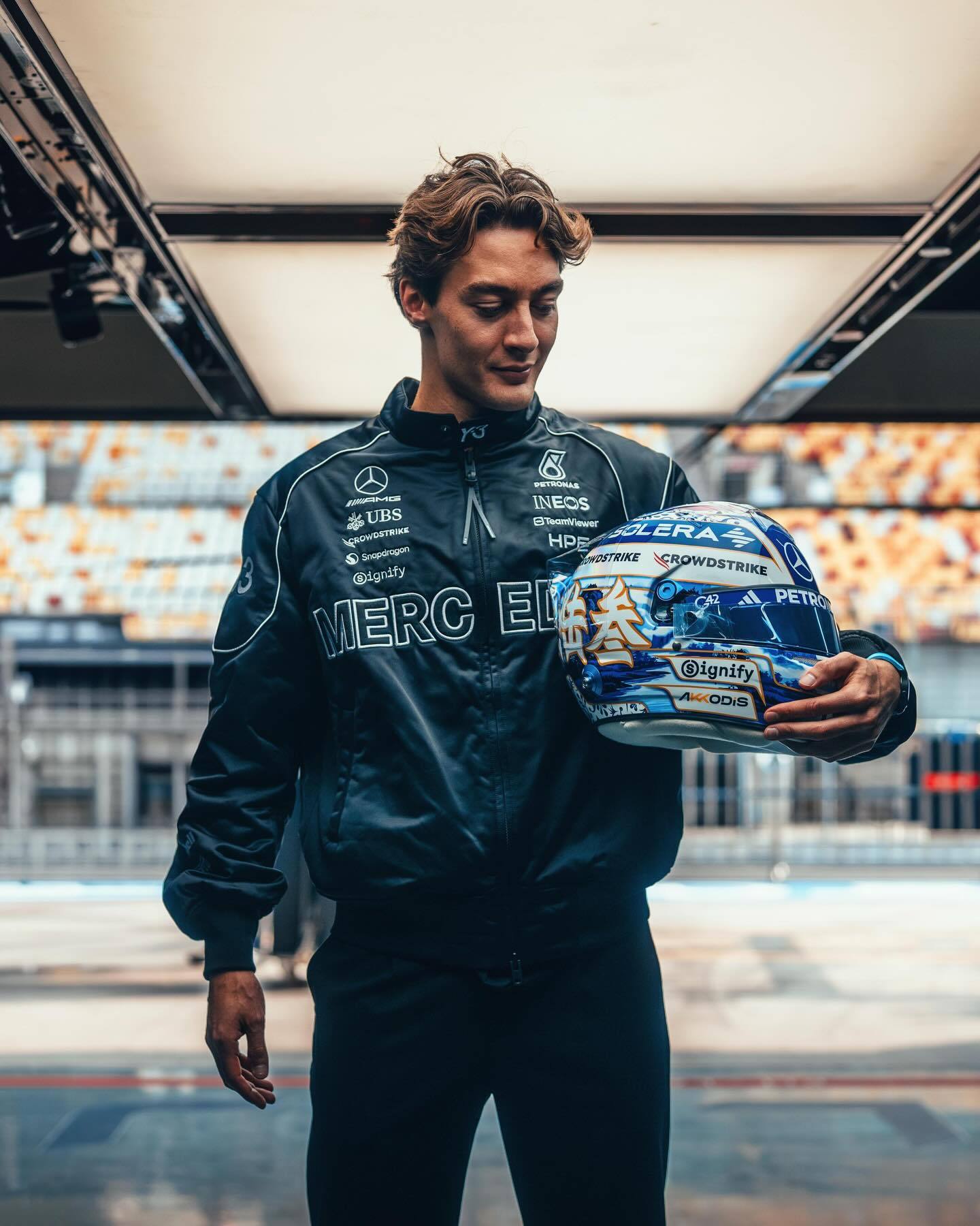 拉塞尔在昨天阿迪活动中说他中国站的特别版头盔因为中东那边物流的原因,可能会赶不上比赛,如果赶不上的话,他会分享图片;今天下午采访时他说有希望能赶得上,可能是今晚。