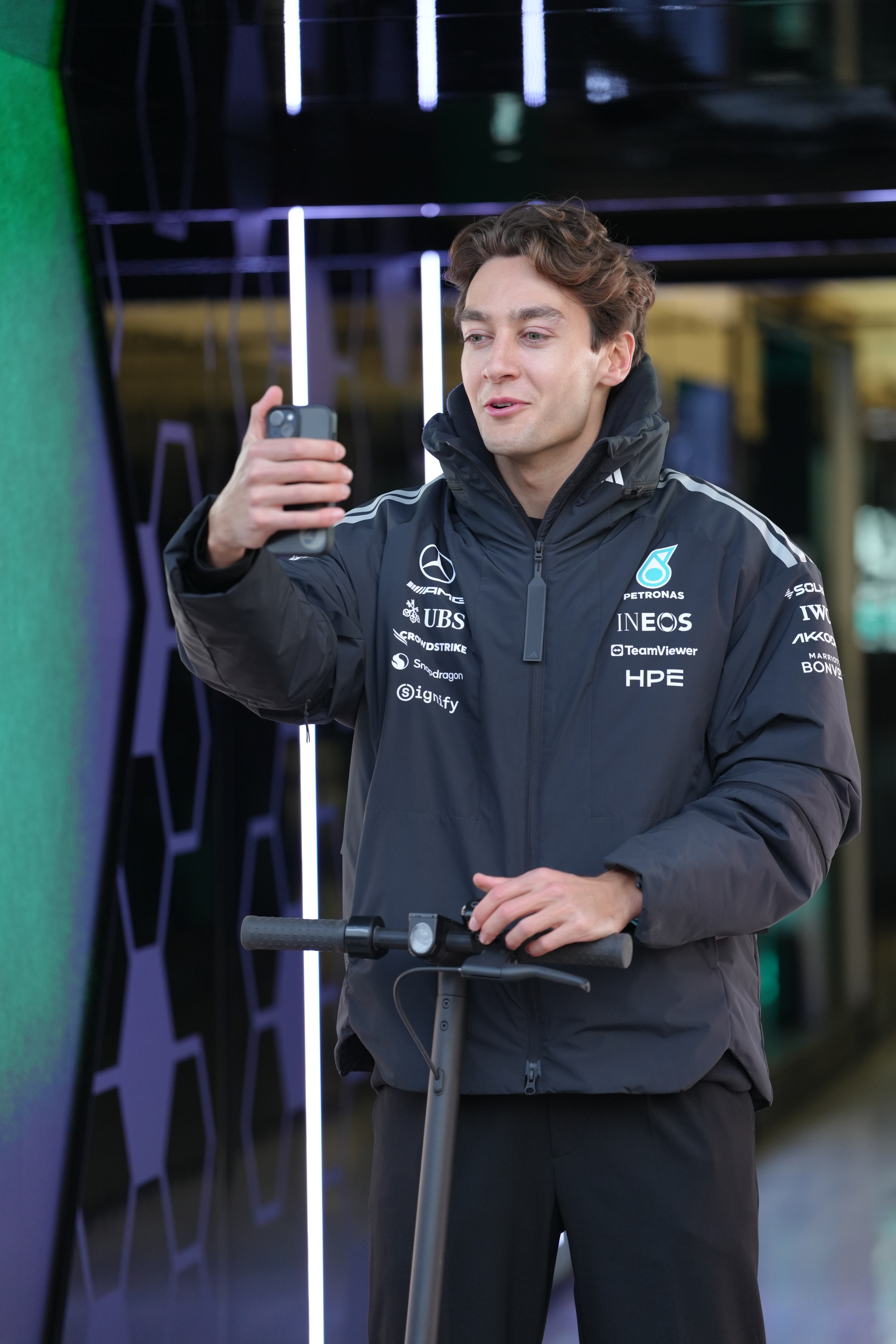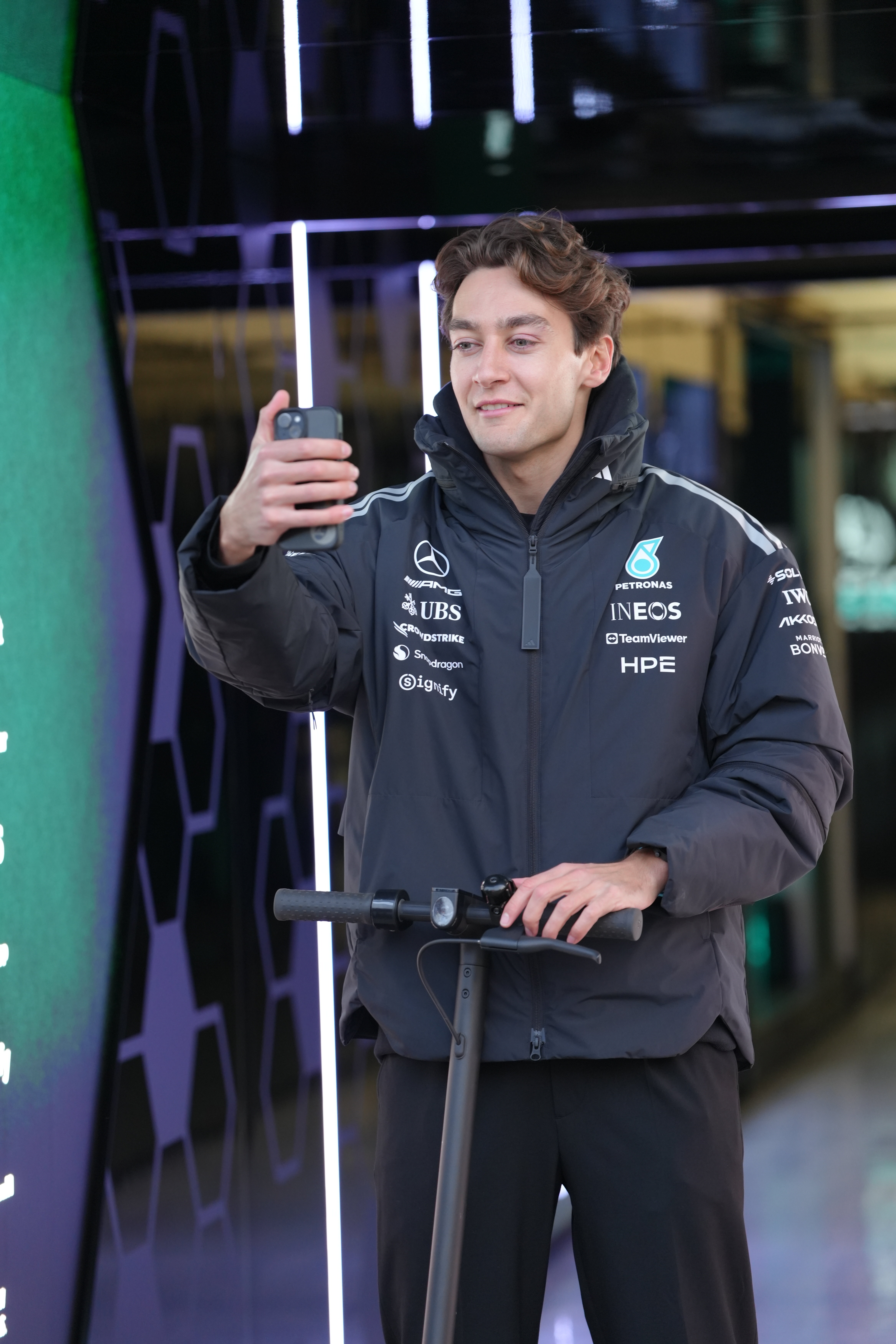 我的周四工作收工~很多车手和车队工作人员在17-18点左右就陆续离开围场了,在我走回媒体中心的路上,路过梅赛德斯后门时,正好遇见拉塞尔在拿着手机自拍营业视频🤳随后,他就骑着小滑板走了
