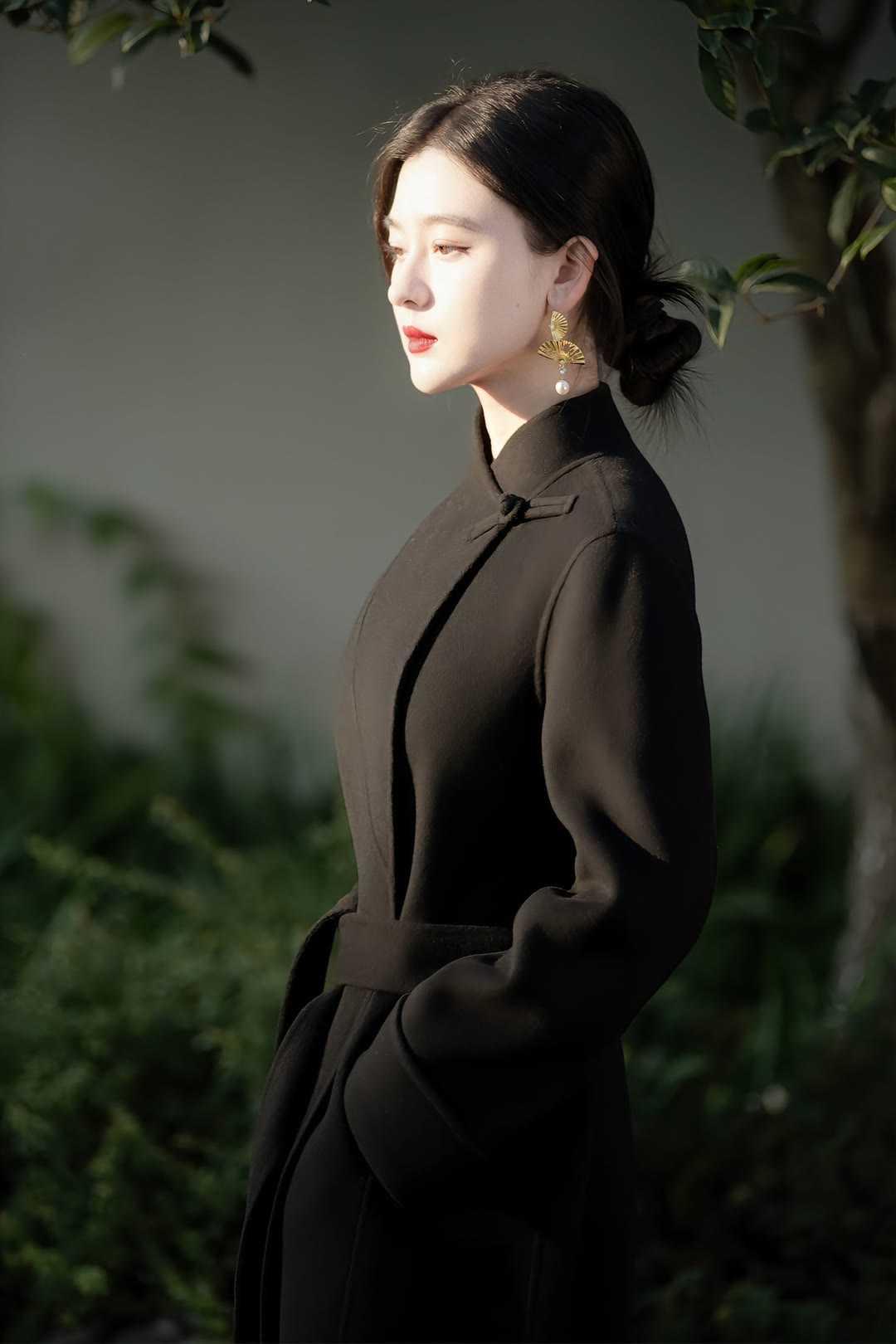 有没有简单又有范的女生穿搭一袭黑色新中式大衣,沉稳气场拉满。立领盘扣暗藏东方风骨,垂顺廓形包容身形,腰间系带勾勒利落腰线。黑金配色的扇形耳饰作点睛,于园林景致中尽显清冷贵气。这身穿搭主打“不费力的高级感”,简约中透着力量感,无论是都市通勤还是庭院漫步,都能穿出独属于你的从容与雅致。