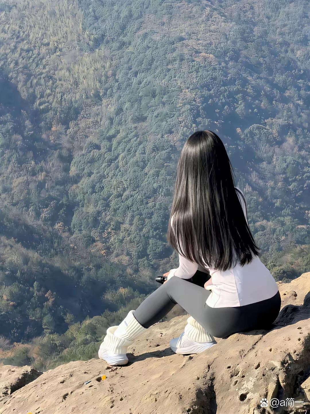 山间小木桥,少女倚栏杆,绿树环绕,风景如画。