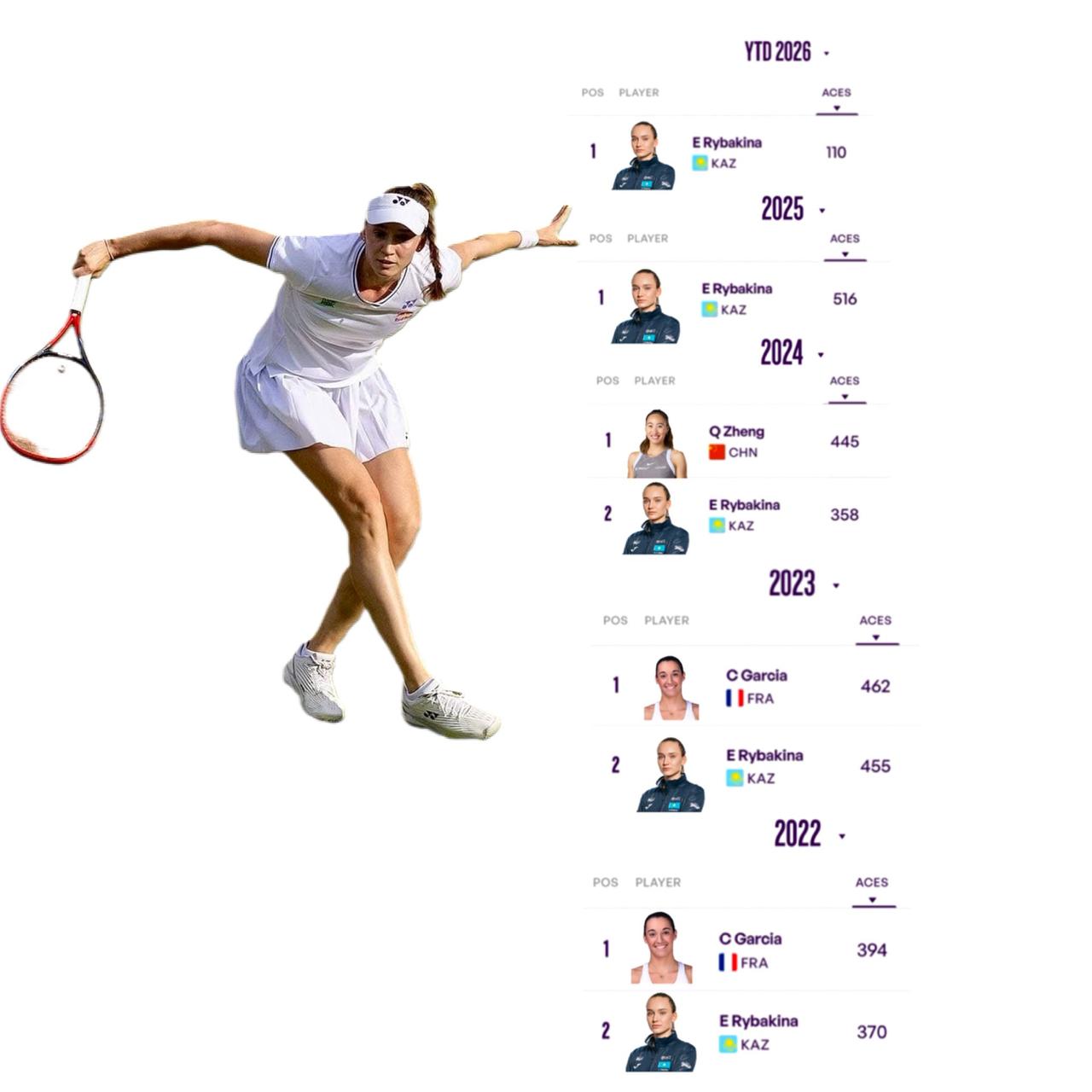 ACE女王-莱巴金娜。 本赛季莱巴金娜18场比赛已经有110记ace球。 排名WTA第一。 在过去的4年里,她ACE球排名从来没有掉出过前2名。 2025年以516个ace排名第一。 2024年以358个排名第二。 2023年455个排名第二。 2022年37个排名第二。 2022-23年排名第一的加西亚已经退役; 2024年排名第一的郑钦文发球始终难以稳定。 莱巴金娜以超乎寻常的稳定性, 发球成为了她获胜的最大保障。 本赛季,她的ace球会来到多少呢?