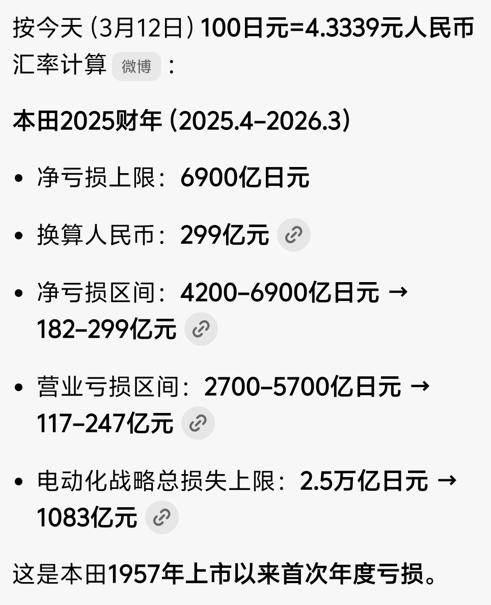 本田突发暴雷 本田2025财年最多将亏损6900亿日元!差不多299亿人民币,也不算多吧,还有下跌空间