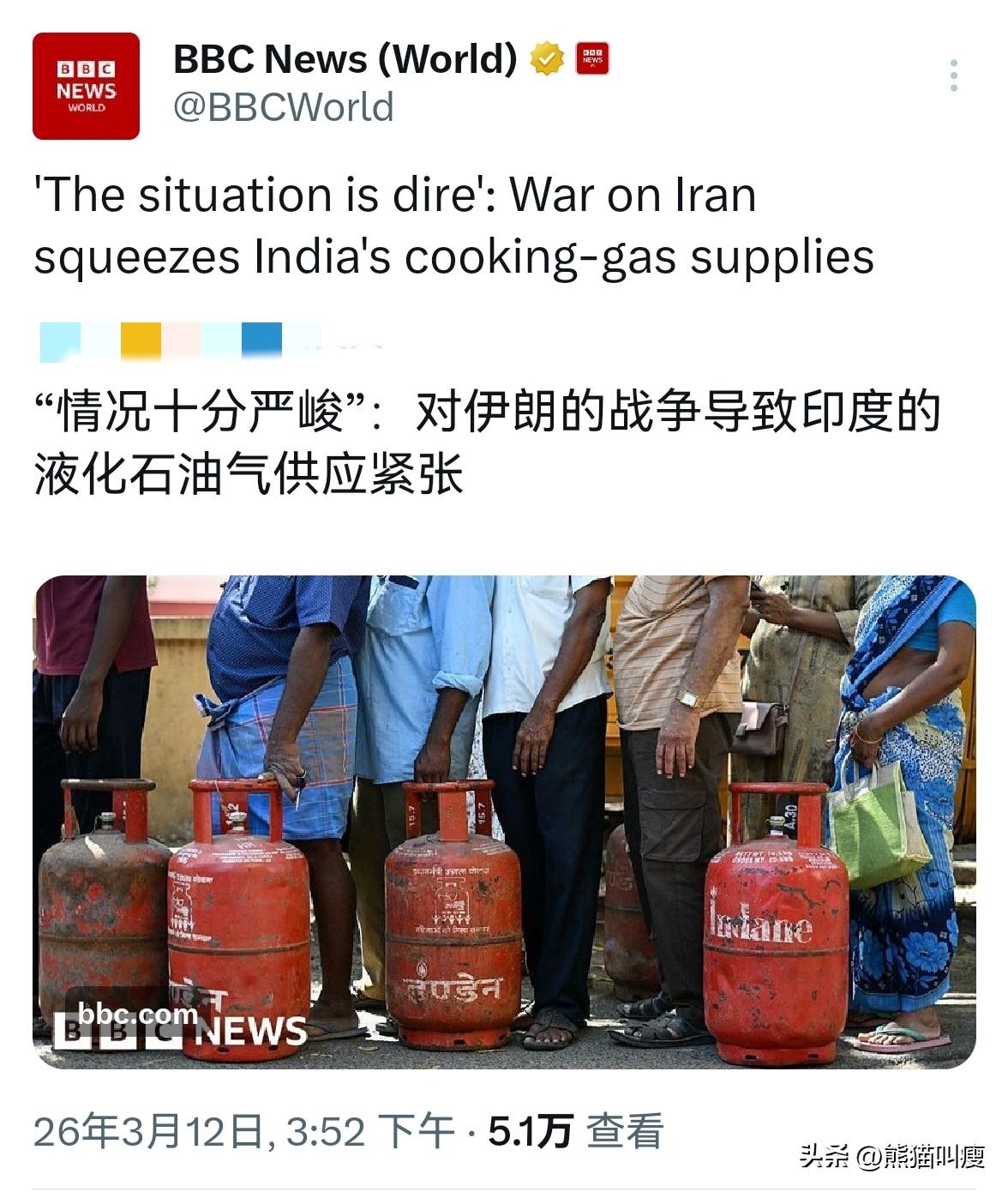 印度人这次搞不好要生吃米饭生吃面饼然后再生吃一口玛莎拉调味了。 截至 2026年3月12日,美国和以色列对伊朗的战争中,伊朗通过布水雷/导弹拦截,阻断了霍尔木兹海峡几乎所有货运。 ——可怜的印度有90%的进口液化石油气都经由该海峡从海湾国家获得。这么一断印度直接傻眼了: 因为几天前,印度下了个让自己跺脚的决定: - 优先供应3.3亿户家庭而非商业用户 - 炼油厂将国内液化石油气产量提高了25% 于是印度餐饮和酒店受到冲击:德里、孟买和班加罗尔等地出现多家餐厅/酒店关门(最多达20%),顾客排队吃不上饭,菜单也缩了。 于是才有了印度外长苏杰生赶紧打电话给伊朗的事件。