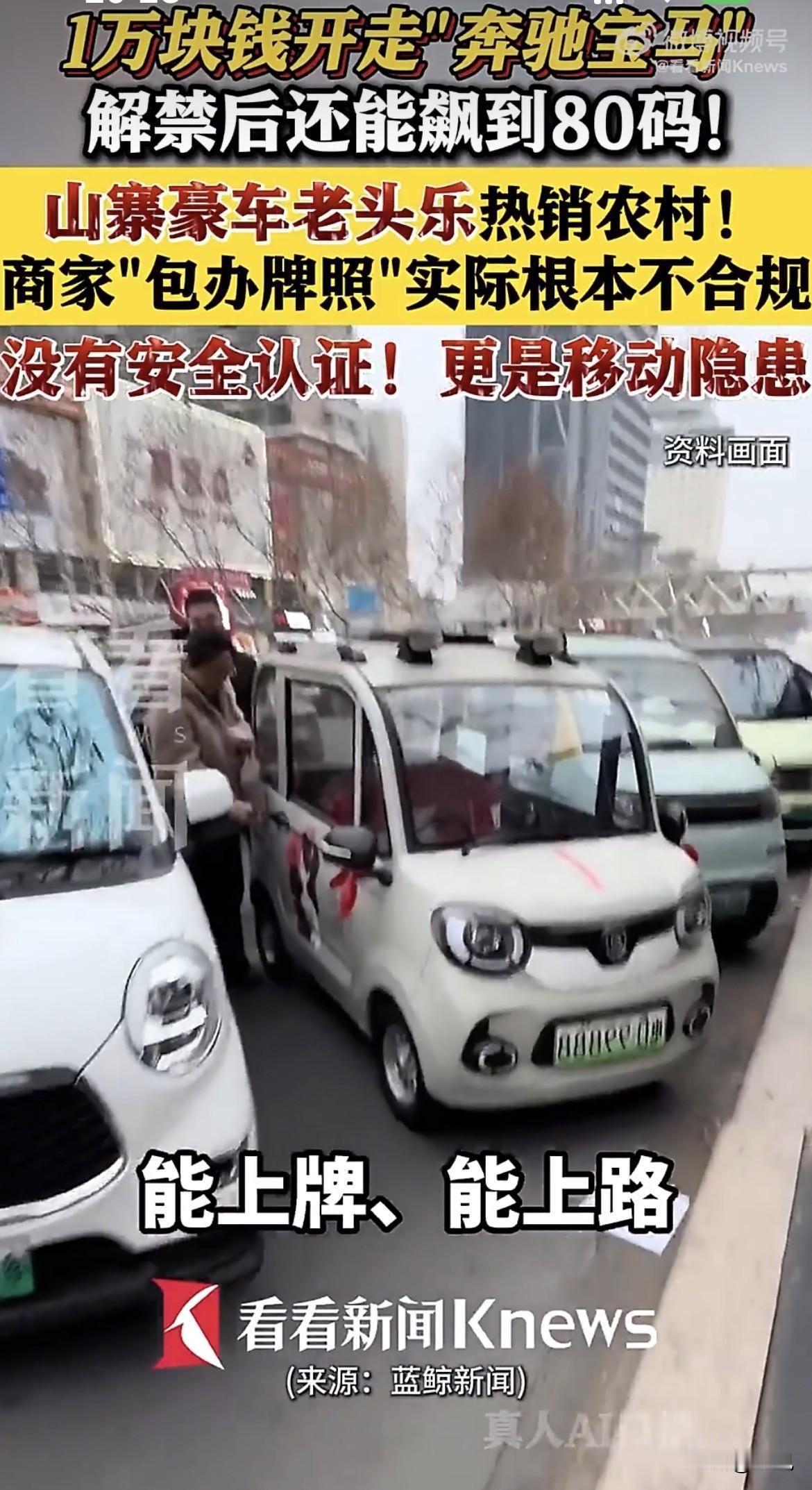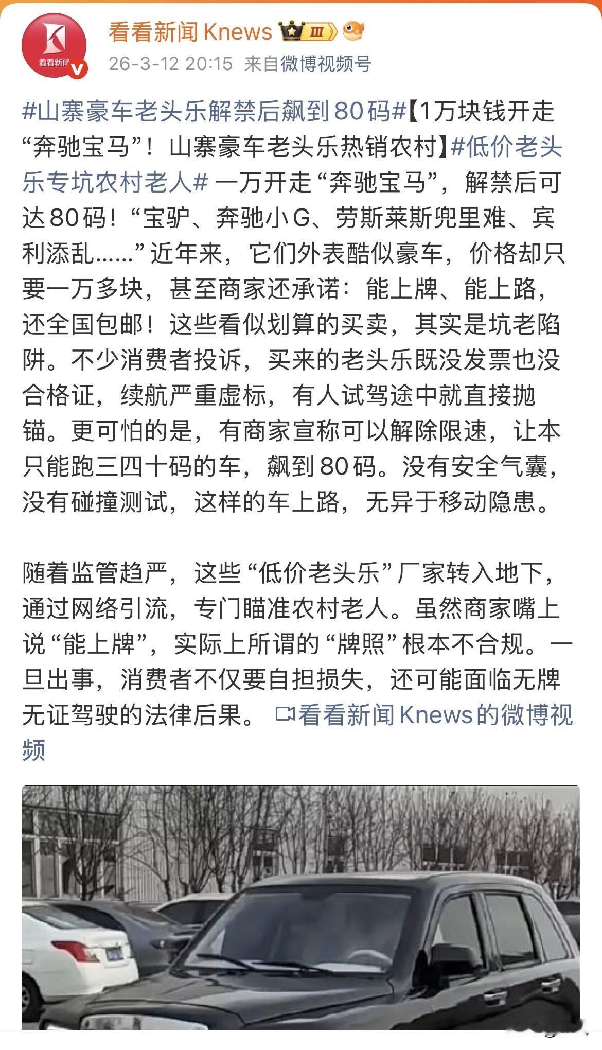 谁懂啊,一万二买的“奔驰”,开了三天成了废铁,厂家电话再也没打通过。 山东的老李蹲在院子门口,抽着烟盯着那辆趴窝的“大G”,后视镜上还挂着提车时销售送的红绸子。车头那个三叉星标志锃亮,可整个车壳子用手一按,忽悠忽悠的,跟按个塑料盆似的。 老李这事说起来简单。他在快手上刷到一个直播间,主播拍着车门喊“工厂直销,奔驰同款,一万二包邮到家,还送牌照”。老李动了心,想着接孙子放学不用再骑三轮挨冻,咬咬牙转了账。 车到那天他特意去镇上接,开出不到二里地,在一个小坡上直接熄火,往后出溜差点溜沟里。推回家才发现,说好的200安时大电池,铭牌上写的是“200型”,一字之差,续航从一百里变成了三十里。 找销售,销售拉黑。找平台,平台说私下转账管不了。老李这事最后不了了之,车还在院里扔着,下雨天拿塑料布盖着。 这类事现在不是个例。蓝鲸记者在黑猫投诉上搜“老头乐”,出来上百条,全是质量差、续航虚标、没售后的投诉。有人的车五天抛锚四次,开着开着路上断电熄火。 这些商家到底怎么操作的?南方周末记者去山东德州武城县实地看过。那个地方聚集了大量低速电动车小作坊,国道沿线到处都是做车身冲压件、车玻璃、电池的,随便拍照就能开模具,一辆“保时捷”就这么攒出来了。 直播间里卖车的,根本不藏着掖着,直接喊“奔驰大G”“宝马X5”“保时捷卡宴”,价格八千到两万不等。有商家甚至说,要是同意在车屁股上贴两年广告,还能再便宜几千块。 最坑的是上路这事。商家拍着胸脯说“能上牌、能上路”,其实给的所谓“牌照”就是块假铁皮。真有商家私下提醒记者,这是低速电动四轮车,上不了正规牌,“管得不严就没事,管得严就别买,自己考虑清楚”。 那这些车到底是什么来头?律师解释得很清楚,厂家在工信部申报的是“厂区代步车”,理论上只能在景区、园区、厂区这种封闭区域开,根本不能上公共道路。商家宣传不用驾照、不用上牌、不用保险,属于违法行为。 更吓人的是解限速。本来出厂限速三四十码,商家说可以调到八十码。央广网报道过,有些大号老头乐配了7000瓦电机,最高能跑到七十码。一个连安全气囊都没有的铁架子,刹车软绵绵的,跑到这个速度,那就是个移动的炸药包。 河北张家口出过事。一个59岁的男人开着无牌老头乐,喝醉了酒,把一个过马路的女士撞死了。家属不光要起诉肇事者,还打算起诉交管部门,说那地方老出事,连个红绿灯都没有。 那这事到底谁管?宝鸡市市场监管局一份答复里说得很明白:国家至今没明确老头乐算不算机动车,缺产品标准、缺生产准入、缺销售维保、缺挂牌登记、缺驾驶资质,想管都没法可依。诸城市那边也一样,只能先卡着不让新注册这类企业,等国家政策。 中国政法大学朱巍教授分析,现在的问题是两头缺失:开车的没驾照,上路的车没安全认证。市面上多数老头乐既没过3C认证,也不够机动车安全标准,还不算非机动车,就这么悬着。 可话说回来,农村老人确实有需求。冬天冷,三轮漏风,公共交通到不了村,花一万多买个能遮风挡雨的小车,对他们来说是刚需。专家卢勇也说,不能一禁了之,得承认这种需求存在。 有些地方已经在试着找平衡。河南辉县、范县给符合一定标准的车发标识牌、上保险;重庆云阳搞信息采集赋码;四川德阳让非标车备案挂临时牌,能用到2028年。这些办法,算是在“禁”和“放”之间找了个缝。 可像老李那样从网上买的,啥标准也够不上。没发票没合格证,厂家连个正经地址都没有,维权?门都没有。 那些直播间还在播,新的话术一套一套的,瞄准的还是农村老人。老李那辆“奔驰”还在院里扔着,他儿子说等天暖和了当废铁卖了。一万二,打了水漂。 你怎么看这事?该禁还是该放?你身边有老人买过这种车吗? 综合来源: 央广网 、宝鸡市市场监督管理局 、腾讯新闻·蓝鲸记者调查 、诸城市人民政府 、中国网 、经济日报/中国新闻网 、南方周末