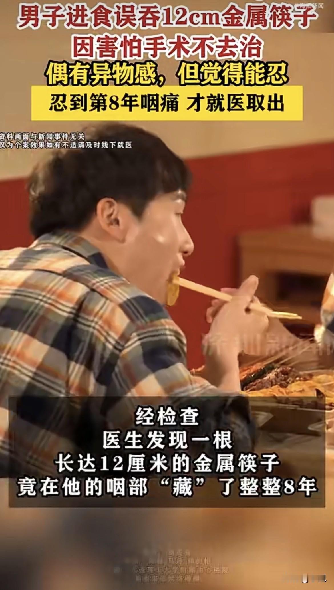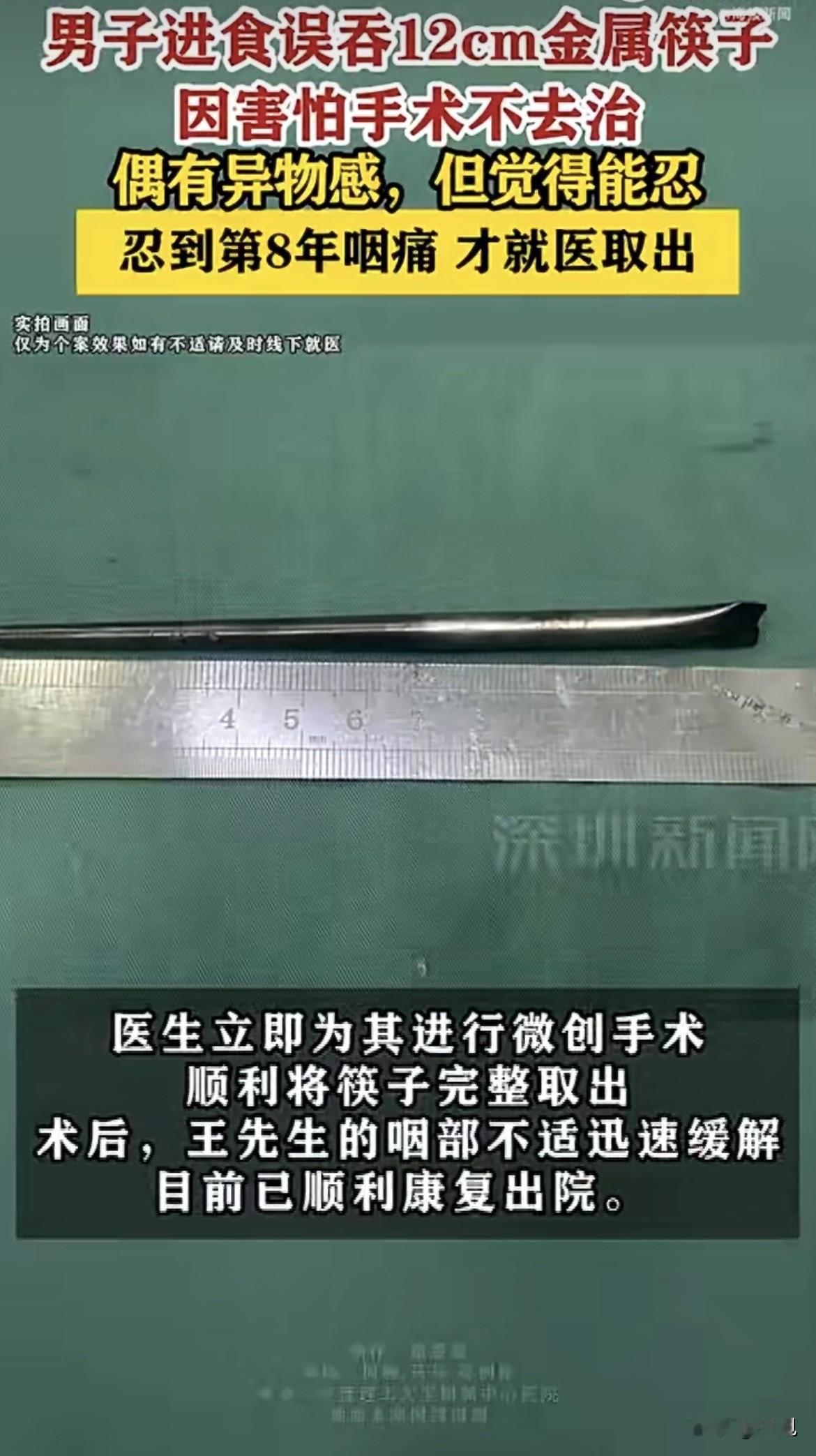 大连一位大哥,喉咙里住着一根12厘米长的金属筷子,整整八年。要不是这次疼得受不了去医院,这筷子还不知道要在嗓子眼里住到啥时候。 46岁的王先生这次去医院,是因为咽部突然疼得厉害,有异物感。医生一检查,发现他右侧咽后壁的软组织里,竟然插着一根筷子,筷子头都露出来3厘米,随时可能扎穿喉咙。片子一出来,医生都倒吸一口凉气。 可王先生自己反倒挺平静。他说这筷子在嗓子眼里已经待了8年。8年前他吃饭时不小心吞下去的,当时喉咙就疼,去医院一看,医生说要做手术,脖子上得拉一刀。他一听就怕了,想着也许过几天自己就好了,硬是忍着疼回了家。 这一忍就是8年。说来也怪,这筷子居然跟他“和平共处”了这么久。平时偶尔喉咙不舒服、有点异物感,他都当是喝酒喝多了的正常反应,压根没往8年前那档子事儿上想。谁能把嗓子不舒服跟筷子联系到一块儿? 直到这次,早上起来喉咙突然钻心地疼,咽口唾沫都跟上刑一样。实在扛不住了,才又来医院。医生一听他8年前吞过筷子,赶紧安排拍片子。结果出来,连医生都觉得不可思议——这么多年,周围的黏膜居然没破也没发炎。 但这真的是运气好这么简单吗? 医生说,筷子在咽部软组织里待了8年,之所以没出大事,是因为人体对异物有一种特殊的“包容机制”。异物刺入组织后,身体会启动炎症反应,逐渐形成纤维组织包裹异物,让它相对固定,不再随着吞咽动作大幅移动。这种包裹反而成了一种保护,避免了筷子刺穿大血管或食管。 但医生说,这纯属侥幸。食管里卡了这种又尖又长的异物,就像在身上绑了个定时炸弹。时间长了,随时可能刺穿食管、喉咙,甚至扎到大血管上,那真是神仙难救。现在筷子头都露出来了,情况已经很危险。 考虑到王先生当年就是怕开刀才拖到现在,医生这次专门给他设计了微创手术,不用切开脖子,直接从嘴里取。手术很顺利,一根完整的不锈钢筷子被取了出来,王先生和家属悬着的心才算落地。 这事听着离奇,但仔细想想,最让人想不通的是——一个人怎么能容忍身体里有根筷子,整整8年? 医生说,很多人对身体的异常信号都有一种神奇的“适应能力”。刚开始肯定难受,但时间长了,身体会慢慢习惯这种感觉,大脑也会把这种不适感“调低音量”,最后就变成了背景噪音。王先生平时爱喝两口,偶尔喉咙不舒服,他都当成是喝酒后的正常反应。 这种心理在医学上有个词,叫“疾病否认”。面对身体发出的警报,有人选择忽视,有人选择合理化解释,就是不愿意承认问题的严重性。因为一旦承认,就意味着要面对治疗,要挨刀,要花钱,要耽误工作。拖着,反而成了一种心理保护。 但问题是,身体里的异物不会因为你习惯了就变安全。它一直在那儿,风险一直在累积。王先生这回运气好,平安取出来了。但谁能保证每次都这么幸运?医生说,筷子在软组织里待了8年,要是再偏一点点,或者再拖一段时间,后果真不敢想。 像王先生这样的“狠人”还真不是个例。安徽有位杨大爷更夸张,12岁时误吞了一根牙刷,因为怕父母责备不敢说,结果牙刷在肚子里待了52年!直到64岁因胸口不适去医院检查,才发现牙刷斜插在十二指肠里,刷柄末端距离肠壁只有几毫米。黑龙江还有位张先生,胃里藏着两把牙刷,整整27年,因为长期胃疼去医院检查才发现。 这些人都有一个共同点——当时因为害怕、侥幸、嫌麻烦,选择了逃避。结果一逃就是几年、几十年,把一个小隐患拖成了大风险。 王先生的筷子取出来了,但这事留给人的思考远没结束。身体里多了不该有的东西,当时怕挨那一刀,结果这8年,哪天真要出点事儿,那一刀可能都救不回来。王先生这回算是给大伙儿提了个醒,不舒服就得看,拖来拖去,拖的还是自己的命。 看完这事儿,你还敢把身体的小毛病不当回事儿吗?评论区聊聊,你身边有没有这样的“狠人”? 综合来源:大连理工大学附属中心医院、人民网健康、新京报、红网、澎湃新闻等