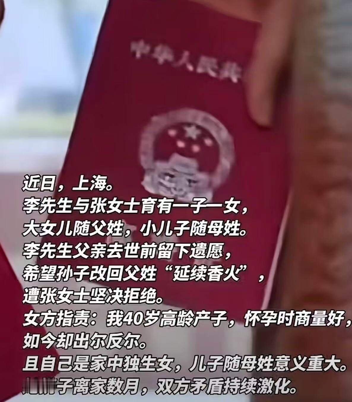 上海,男子父亲离世时留下遗言,要孙子改回父姓“延续香火”!男子想要完成父亲的遗愿,跟妻子商量,妻子却说:“生儿子的时候我差点丢了半条命,你答应两个孩子一个随父姓一个随母姓,怎么能出尔反尔?”男子:“不改就离婚!” 这桩关于“香火延续”的家庭纠葛正引发无数网友热议和情感共鸣。父亲临终前的遗言犹如一道无形的枷锁,紧紧缠绕着这家人的未来,也让我们看到了传统观念与现代婚姻价值观的激烈碰撞。 故事的主人公是一位普通男子,父亲去世前恳切嘱托他,希望孙子能够改回父姓,以此延续家族的香火。这句话看似简单,却承载着千百年来的文化积淀和情感传承。然而,当男子满怀敬意地将这份遗愿告诉妻子时,却遭遇了意料之外的拒绝。 妻子的一番话,戳中了许多人的心:“生儿子的时候我差点丢了半条命,你答应两个孩子一个随父姓一个随母姓,怎么能出尔反尔?”她的坚决,不仅是对自身付出的抗争,更是对婚姻承诺的守护。两个孩子姓氏的安排,曾是夫妻间达成的默契,象征着双方的平等与尊重。如今丈夫单方面要求改变,犹如在撕裂这层脆弱的平衡。 男子的态度也让人震惊:“不改就离婚!”这句看似决绝的话语,背后是传统观念的坚守与现代婚姻冲突的激烈碰撞。父亲的遗愿成了压倒骆驼的最后一根稻草,男人希望履行孝道,却忽略了妻子在这场情感争执中的感受和尊严。 这件事让我们不得不深思:在现代社会,传统的“香火观念”还能走多远?家庭成员间的尊重与沟通为何如此脆弱?当孝顺与爱妻、责任与自由产生冲突,我们该如何找到那条平衡的细线? 更让人揪心的是,这场纷争不仅是姓氏的争夺,更是两个家庭价值观的碰撞。谁能真正理解妻子生育时的艰辛?谁又能完全接受父亲去世后那沉甸甸的期待?这场情感拉锯战,既是对“家”的定义的拷问,也是对现代婚姻观念的一次挑战。 你是否也遇到过类似的家庭矛盾?面对父辈遗愿和伴侣权益,你会如何抉择?欢迎在评论区分享你的故事和观点,让我们一起探讨,在传统与现代交织的家庭里,如何守护爱与尊重的底线。毕竟,每个家庭,都值得被温柔以待。临终财产继承 家庭立遗嘱 母亲的遗嘱继承 父母立遗嘱 儿子立遗嘱 爷爷遗嘱 母亲临终遗愿