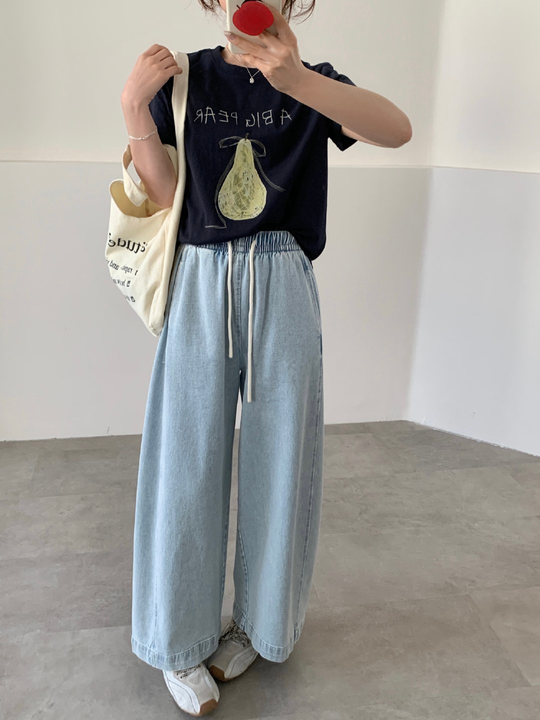 直筒裤型,自然垂坠,悄悄修饰腿型,假胯宽、大腿粗都能藏住。