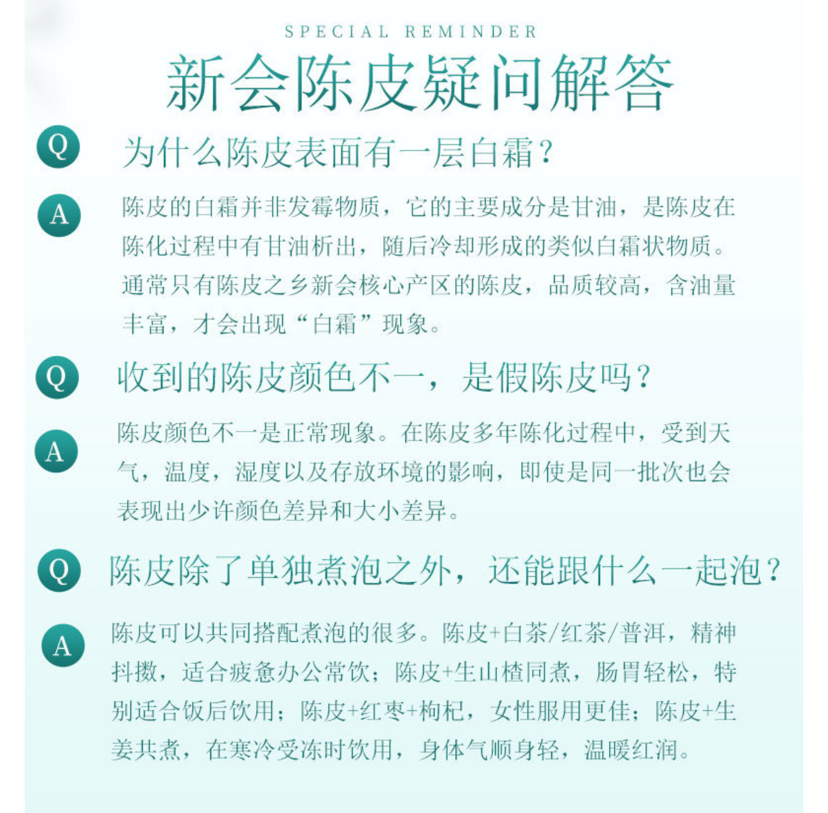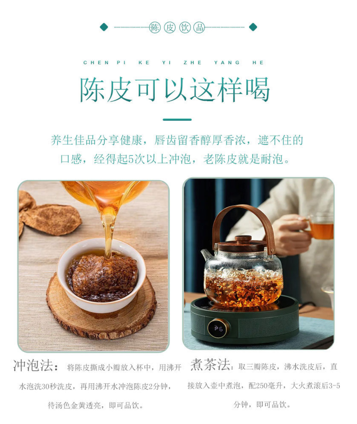 3年陈陈皮清甜果香浓郁,润肺去燥;5年陈陈香渐显,理气健脾更胜;10年陈醇厚绵长,药用食养价值更高,越陈越香、越陈越珍贵。